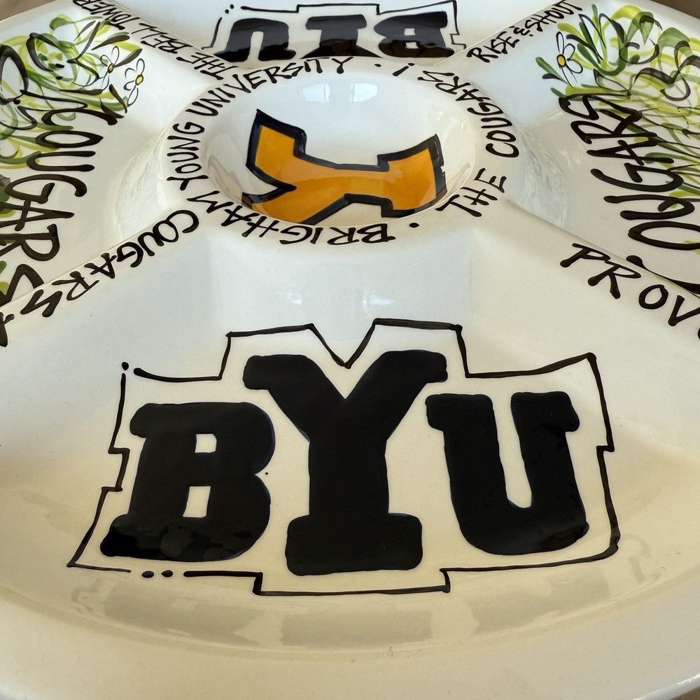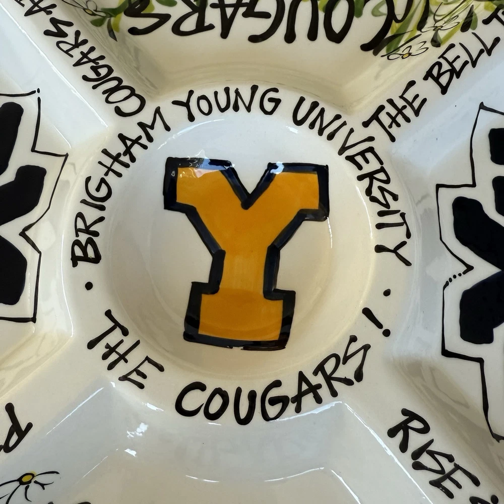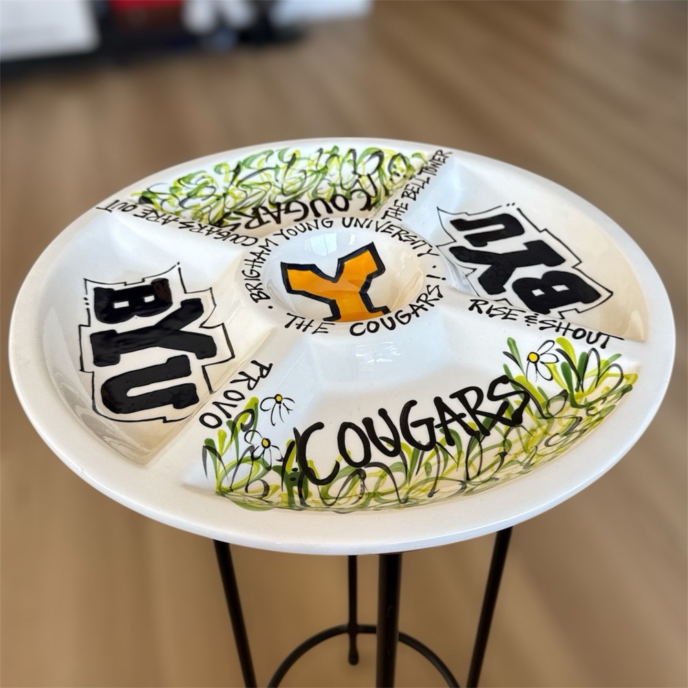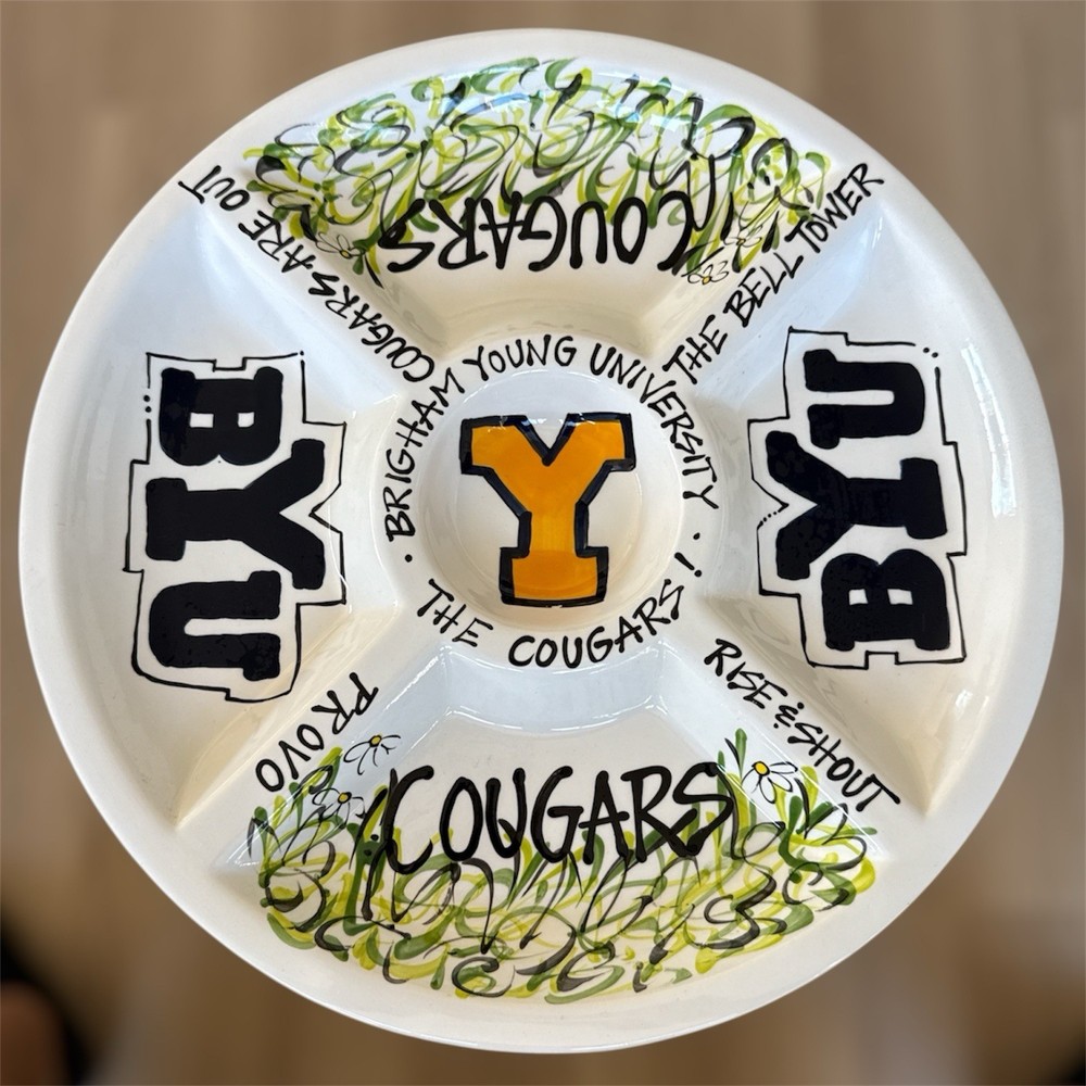 Show your love for the BYU Cougars with this amazing chips and dip platter from T Cabells Too. Featuring beautiful Magnolia Lane design, this platter is perfect for any football fan. The platter is of large size and is made of high-quality material, ensuring its durability for years to come. The white color of the platter perfectly complements the team's colors, making it a great addition to any fan's collection. Get your hands on this unique piece of fan memorabilia today! Perfect for tailgating and game day. For byu Brigham youn university cougars fan. Excellent condition.