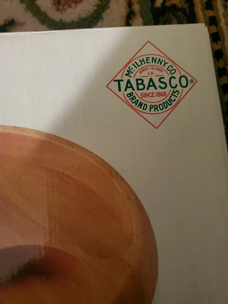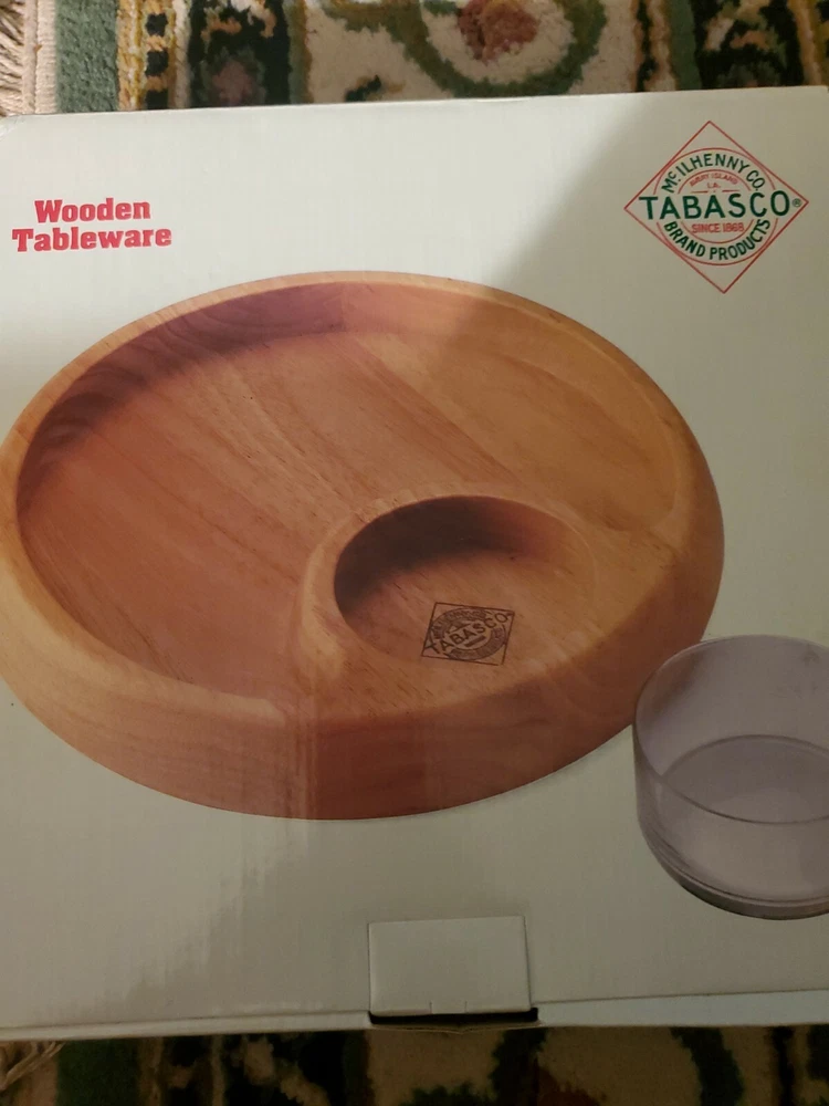 This Tabasco brand wooden serving platter is perfect for your next party or gathering. With two compartments, it's ideal for holding chips and dips. The large size and round shape make it a striking addition to any table setting. The beige color and art theme add a touch of elegance to your serving routine. Crafted from high-quality wood, this tray is durable and long-lasting. It's perfect for entertaining guests or for use in your everyday kitchen. Whether you're hosting a dinner party or serving snacks to your family, this Tabasco wooden serving platter is sure to impress.