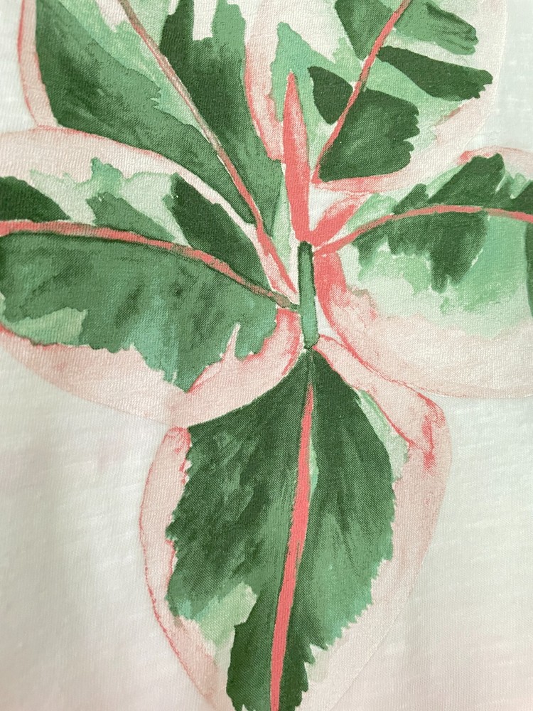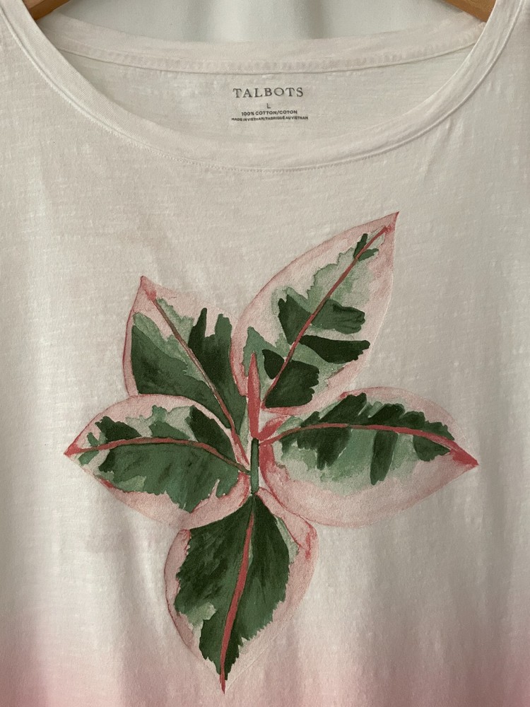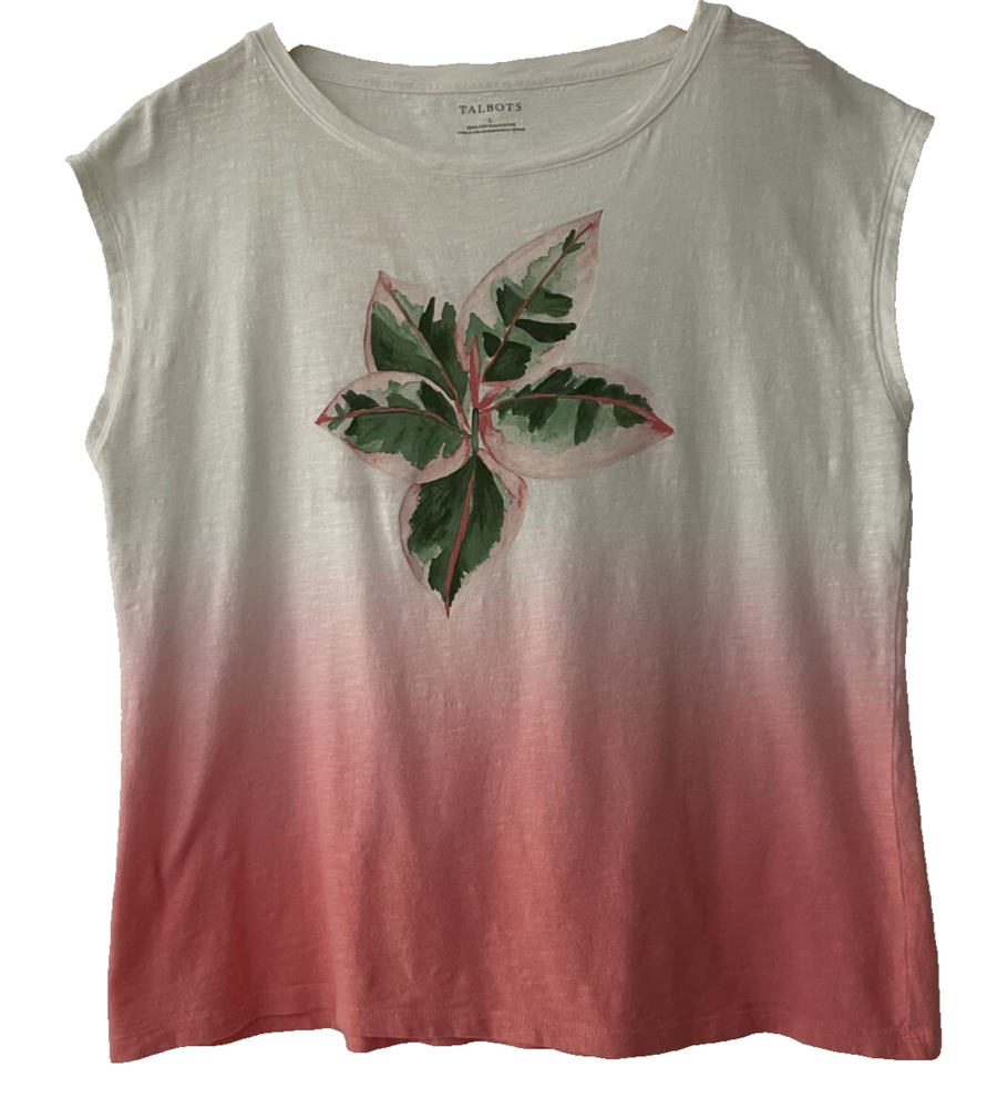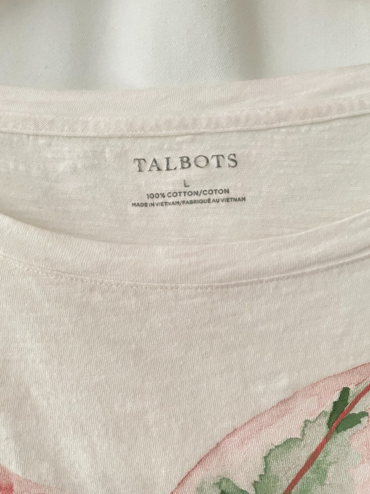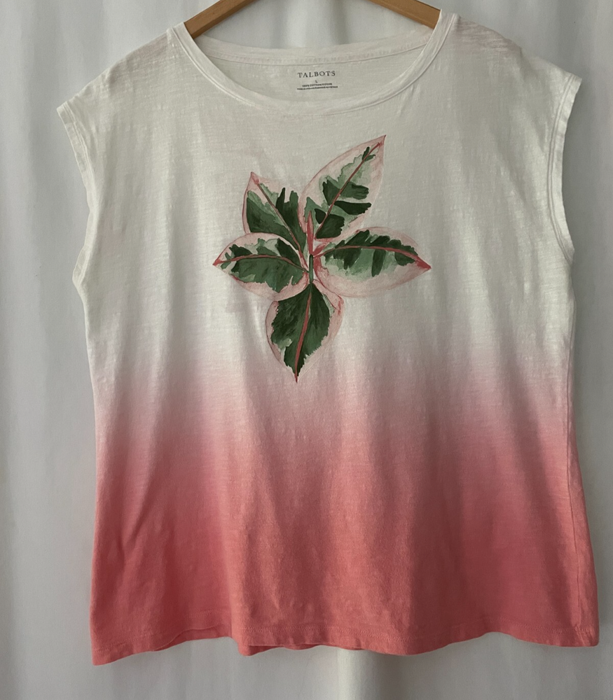 TALBOTS size large true to size tropical plant tee dip dyes 100% cotton machine wash bust measures 42" length from back neck to hem is 25" shows some wash wear, but a pretty groovy tee for casual wear feel free to ask questions smoke free & cat free home