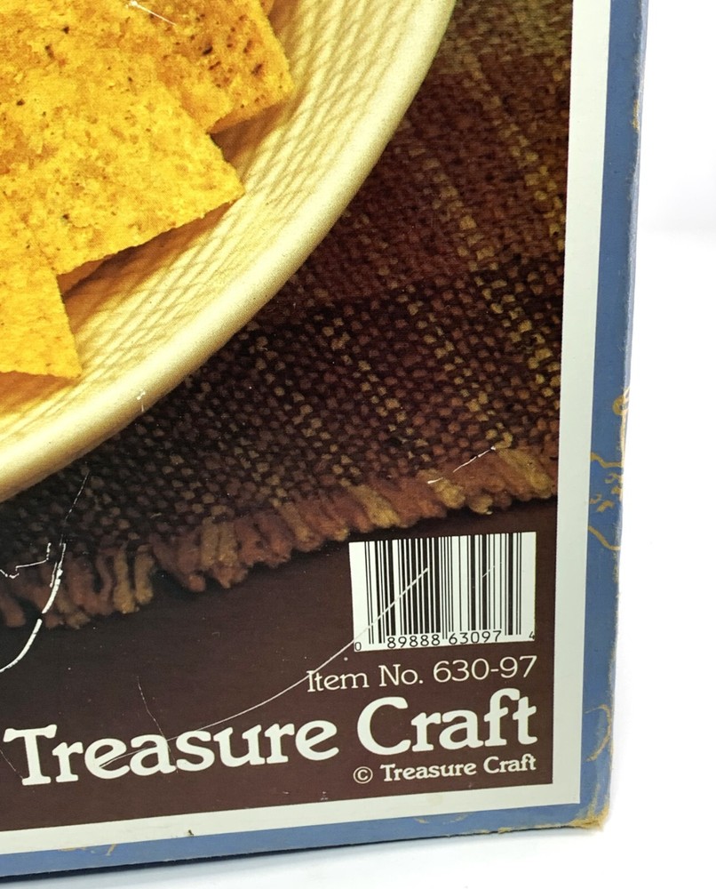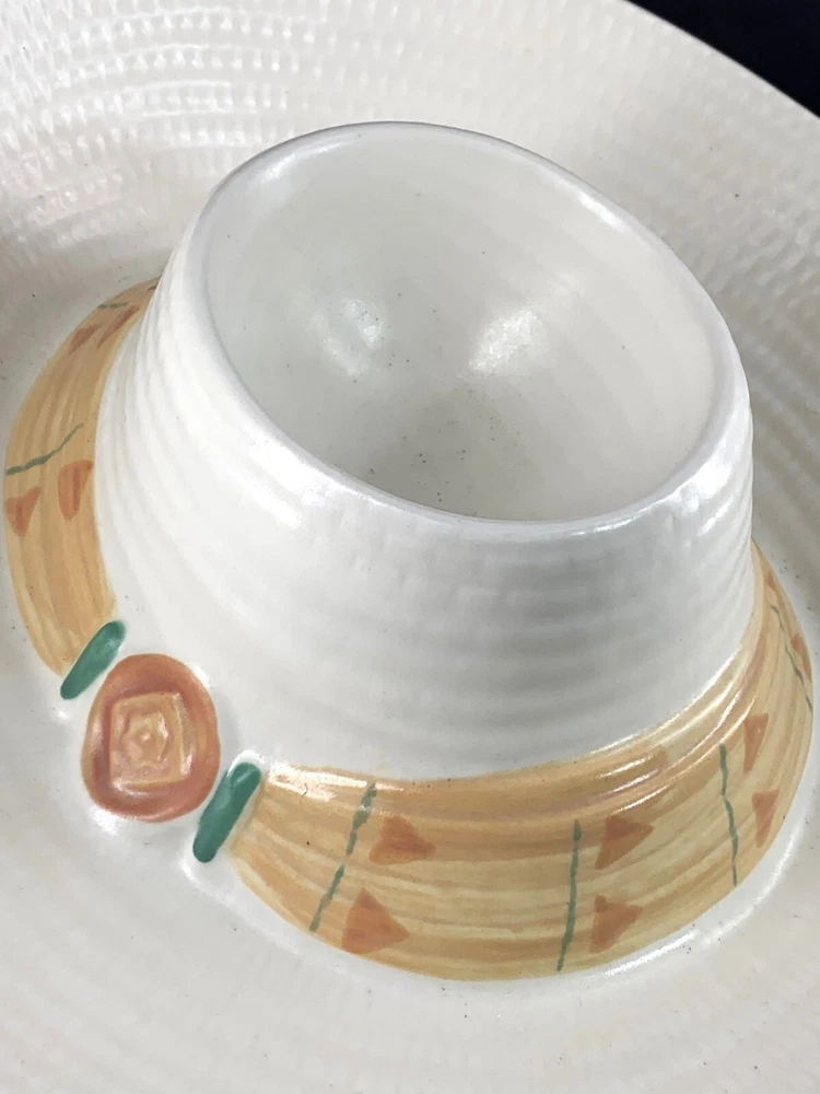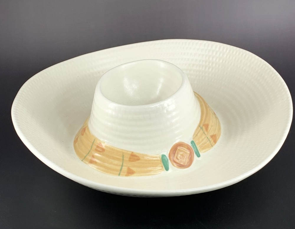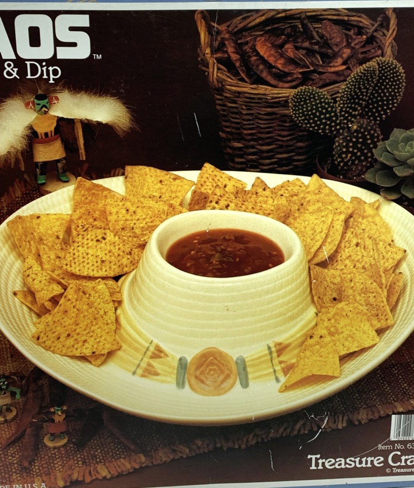 Vintage Treasure Craft TAOS Sombrero Chip and Dip Serving Dish Heavy ceramic dish with attached deep bowl for dip Sombrero shape with pastel southwestern colors 14" x 14" x 4.5" Comes with original box, which shows wear Fun serving dish for your favorite snacks