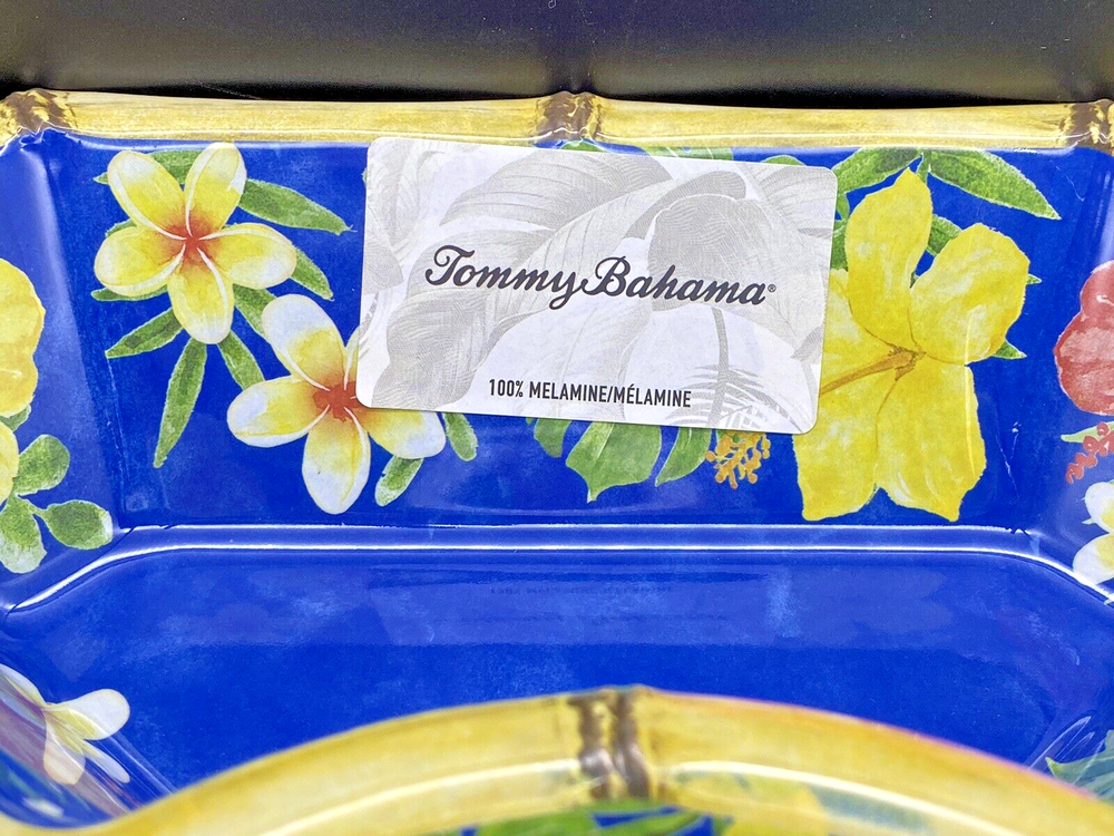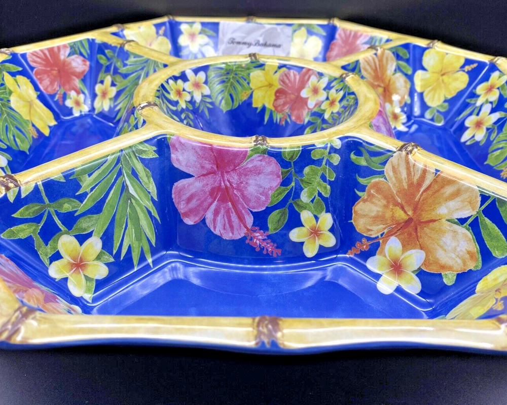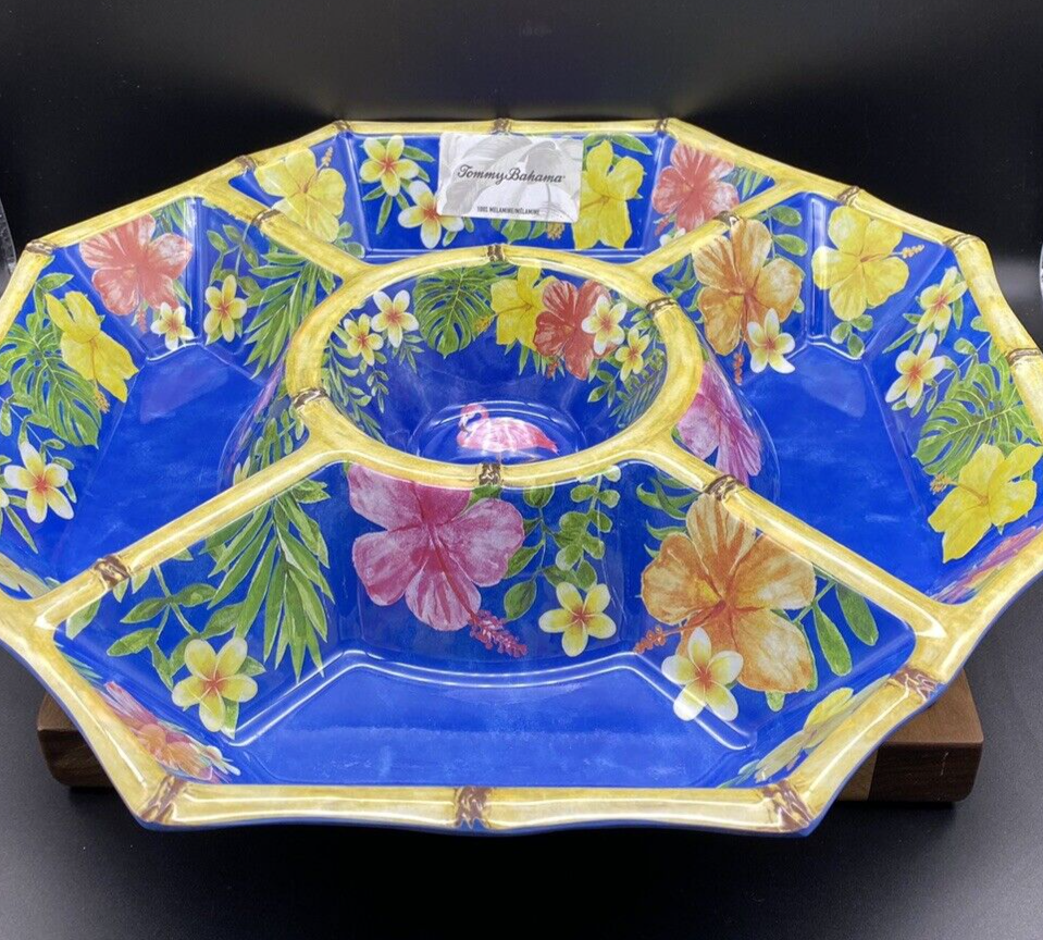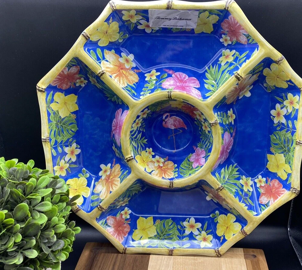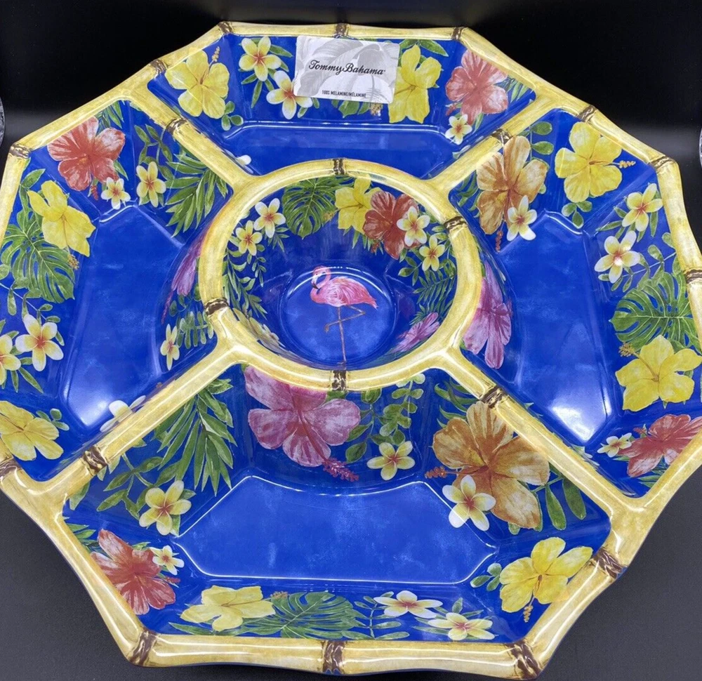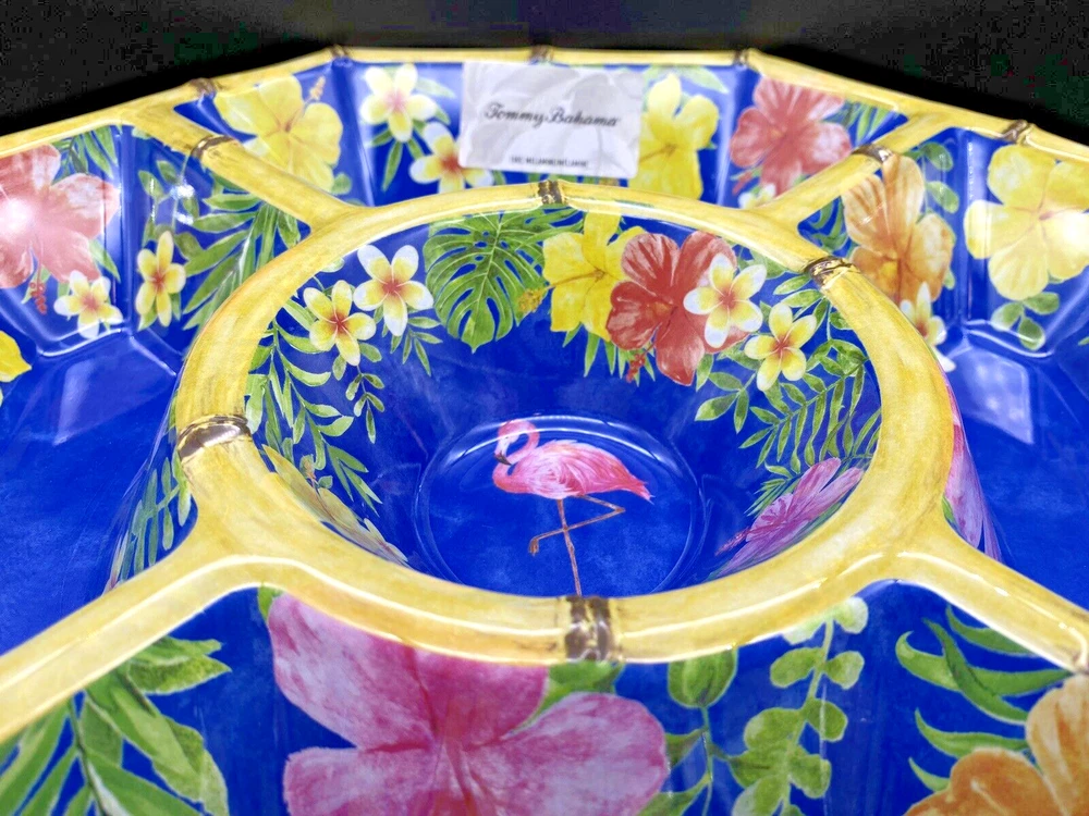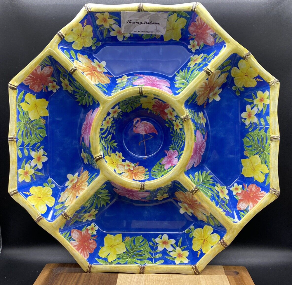 TOMMY BAHAMA MELAMINE Hibiscus Flamingo Bamboo Style Large Chip and Dip Bowl NEW Bring the tropical vibes to your next gathering with this Tommy Bahama chip and dip platter. The large, octagon-shaped tray features Hibiscus, Flamingo, and Bamboo patterns in vibrant pink and yellow colors. With five compartments and a dipping center bowl, it's perfect for serving a variety of snacks and appetizers. Crafted from durable melamine material with a light bamboo finish on the rim, this platter is chip-resistant and dishwasher safe for easy cleanup. Ideal for all occasions, especially summer parties, this platter is sure to impress your guests.