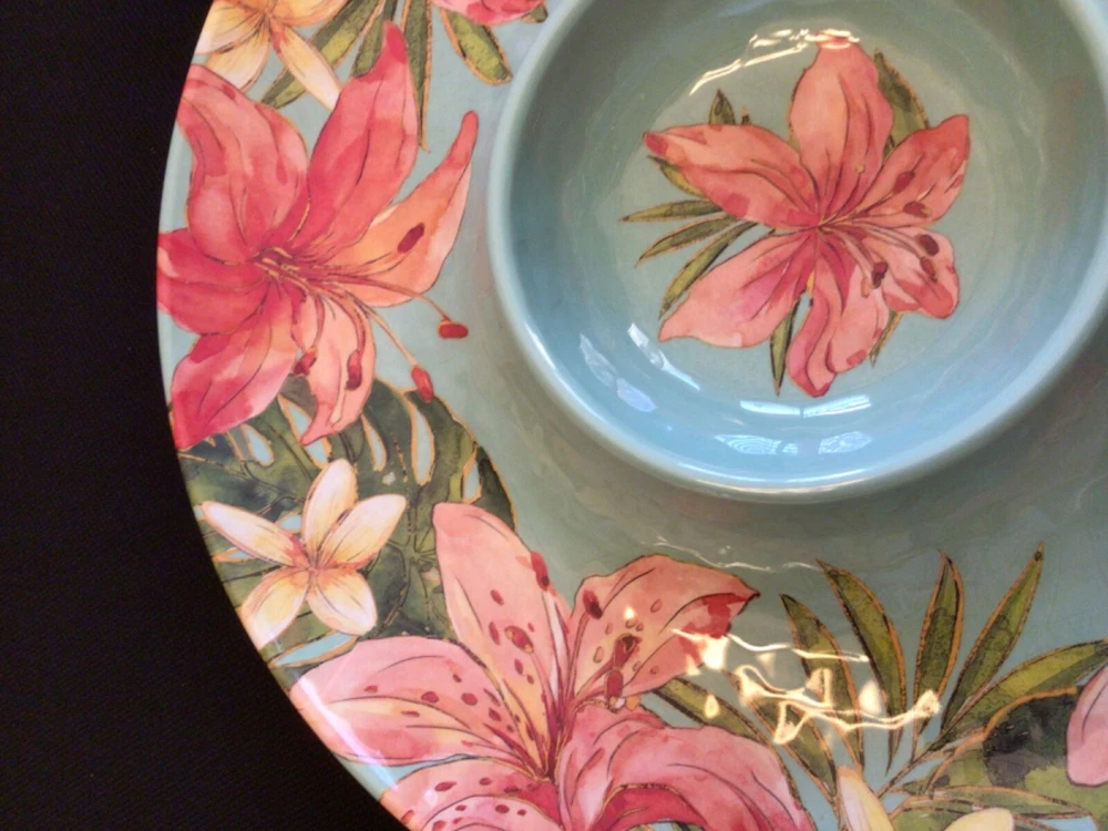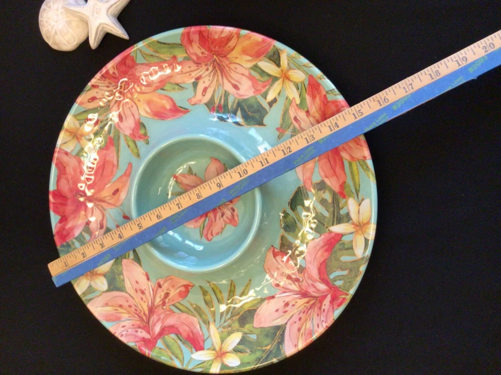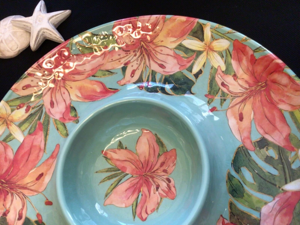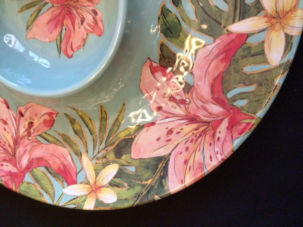 NEW TOMMY BAHAMA Melamine Chip n dip Platter Tropical Day Lilly Flowers…..with hint of gold shimmer accents. Coordinates with Tommy Bahama dinnerware. Size: 15 inches Melamine is shatter resistant, top rack ONLY a dishwasher safe. NO microwave usage. *smoke free environment seller.