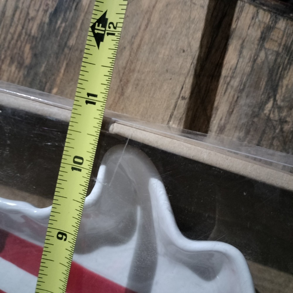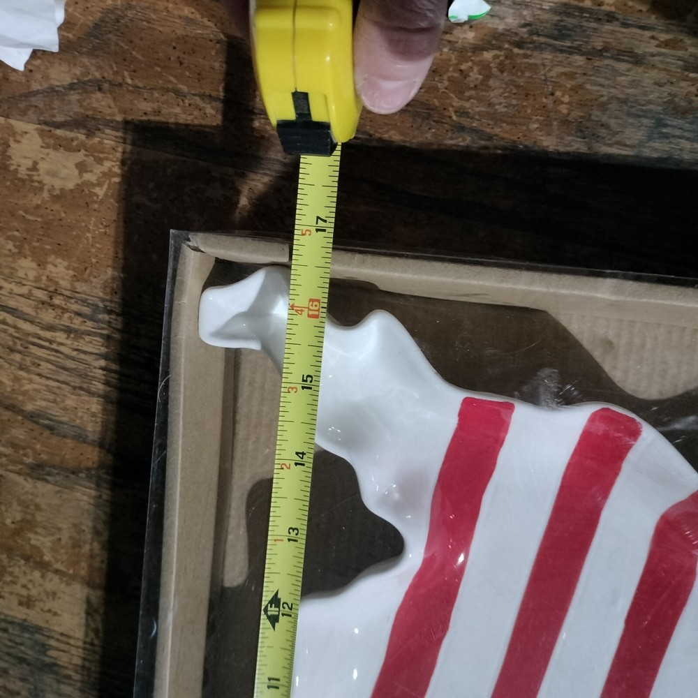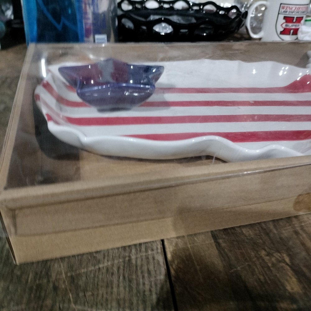 TRANSPAC FOOD SAFE UNITED STATES OF AMERICA SHAPED CHIP AND DIP TRAY NEW IN BOX. BOLD RED AND BLUE COLOR ON WHITE BACKGROUND. SIZE IS APPROXIMATELY 16" X 2" X 10". THE STAR DIP CUP IS ATTACHED TO TRAY. DELIGHTFUL ADDITION TO YOUR ENTERTAINING. YOU CAN BUY IT NOW, NO WAITING FOR AUCTION!