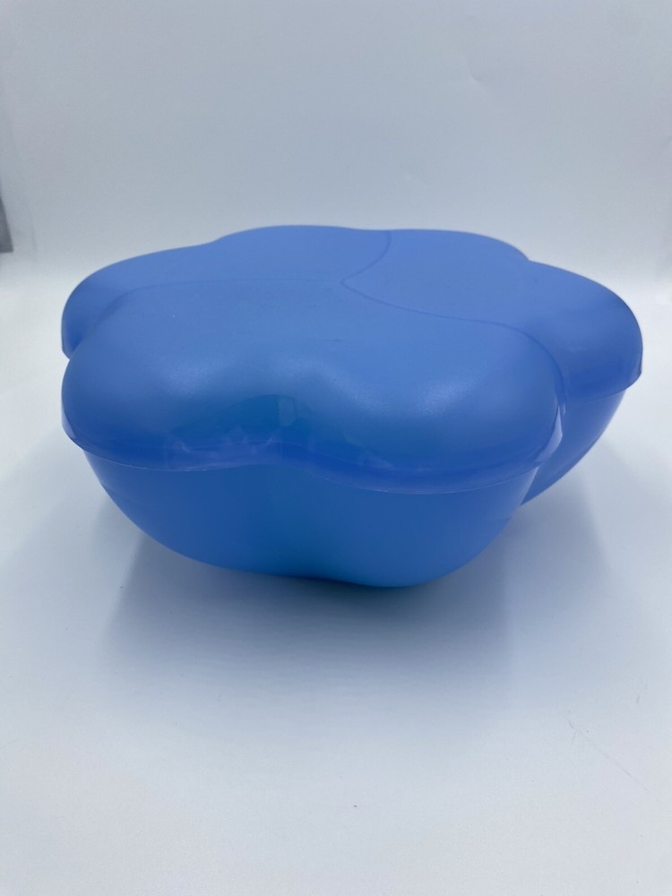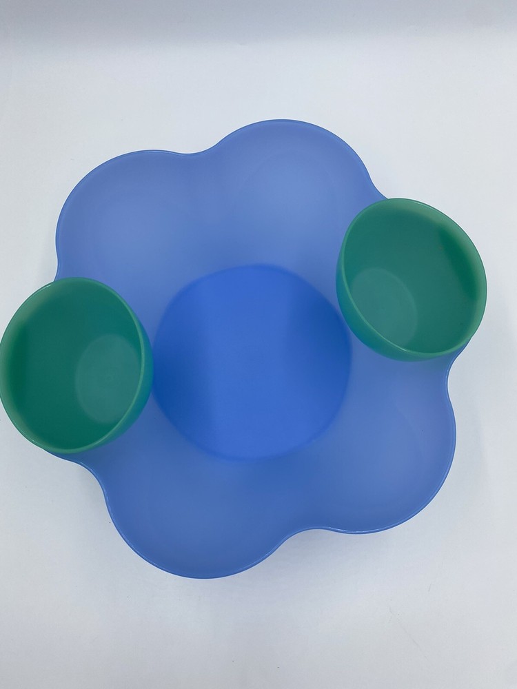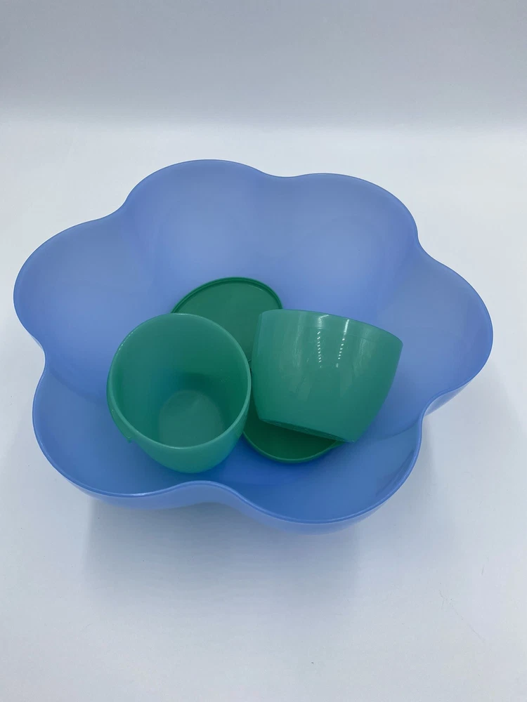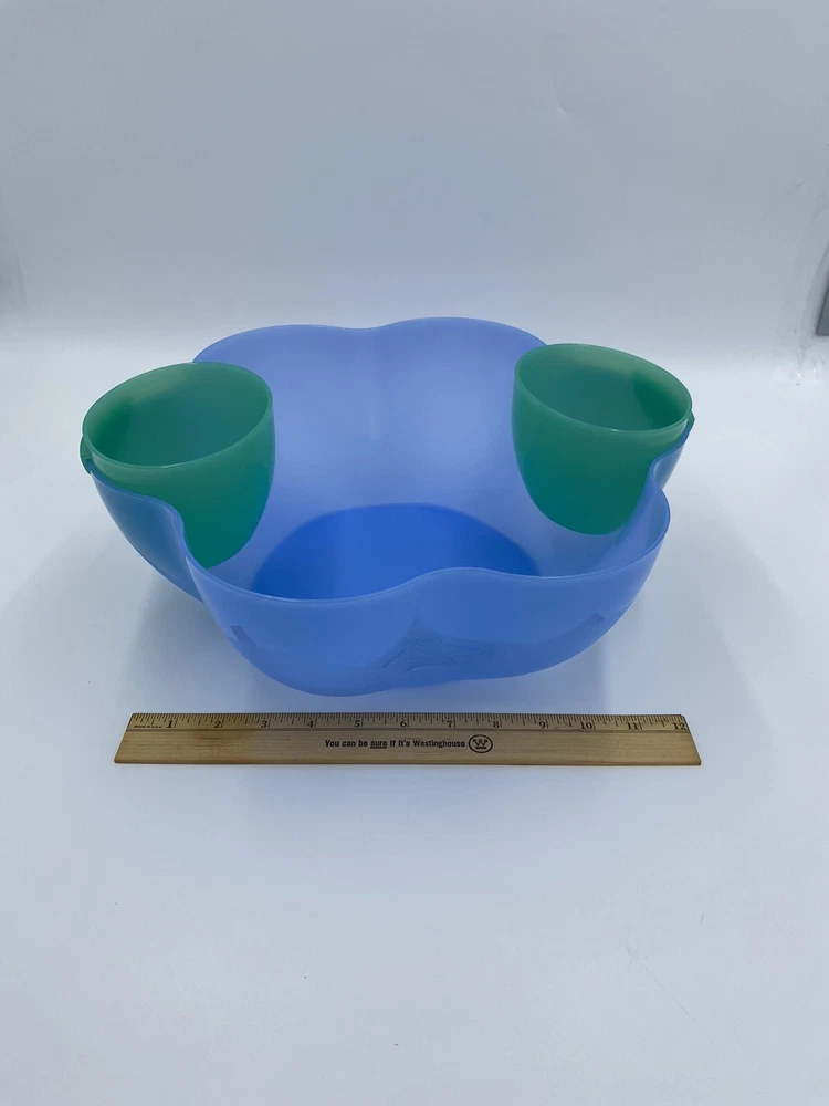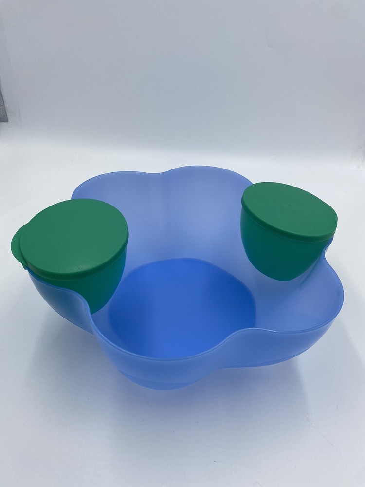 TUPPERWARE Blue Large Scalloped CHIP-N-DIP Cover Lid 4624 & 4625 and 2 Bowls New Lid doubles as a divided serving platter. 2 dip bowls with lids that hand on side of bowl. All packs together as one unit Bin1E