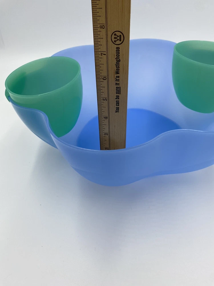 TUPPERWARE Blue Large Scalloped CHIP-N-DIP Cover Lid 4624 & 4625 and 2 Bowls New Lid doubles as a divided serving platter. 2 dip bowls with lids that hand on side of bowl. All packs together as one un...