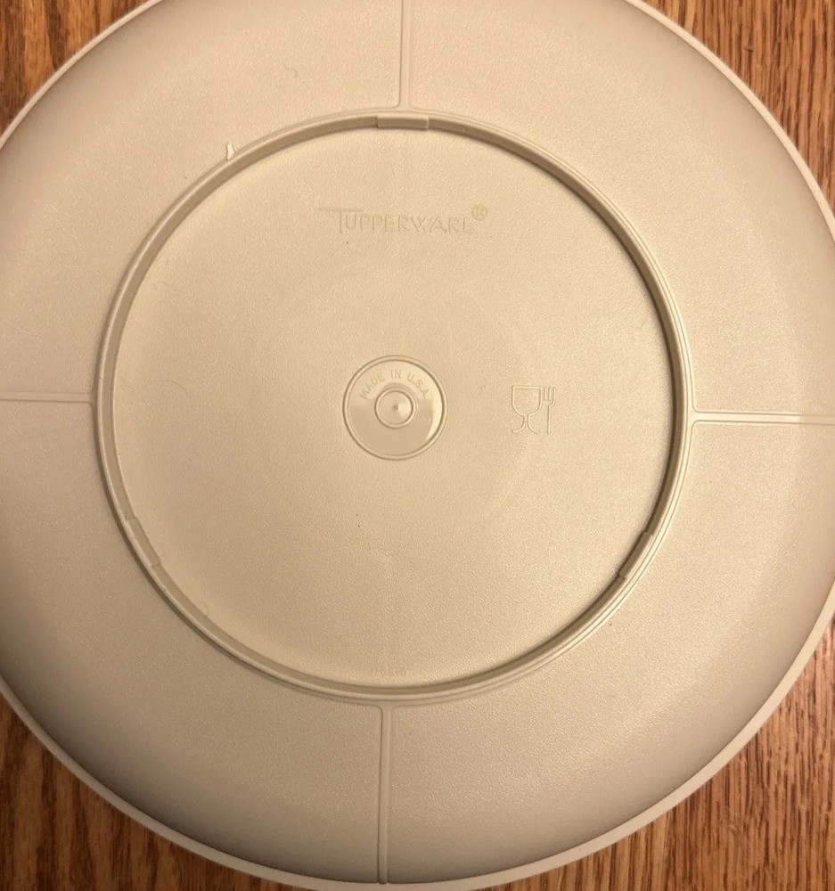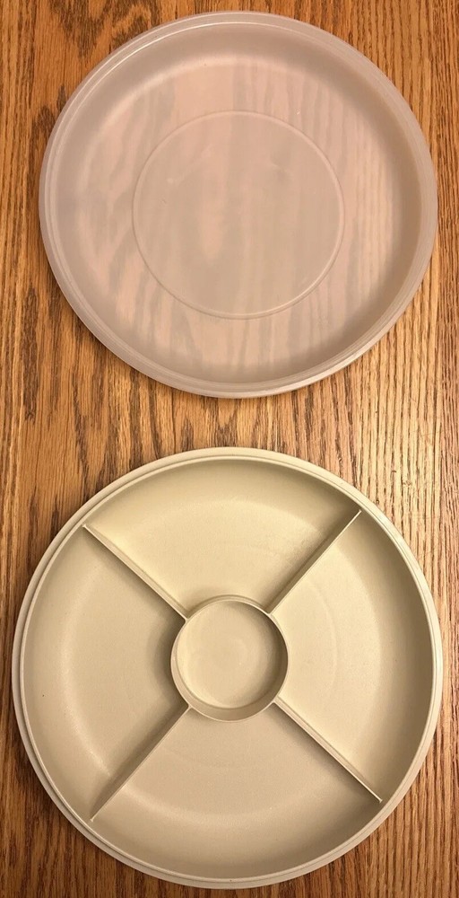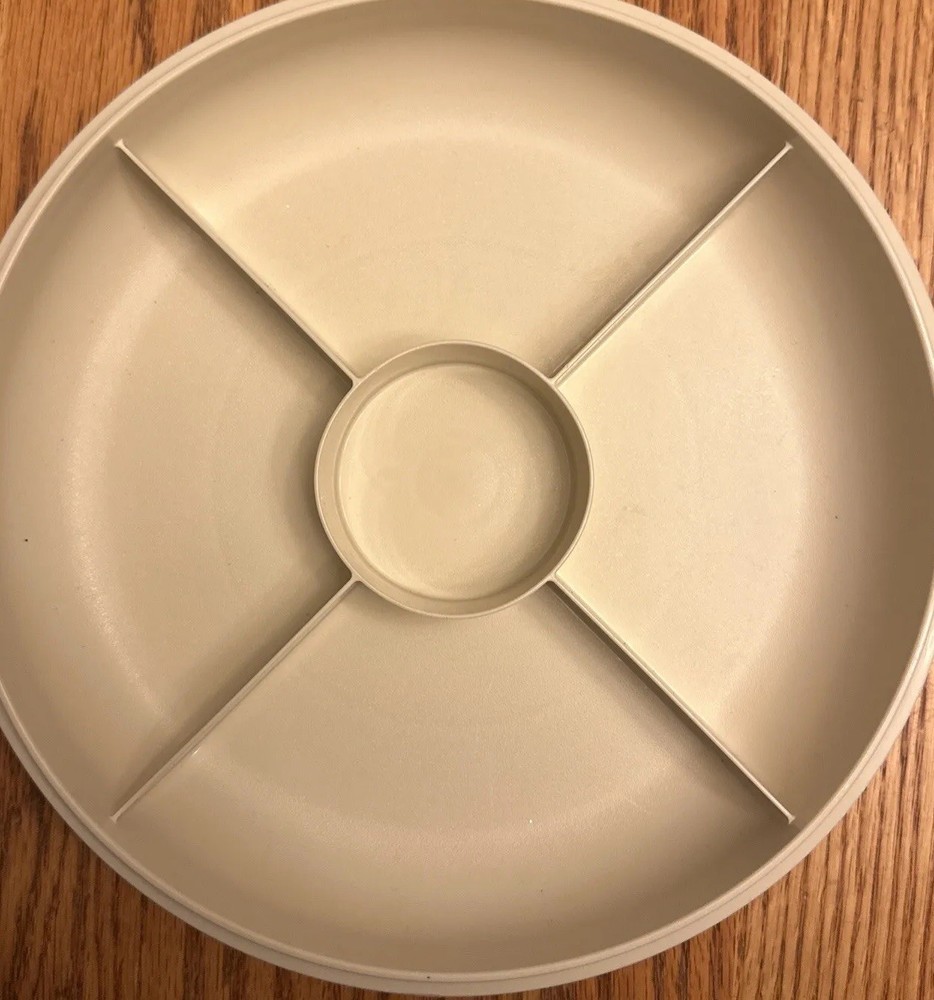 This vintage Tupperware serving tray is perfect for entertaining guests or for everyday use. With seven compartments, it's great for serving a variety of fruits, vegetables, chips, and dips. The pop-off lid keeps your food fresh, and the almond color adds a touch of retro charm to any kitchen. Made in the USA with high-quality plastic, this tray is both reusable and easy to clean. The size (13.5" diameter and 4" height) makes it large enough for a family gathering but not too bulky for everyday use. Whether you're a vintage collector or just looking for a practical and stylish serving tray, this Tupperware piece is a lifetime investment.
