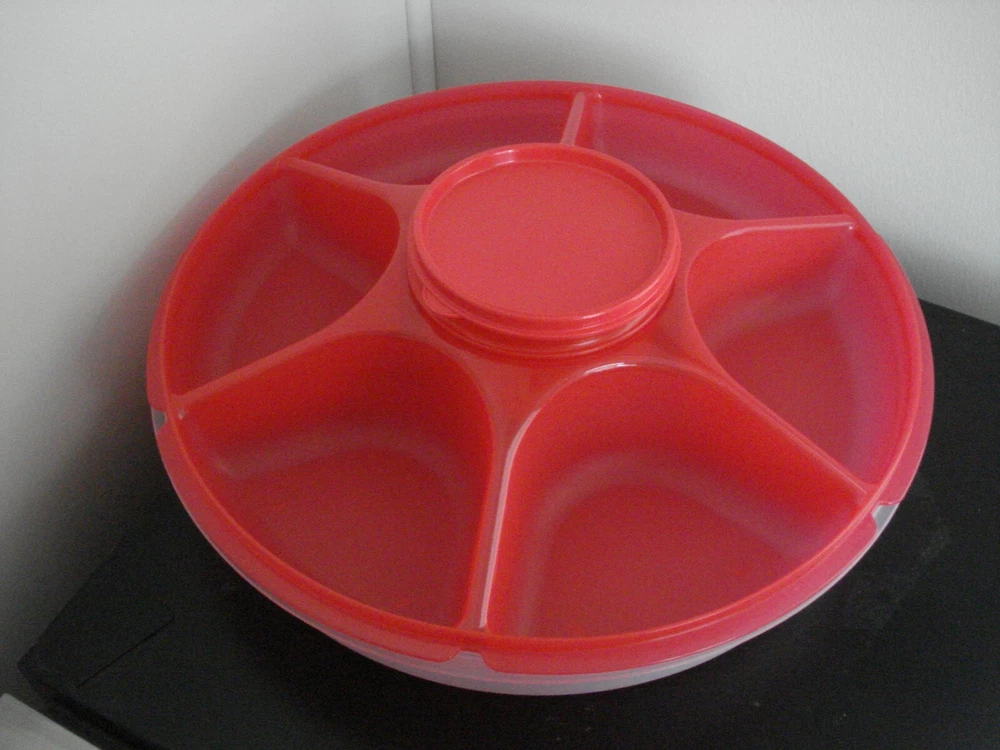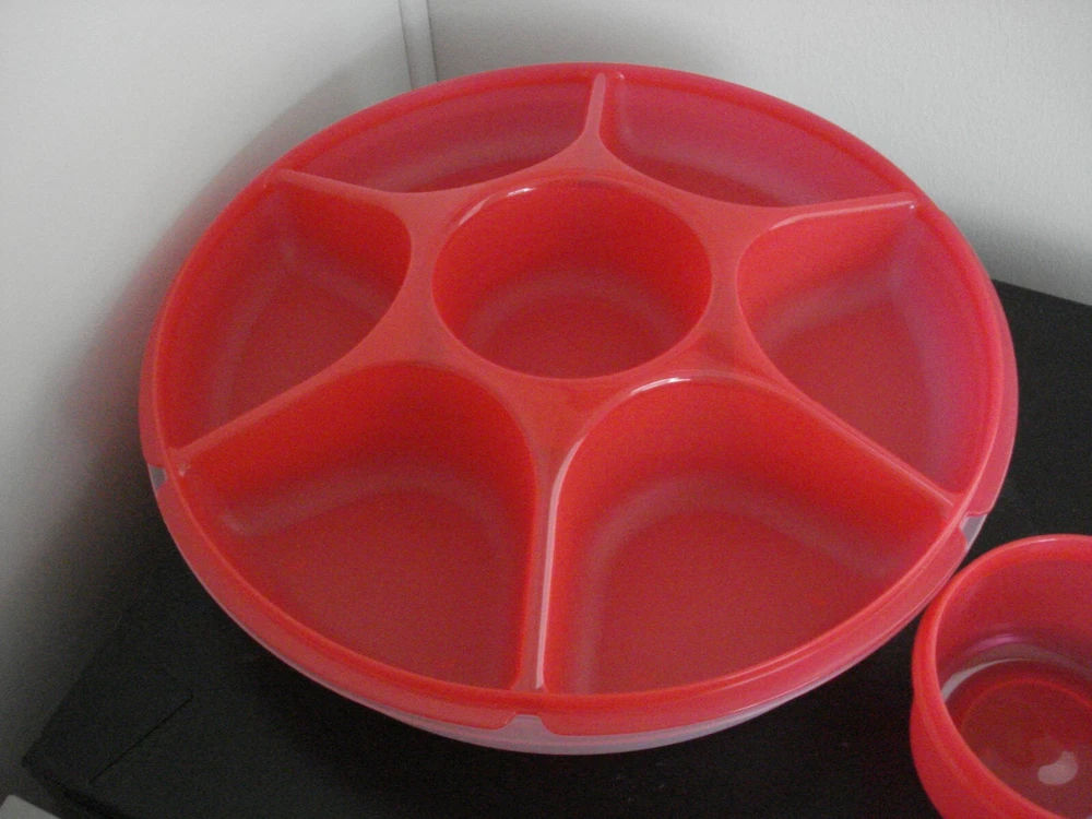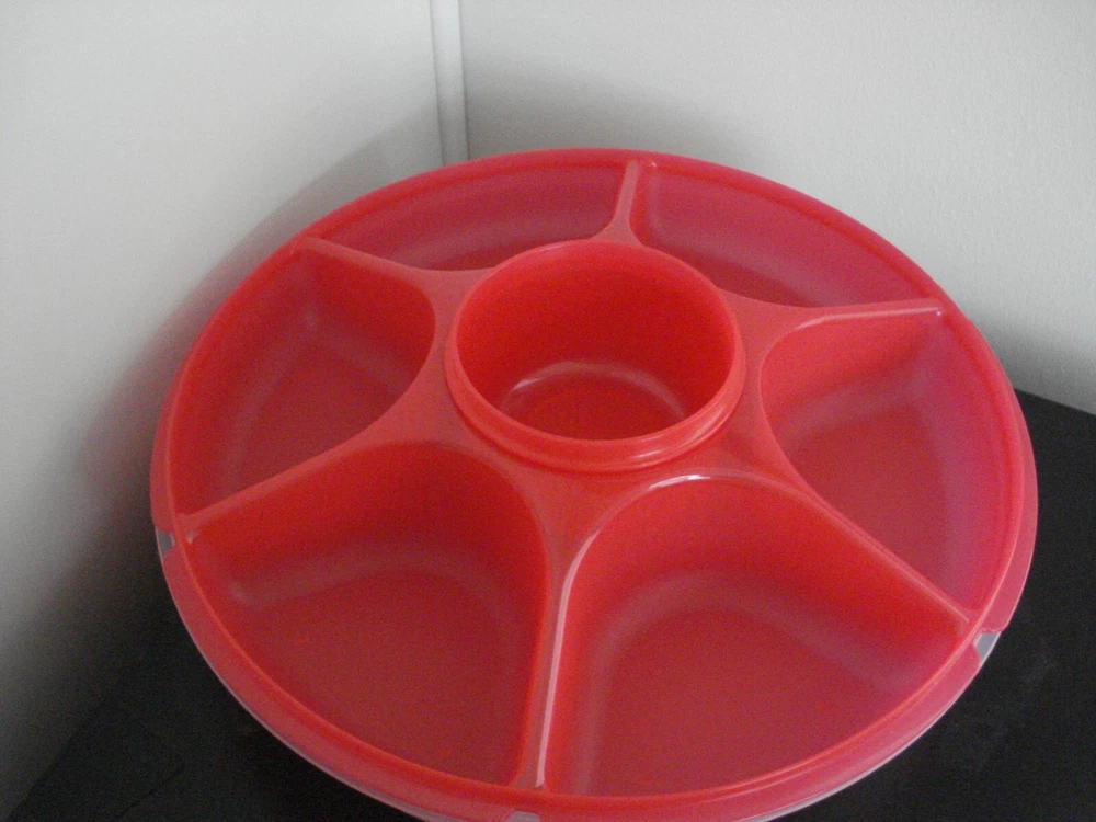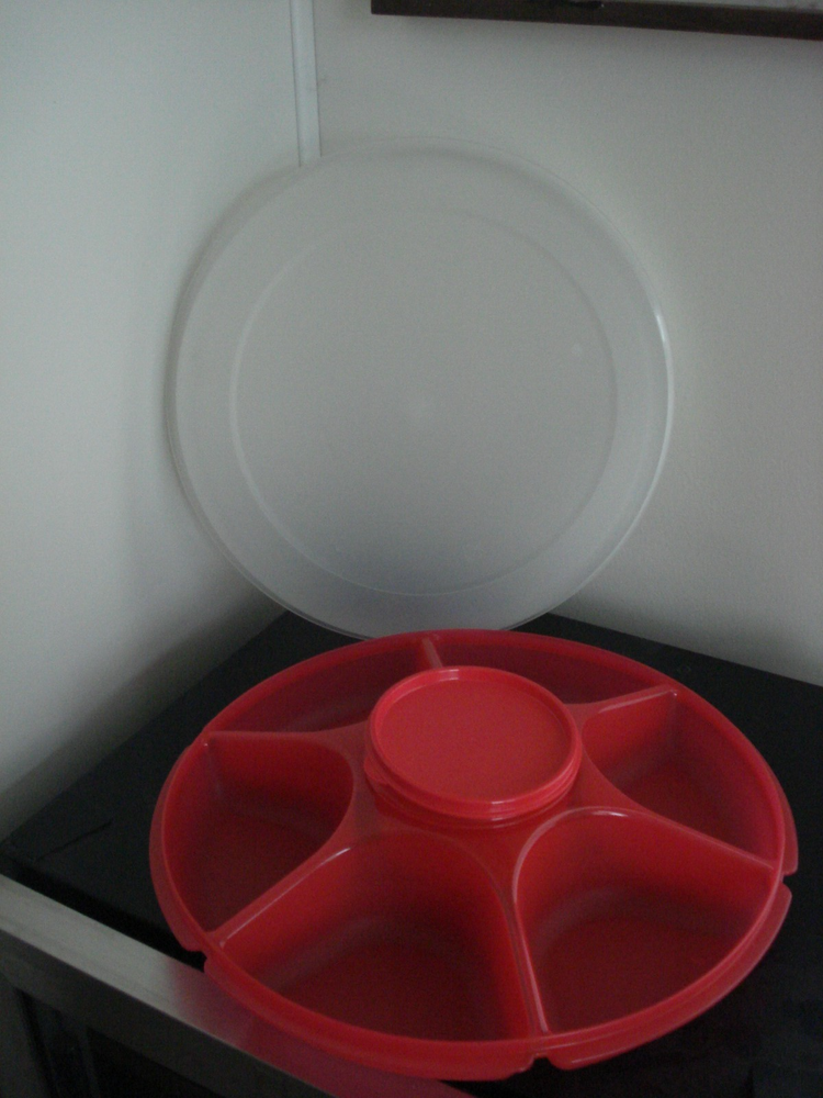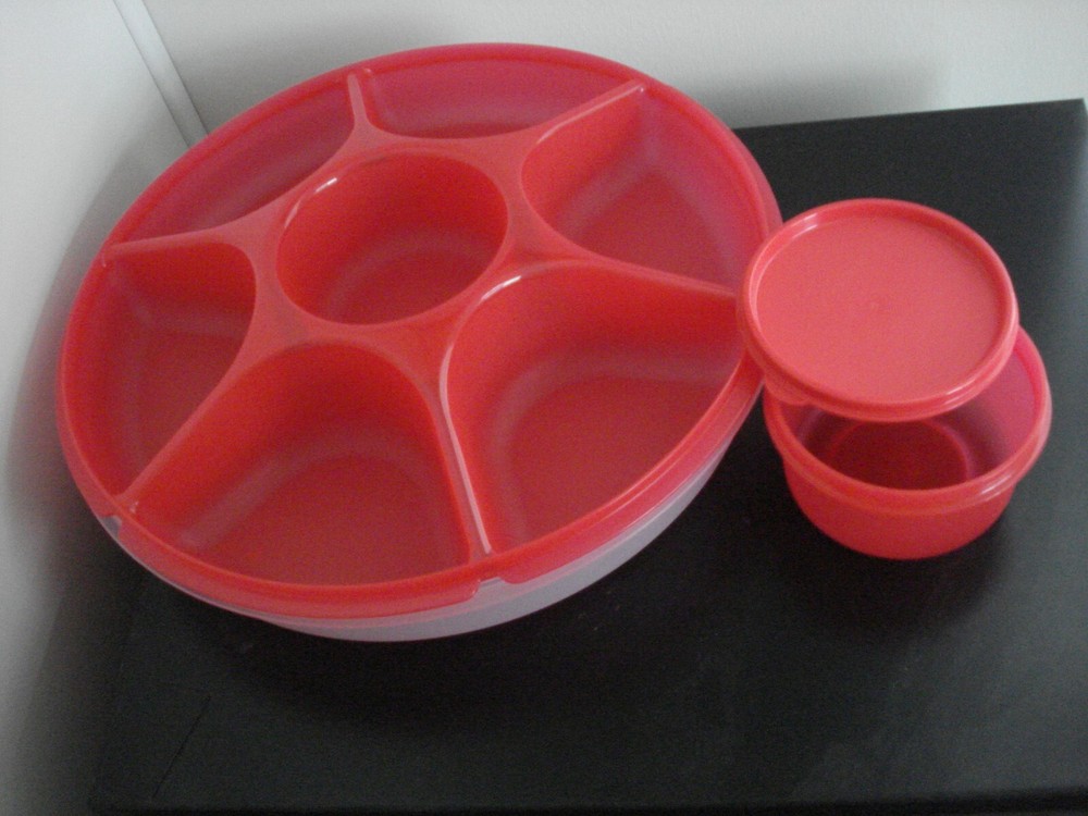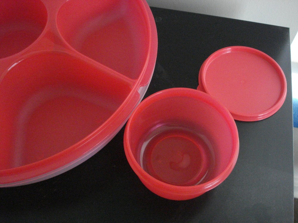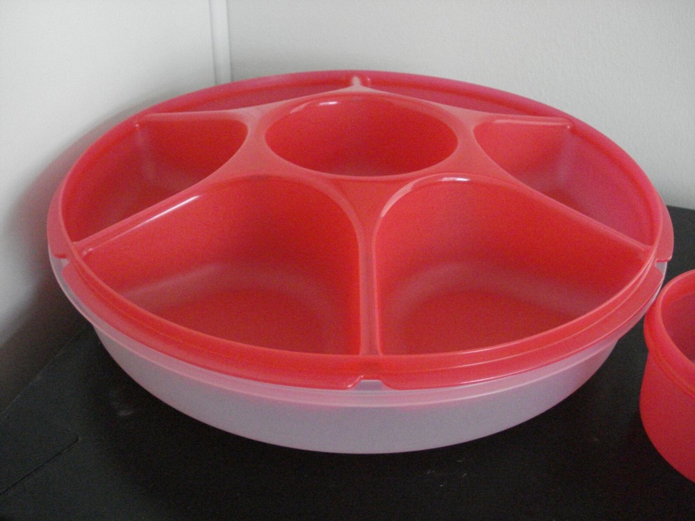 TUPPERWARE Divided Veggie/Chip/Dip Serving BOWL with LID *** possibly used? once??? cannot recall **** very clean *** 1-1/2" to 2" H 14" L *** smaller bowl/fits into the main center hole for dip? measures 4" L x 2 3/4" H **** main serving bowl & insert (dips?) are a nice red cober that snaps-on is white ***very nice/clean item *** eco-friendly seller recycle/reuse shipping materials smoke-free home