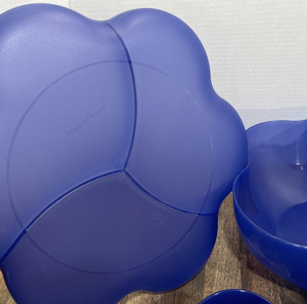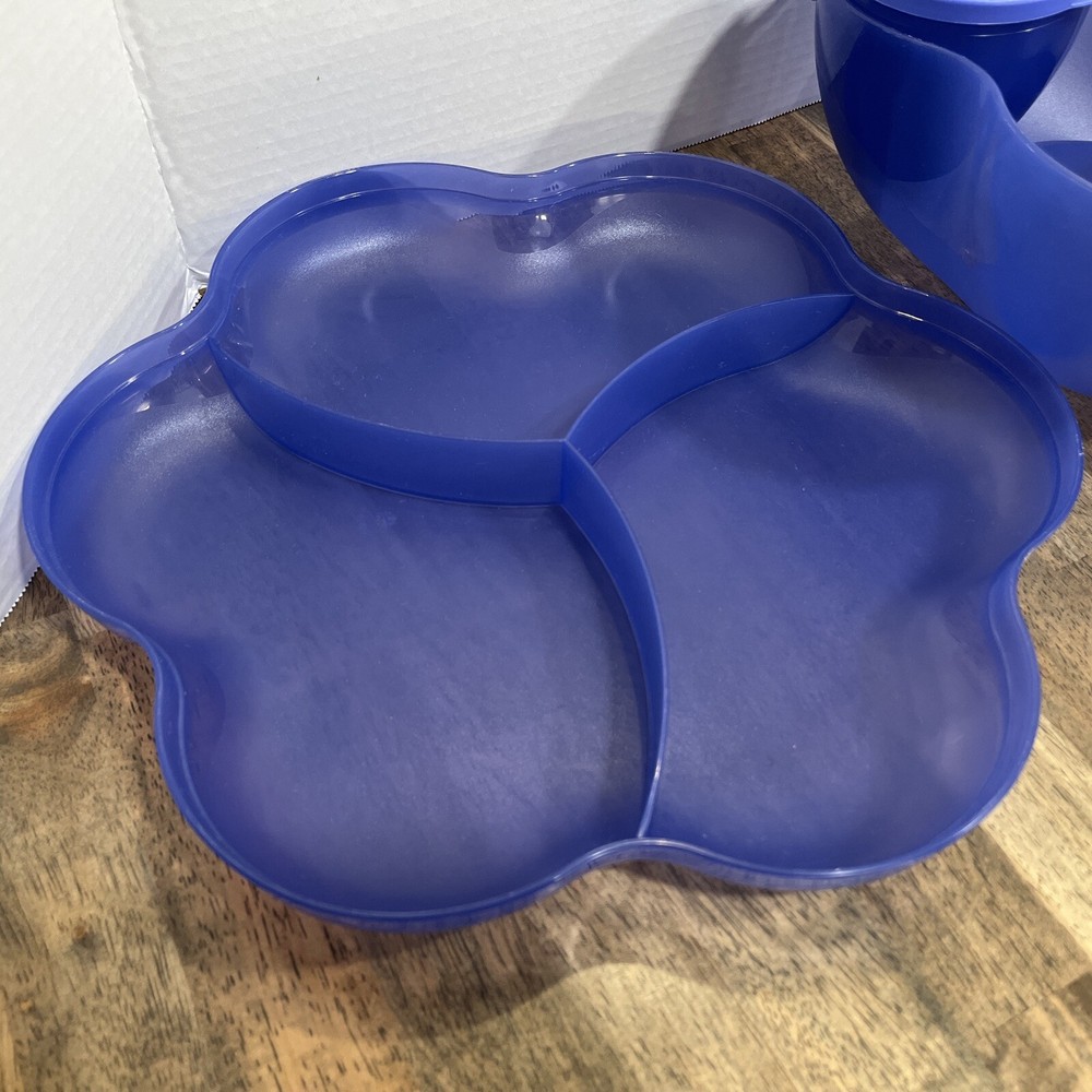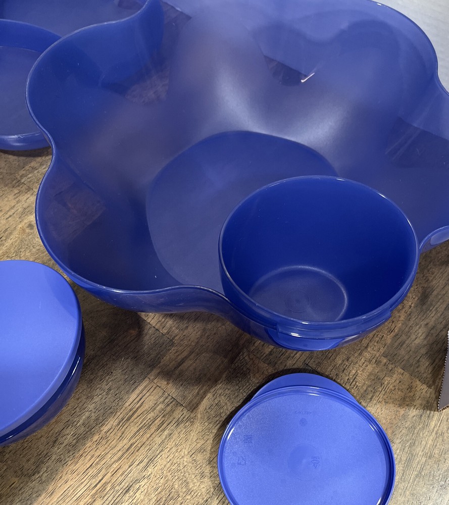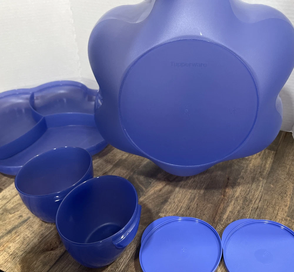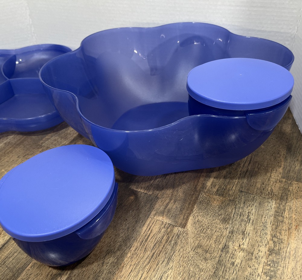 TUPPERWARE LARGE VERSATILE CHIP N DIP SET Mini Containers With Lids GREAT CONDITION!! Lid does not clamp shut but sits on top. Just want buyer aware before purchasing.