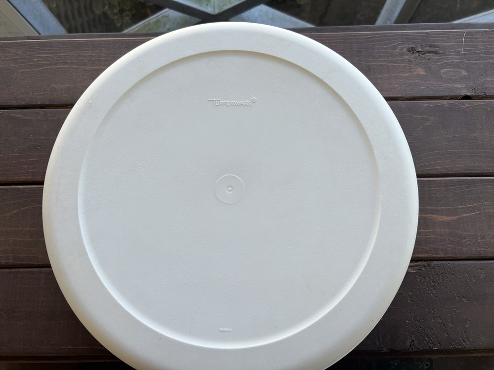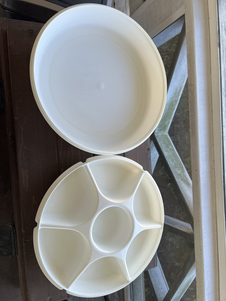 This Tupperware Serving Center 6-Part Divided Party Veggie Snack & Dip Tray is the perfect addition to your kitchen collection. The set includes a large round tray with a lid and seven slots, perfect for serving vegetables, snacks, and dips at your next party. The tray is made of durable plastic that is break/chip resistant and easy to clean, making it a great choice for everyday use. In addition, this tray is an original Tupperware product, representing a vintage and collectible piece for your kitchen. With its beige color and classic design, it is sure to fit in with any kitchen decor. This tray is dishwasher safe, making cleanup a breeze. Get ready to impress your guests with this stylish and functional Tupperware Serving Center!