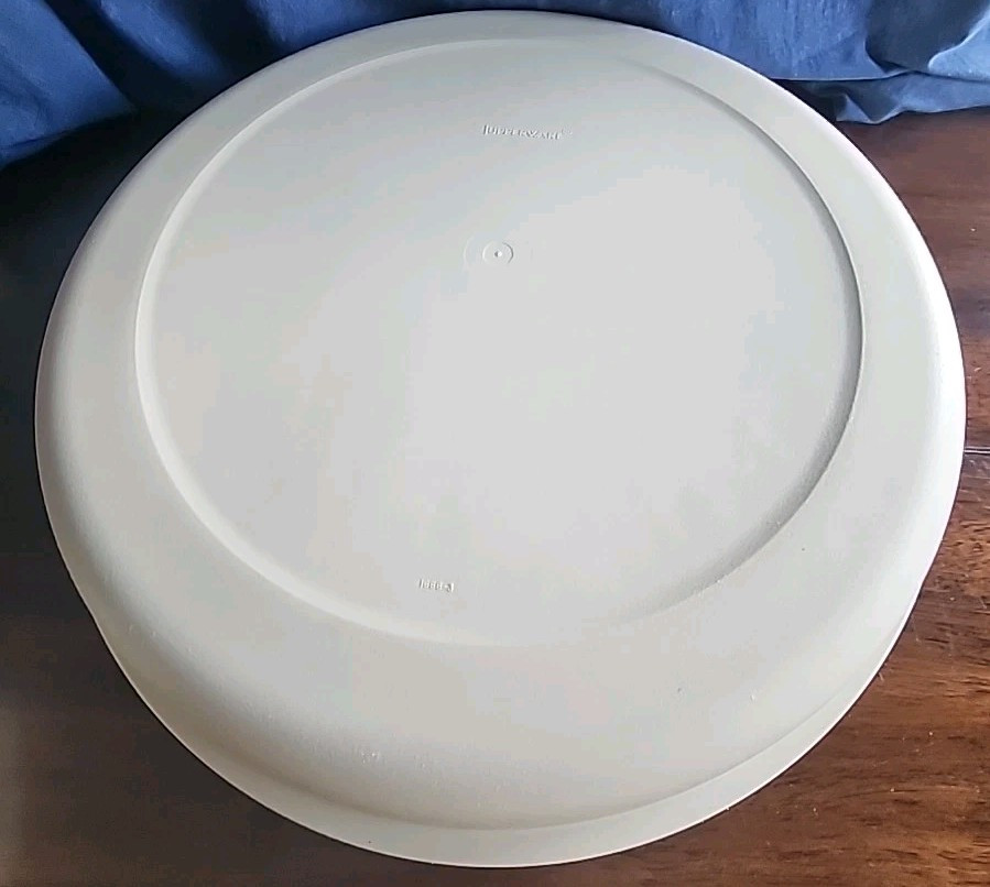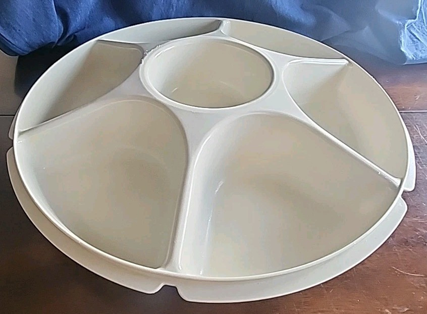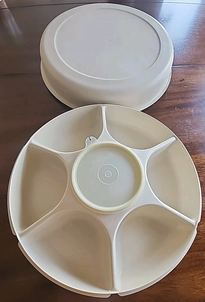 This TUPPERWARE Serving Center tray is perfect for any party or gathering. With 6 partitions, it's easy to separate veggies, chips, and dips for easy snacking. The tray is round and measures 13-1/2 inches in length and width, with a height of 4 inches. It's made of beige Tupperware material and features a center lid for added protection. The tray is perfect for both casual and formal occasions, and its large size makes it easy to serve a large group of people. The tray is an original Tupperware product and is in great condition. This tray is a must-have for anyone who loves to host parties or gatherings.