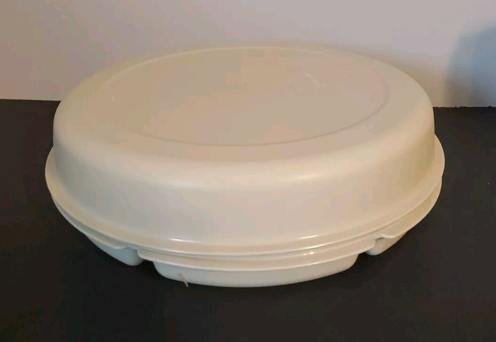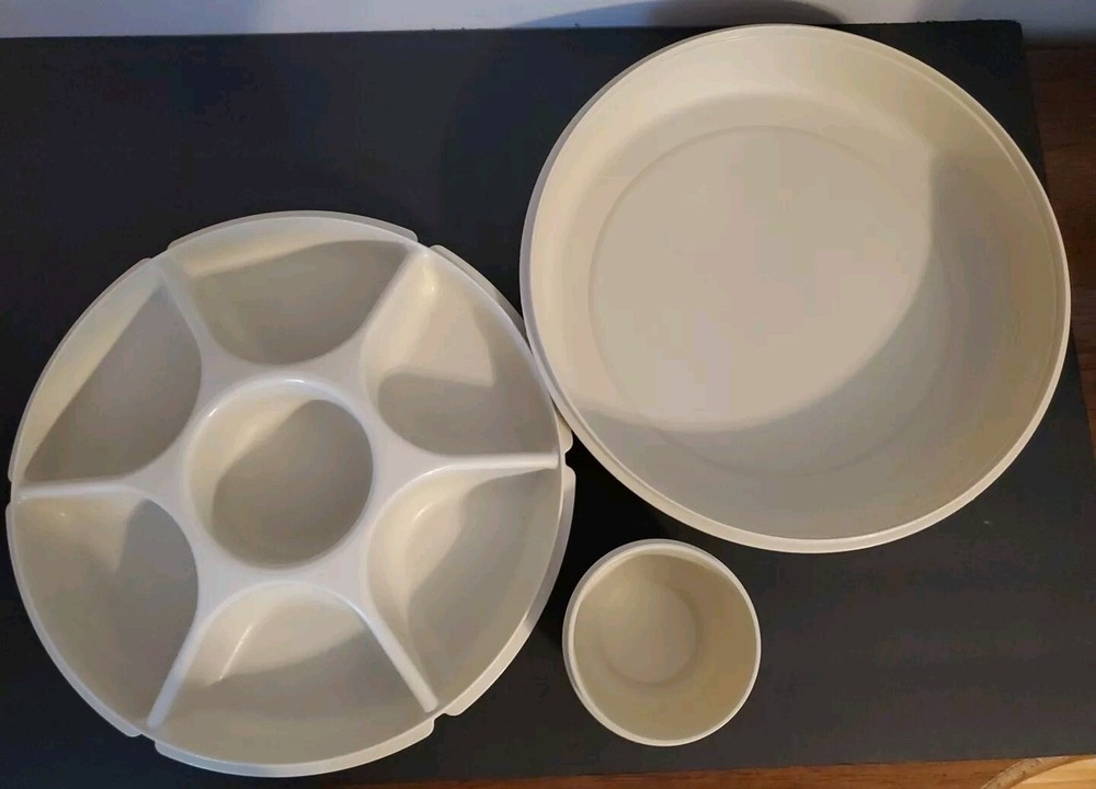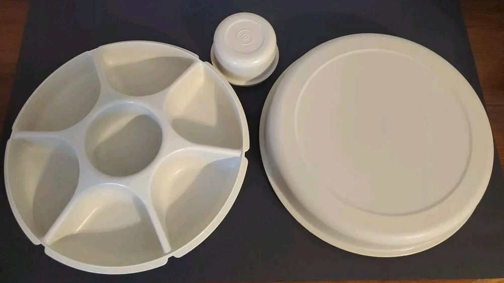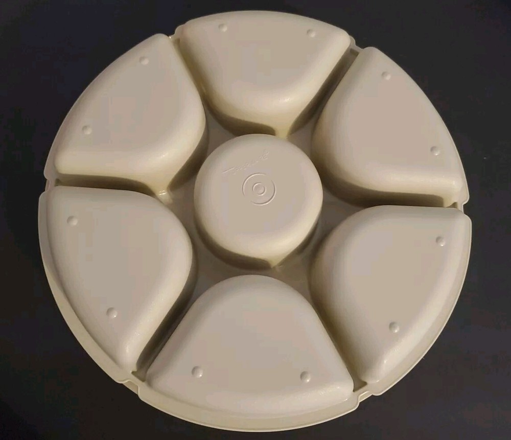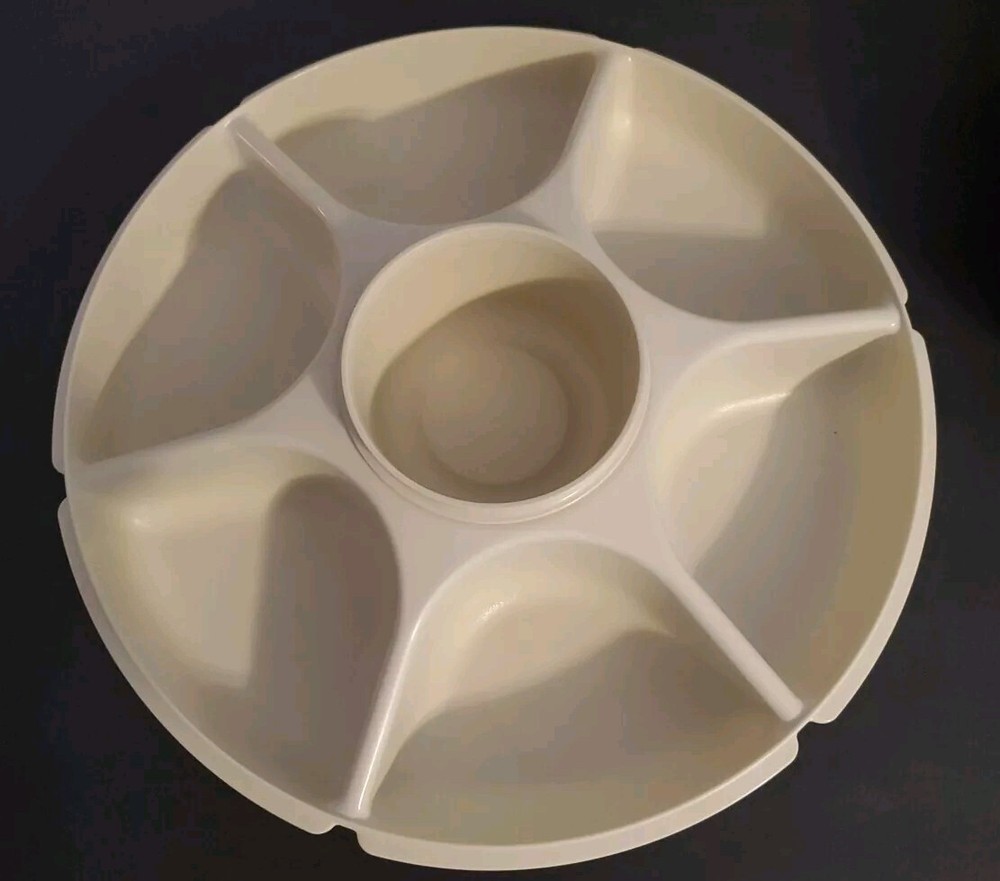This Tupperware Serving Center tray is a vintage large round tray designed for entertaining. It includes 6-part divided sections for serving a variety of snacks and dips, making it ideal for parties or gatherings. The tray is beige in color and features a chip & dip design with a covered center lid. The Tupperware brand is known for its durable and practical kitchen storage solutions, making this tray a versatile addition to any adult's kitchen or home collection. The lid to small bowl is missing.
