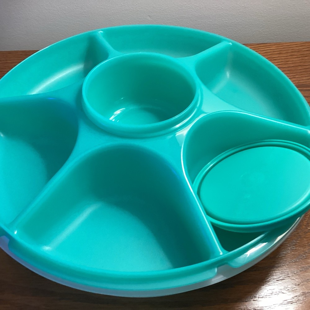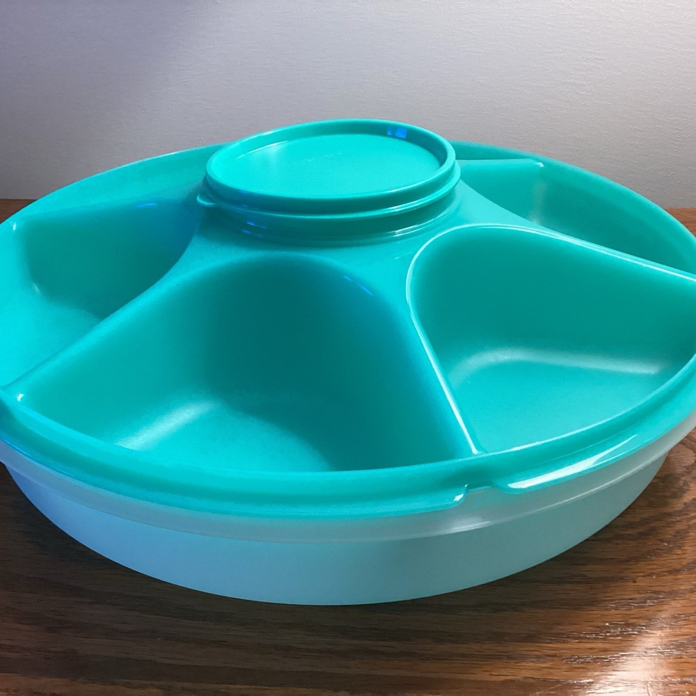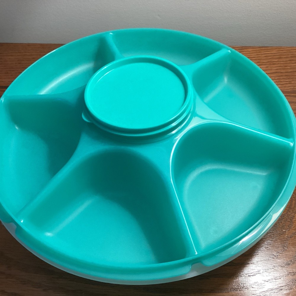 The TUPPERWARE Serving Center 6 Part Divided Veggie Snack & Dip Tray is a large round tray made of green and clear plastic. It includes a fruit holder, relish server, center dip container keeper with lid, and lid. This tray is perfect for serving snacks and dips at parties, with 7 different slots for organizing various items. With its traditional style and chip & dip feature, this Tupperware tray is a practical and stylish addition to any kitchen or home decor. Made in the United States, this tray is a collectible item for those interested in kitchen storage and organization.