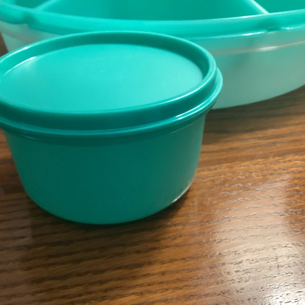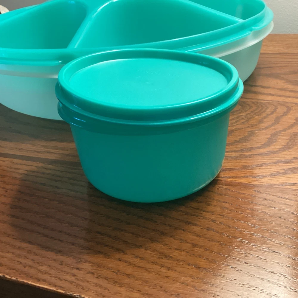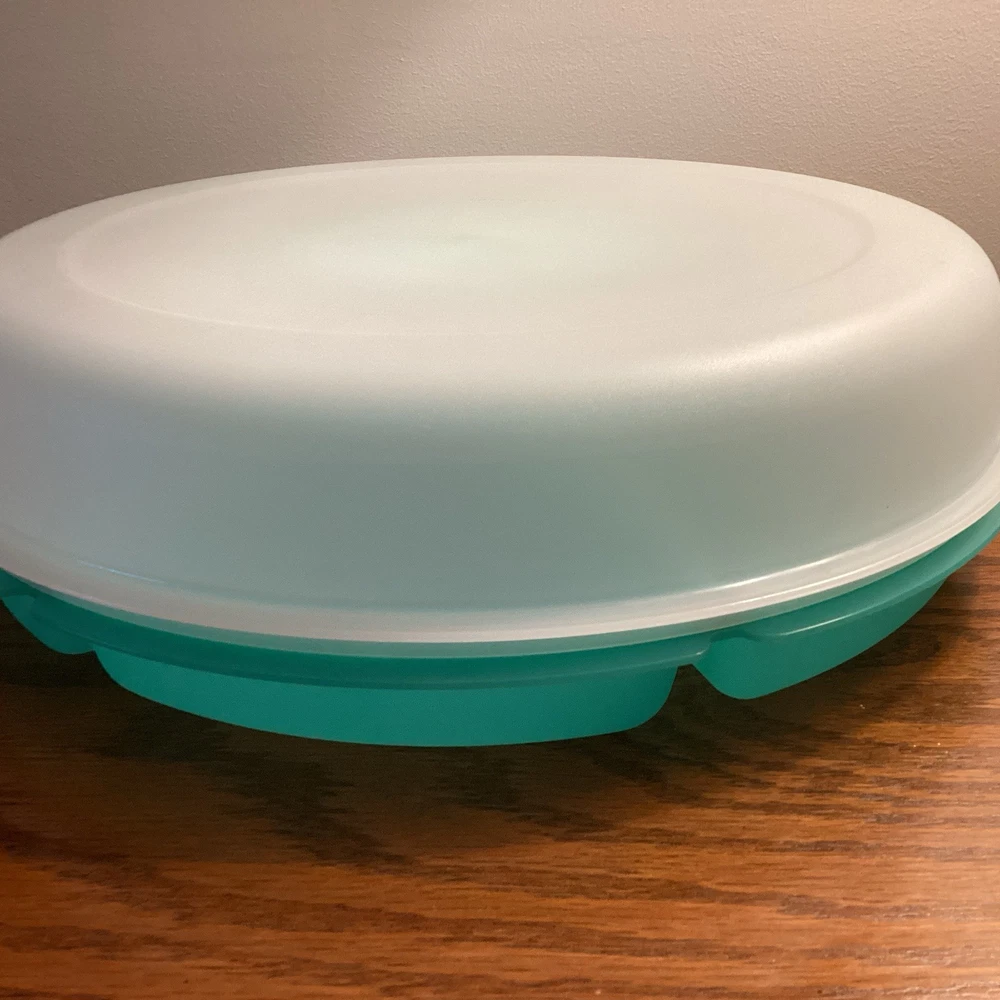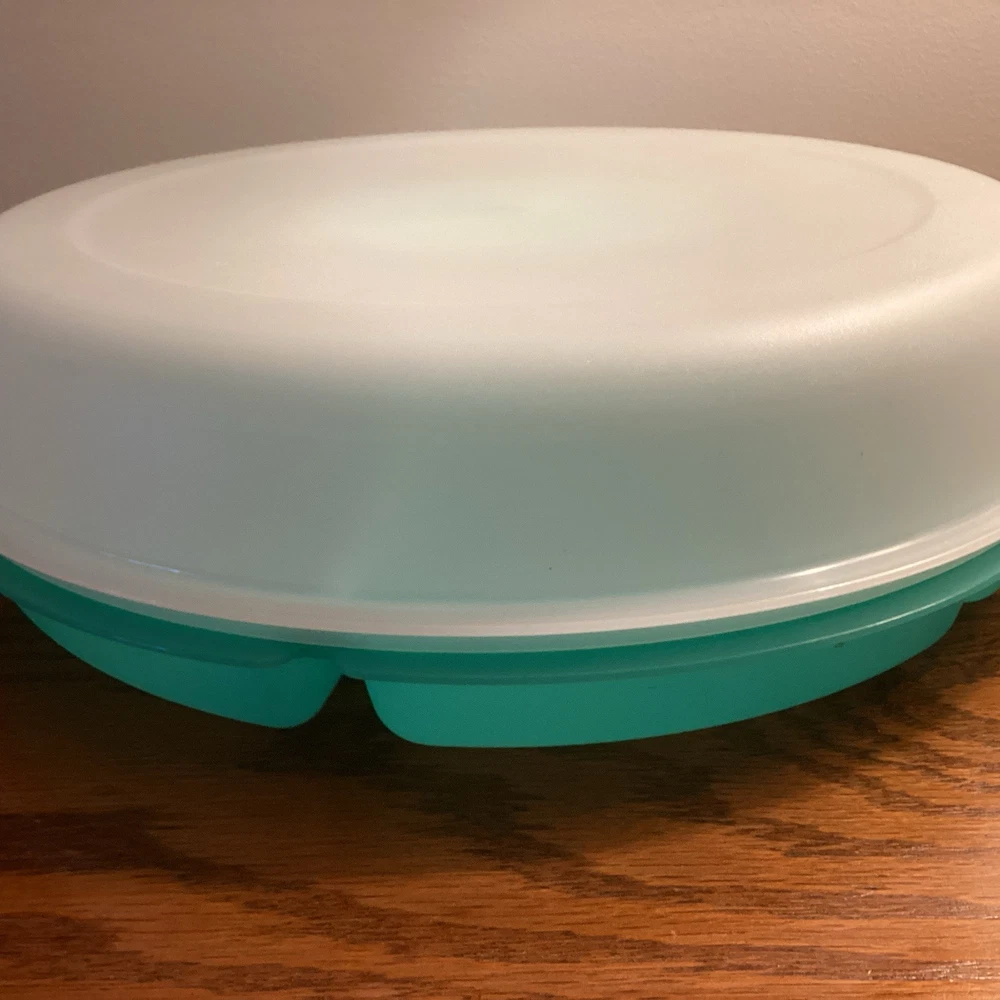 The TUPPERWARE Serving Center 6 Part Divided Veggie Snack & Dip Tray is a large round tray made of green and clear plastic. It includes a fruit holder, relish server, center dip container keeper with lid, and lid. This tray is perfect for serving snacks and dips at parties, with 7 different slots for organizing various items. With its traditional style and chip & dip feature, this Tupperware tray is a practical and stylish addition to any kitchen or home decor. Made in the United States, this tray is a collectible item for those interested in kitchen storage and organization.