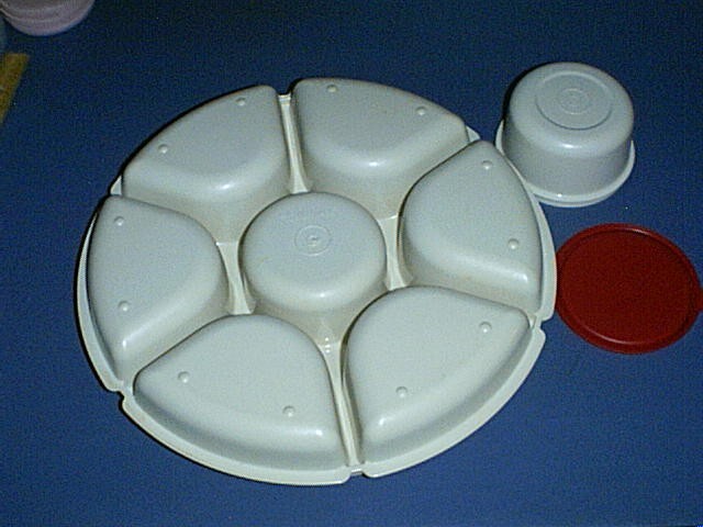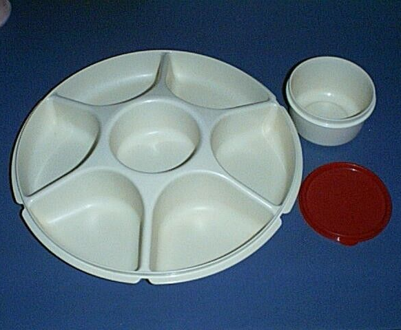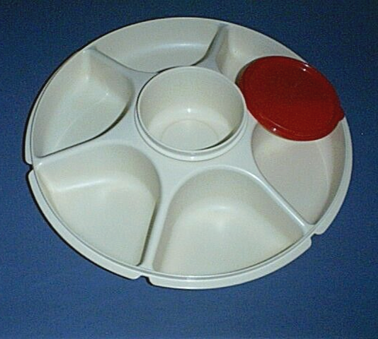 This auction is for a TUPPERWARE Large Divided / Sectioned Serving Center Tray #1665 or Buffet Platter with a Removable Dip Bowl #1667 and Red Seal #5227. The Almond Tray measures 13 1/2 inches across and 2 1/2 inches deep. The Dip Bowl will hold 14 ounces. This is in Excellent Condition - Gently used and Very Clean! Email me with questions. I will combine Winning Auctions when possible to save on shipping costs for the Buyer.