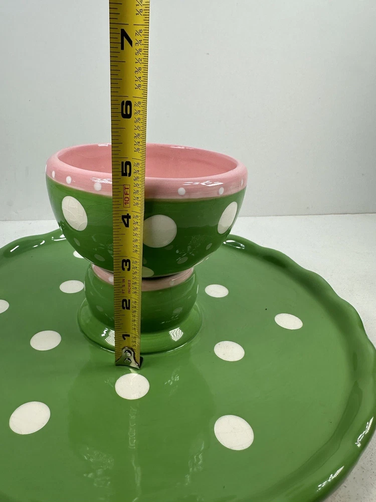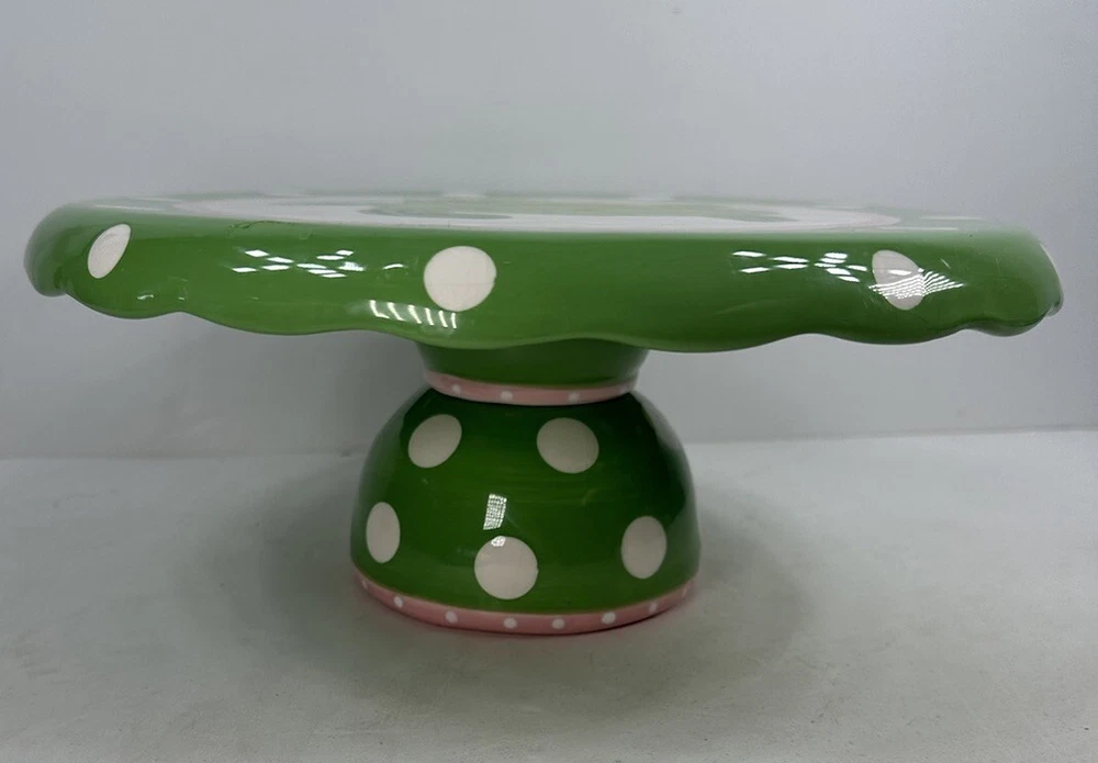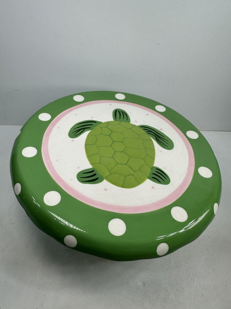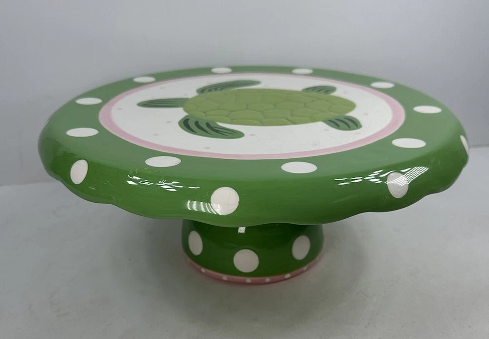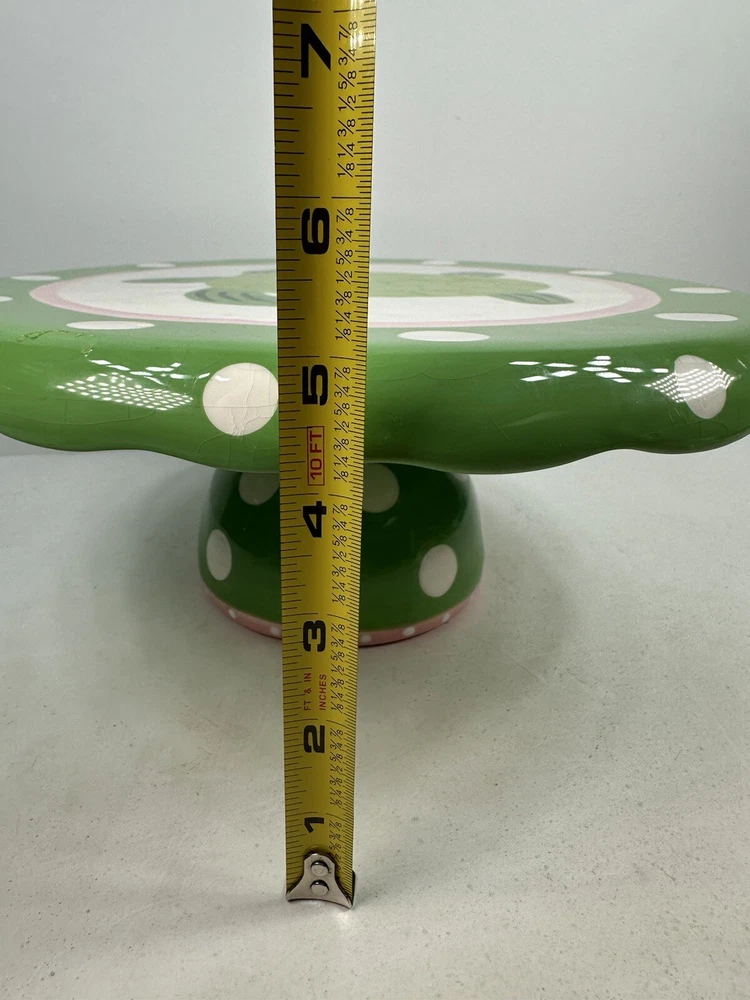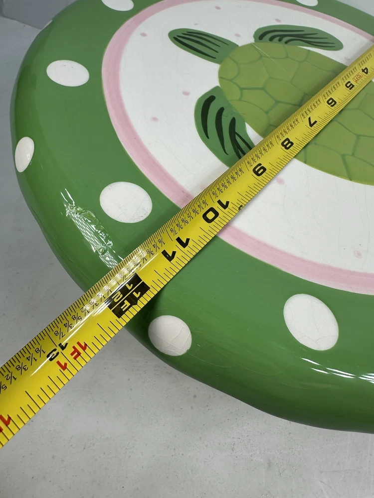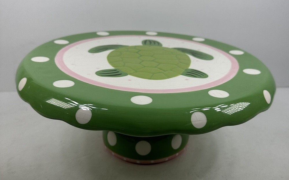This is an extremely hard design to find! The turtle is so adorable! A true conversation piece. This unique turtle polka dot cake plate or chip and dip server is a must-have for any party. Measuring 12 inches in diameter and 5 inches in height, it is large enough to accommodate a variety of treats. The glossy finish and modern style make it an eye-catching centerpiece for any occasion. Crafted from ceramic, this vintage Mainstreet Collection item features a 2-in-1 design that allows you to easily serve cake or chips and dip. Hand wash only to ensure its longevity. The pink, green, and white color scheme adds a touch of fun to your kitchen or dining room decor. Don't miss out on the chance to add this rare find to your collection. This has some crazing and an imperfection in the green glaze as shown on photos. Most likely a factory flaw, no chips or cracks. Please review the photos and message with questions before purchasing. Thank you for checking out my store.