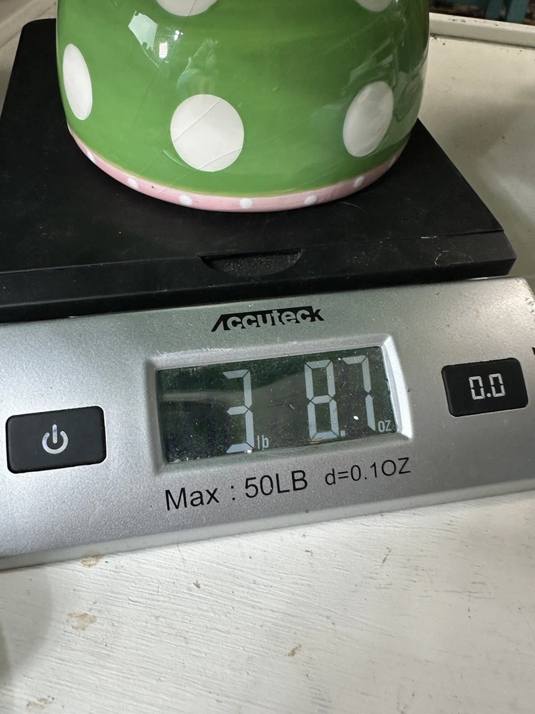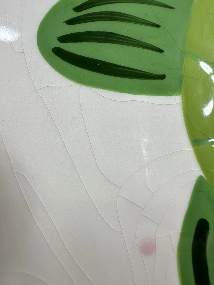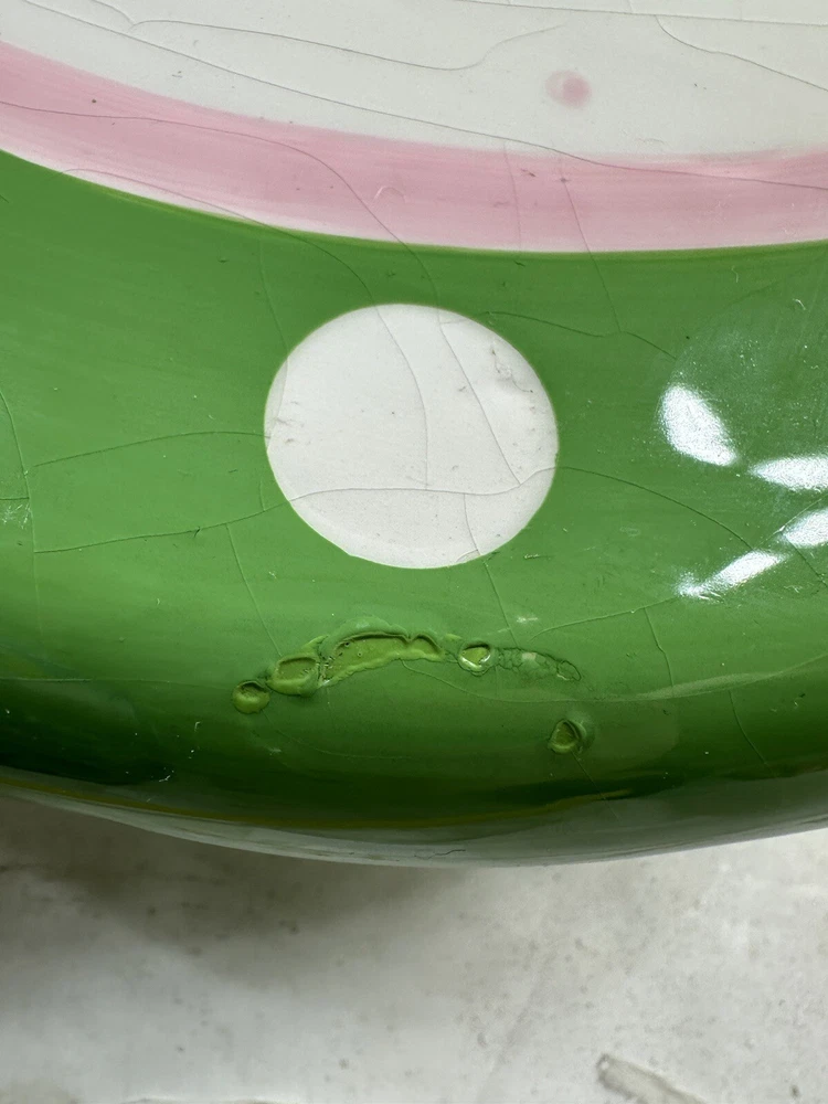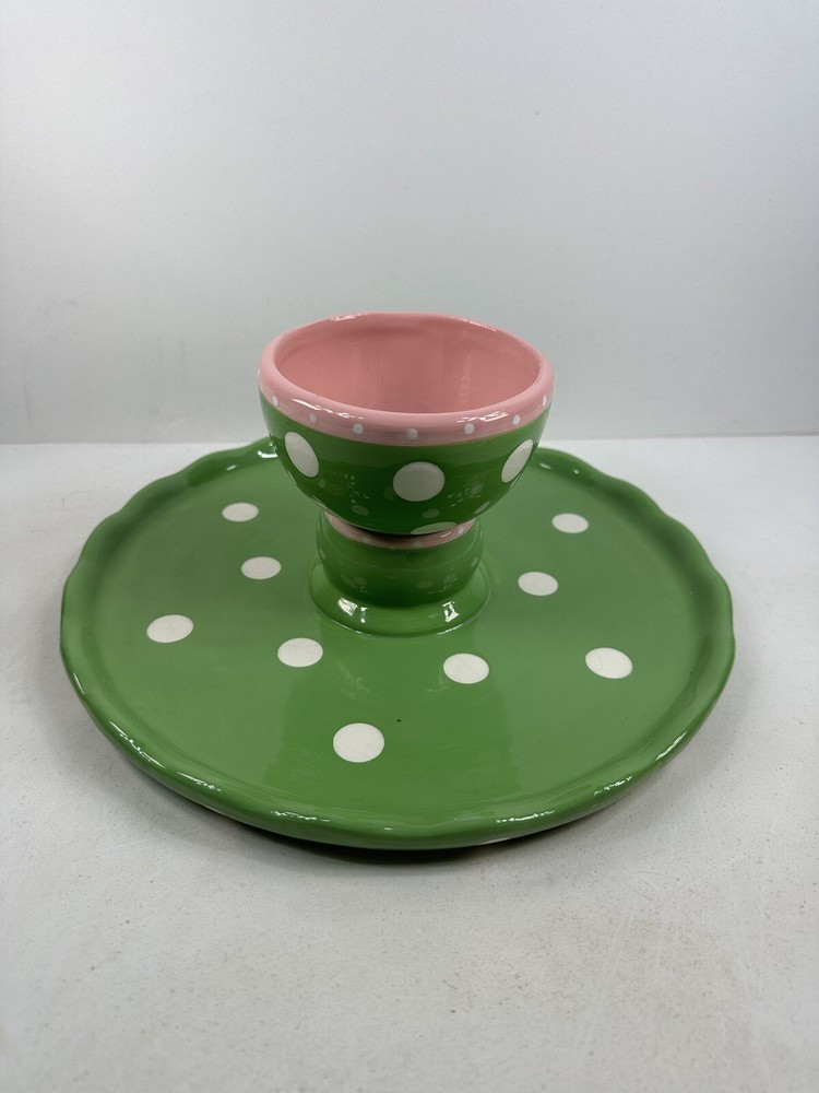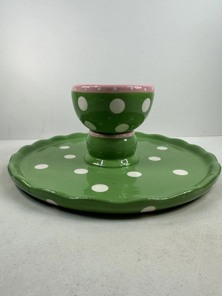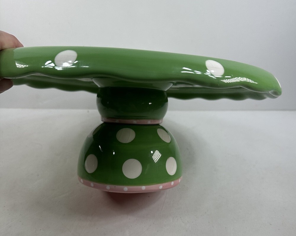 This is an extremely hard design to find! The turtle is so adorable! A true conversation piece. This unique turtle polka dot cake plate or chip and dip server is a must-have for any party. Measuring 12 inches in diameter and 5 inches in height, it is large enough to accommodate a variety of treats. The glossy finish and modern style make it an eye-catching centerpiece for any occasion. Crafted from ceramic, this vintage Mainstreet Collection item features a 2-in-1 design that allows you to easily serve cake or chips and dip. Hand wash only to ensure its longevity. The pink, green, and white color scheme adds a touch of fun to your kitchen or dining room decor. Don't miss out on the chance to add this rare find to your collection. This has some crazing and an imperfection in the green glaze as shown on photos. Most likely a factory flaw, no chips or cracks. Please review the photos and message with questions before purchasing. Thank you for checking out my store.