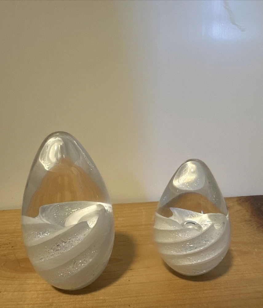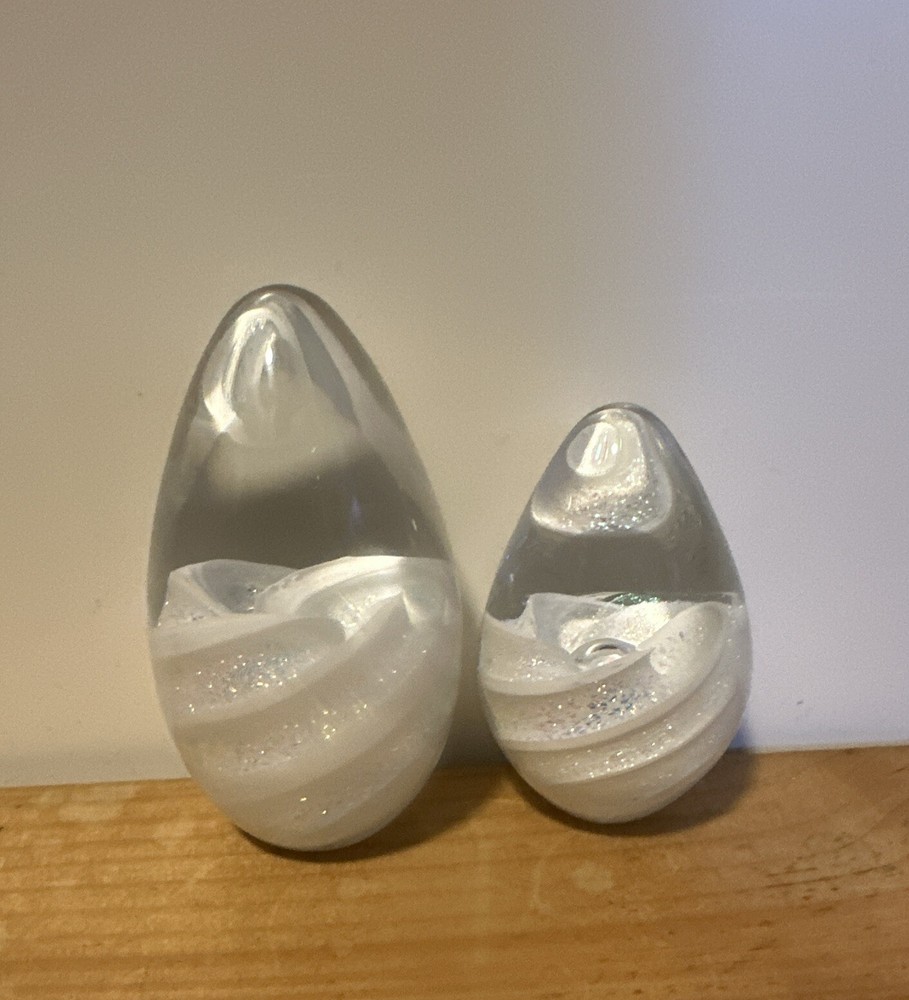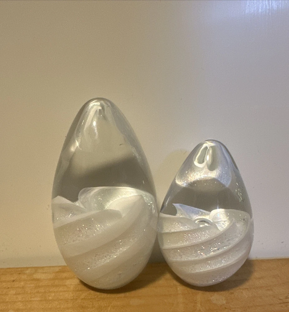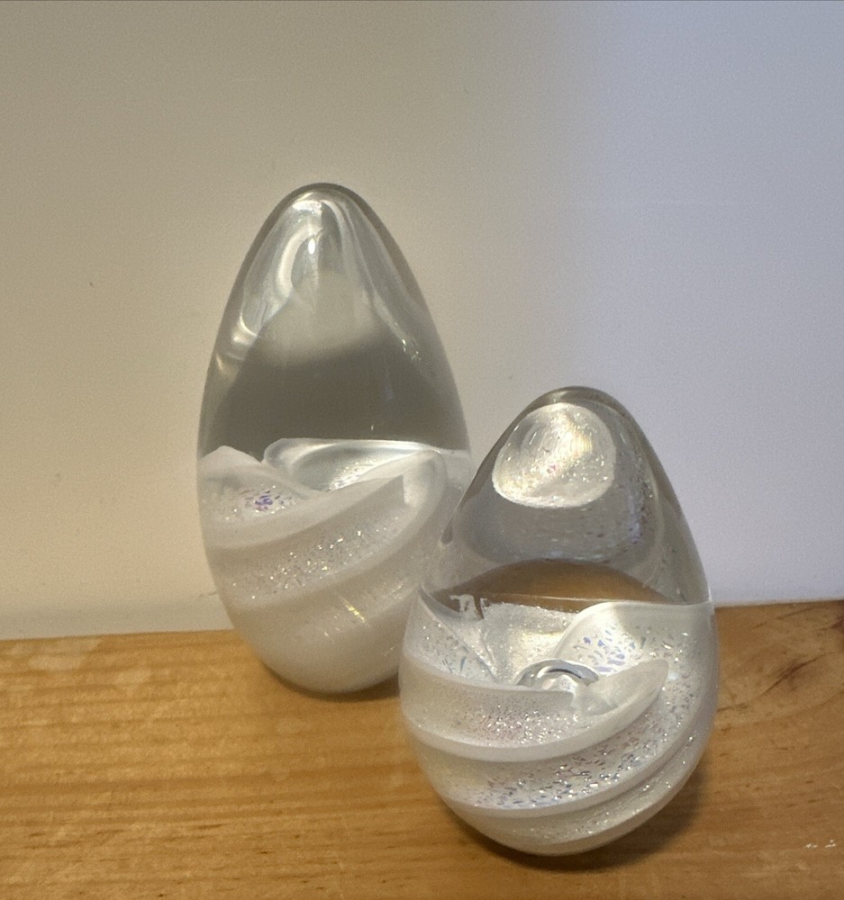 TWO (2) GES Glass Eye Studio Art Glass Egg Shaped Paperweight Glitter 3” & 2”. Thank you for shopping with Thrifting With Bird 🦜....