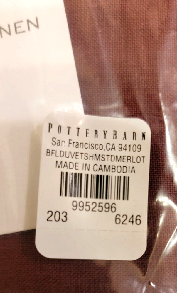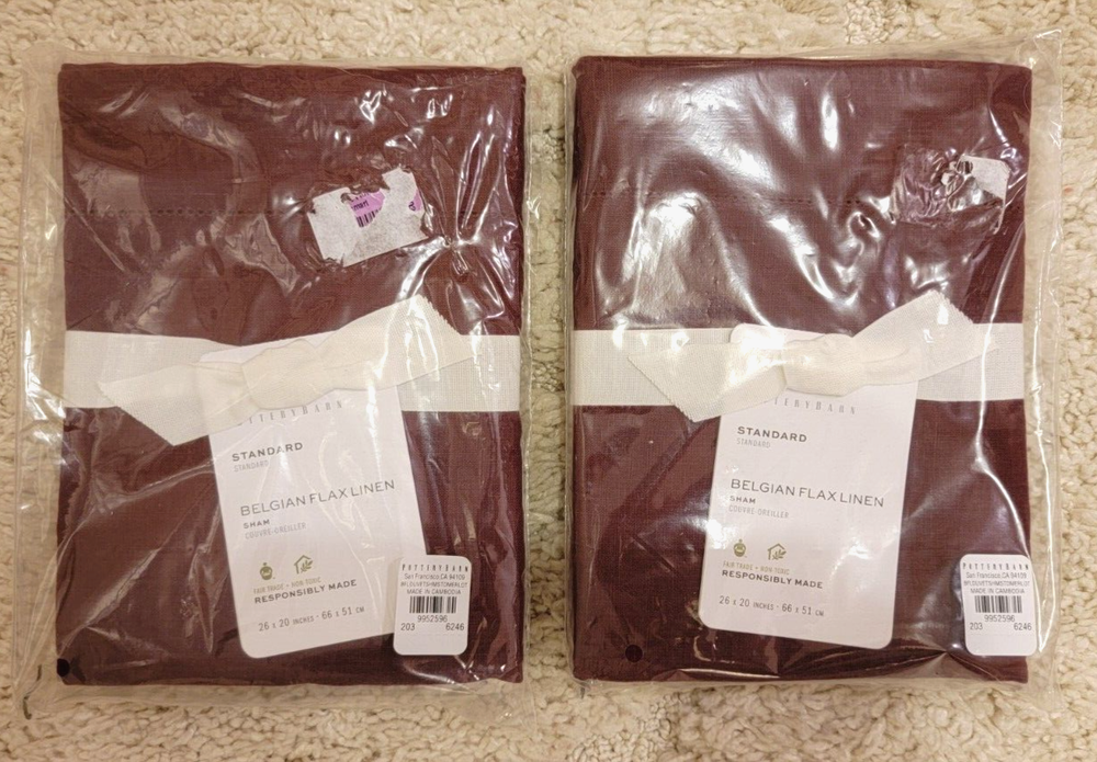 Pottery Barn TWO Pillow Shams BELGIAN FLAX LINEN MERLOT Standard 26" by 20" NEW IN PACKAGING Please note: The packaging may show handling wear and possible remnants of labels that have been removed. "PB: Woven from the world’s finest Belgian flax, our linen bedding is prewashed for incredible softness–and only gets better with time. Lightly textured and cool to the touch, this natural fiber fabric is prized for its durability, breathability, and lived-in look. Proudly made at a Fair Trade Certified™ factory. Natural fibers, like our flax linen, offer beautiful, unique variations in color, ensuring your bedding is one of a kind. Product Details Details Material: Made of 100% Libeco™ linen. Color Durability: Yarn-dyed for long-lasting color. Secure Design: Sham features a side closure. Reversible Design: Reverses to the same. Natural Variation: Color variations are inherent to natural fibers, and slight variations may occur to what is shown online for our Flax color option. Certification and Standards: OEKO-TEX® STANDARD 100 certified, tested for 1000+ harmful substances (14.HUS.42449 HOHENSTEIN HTTI). Made in a Fair Trade Certified™ factory, empowering workers who made it. Components: Shams sold individually. Duvet cover and insert sold separately. Place of Manufacture: Imported. Care Instructions Machine wash in cold water; gentle cycle. Use only non-chlorine bleach when needed. Tumble dry on low heat; remove promptly. Warm iron as needed. Dimensions Standard Shams: 20" w x 26" Please Read Below in Red Please Enlarge Pictures to View Please note: I'm listing many textiles from William Sonoma, Pottery Barn, and West Elm. Many items come without their original packaging or tags. They're mostly new and unused, but possibly, discontinued items, floor models, photoshoot models, samples, returns, mis-marked, close-outs, damaged, etc. Sometimes the hang tags have been removed, there may be felt numbers written on them, almost always in inconspicuous places (interior of a pillow, for example), and I do make every effort to point this out in the listing, along with any other defects that I may find. The textiles that are being sold without packaging may have some smudges, lint, etc. from handling and storage, it is my advice to plan on washing these items prior to using. I look over a lot of textiles, and I may miss something, if I do please let me know, I'm happy to work something out with you :) PLEASE NOTE: I am not affiliated with Williams Sonoma, Pottery Barn, or West Elm, in any way. If shipping is less than the stated price, I do refund the difference . Please view all pictures carefully. All my items are sold as is :) Items ship within 24 hours Monday - Thursday. Items ordered on Friday, Saturday, or Sunday, ship on the following Monday. Please note: I ship from the Oregon Coast, if you're on the East Coast, shipping can be expensive for larger/heavier items. If the FEDEX option is offered in this listing, it will usually be the least expensive shipping option. Thanks For Looking!