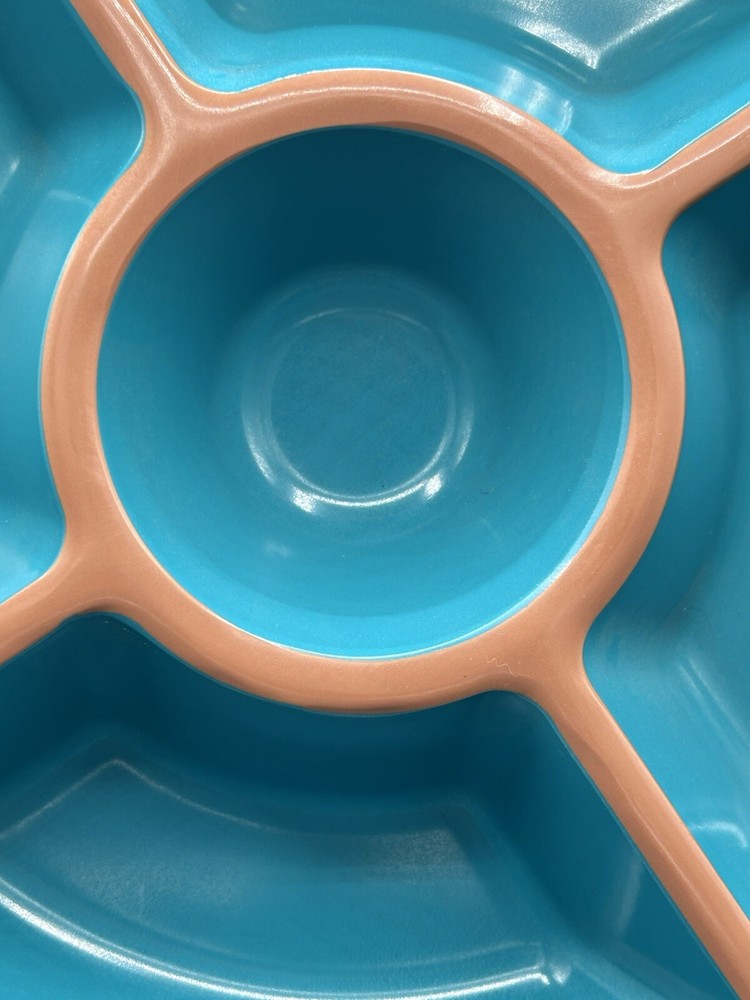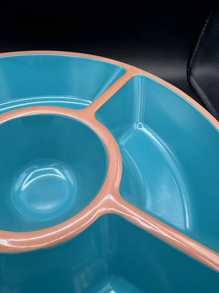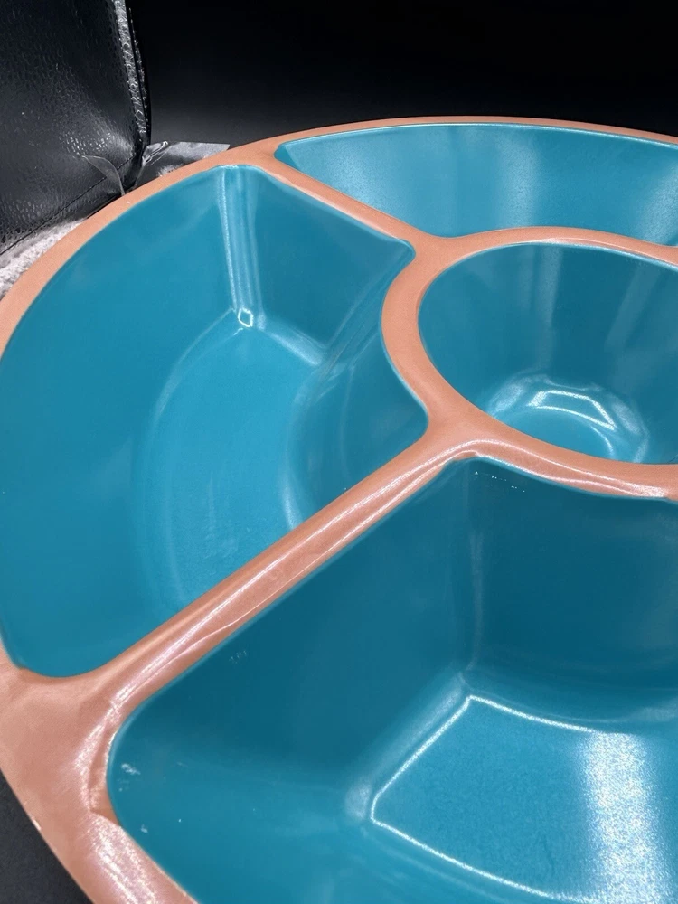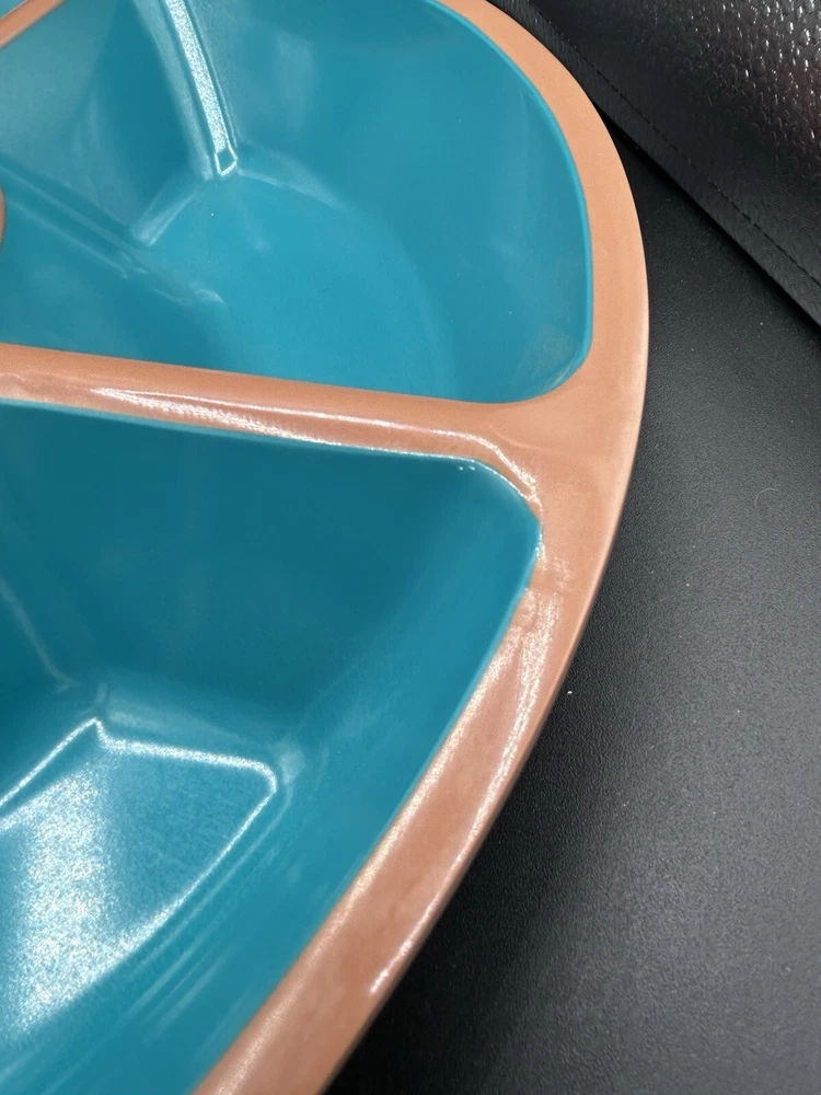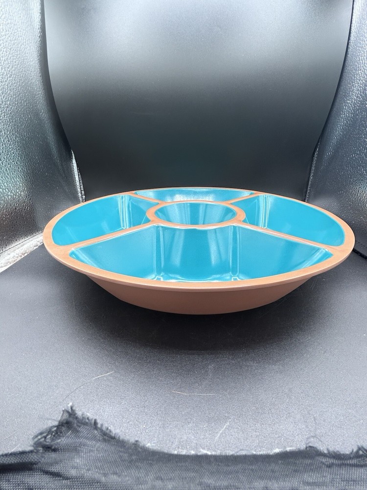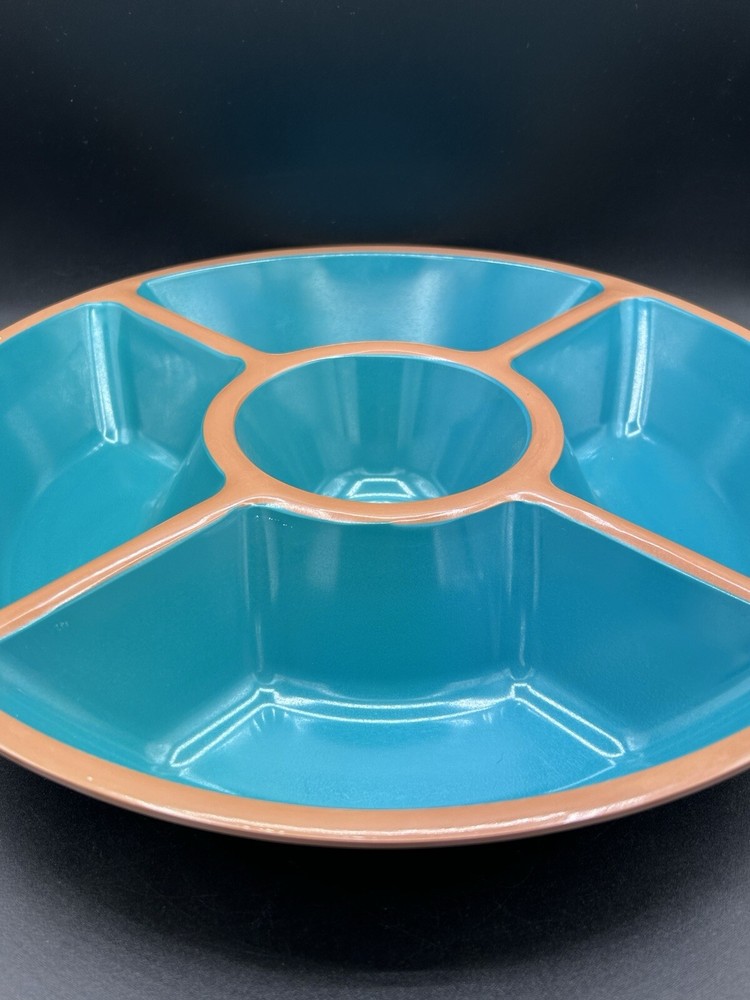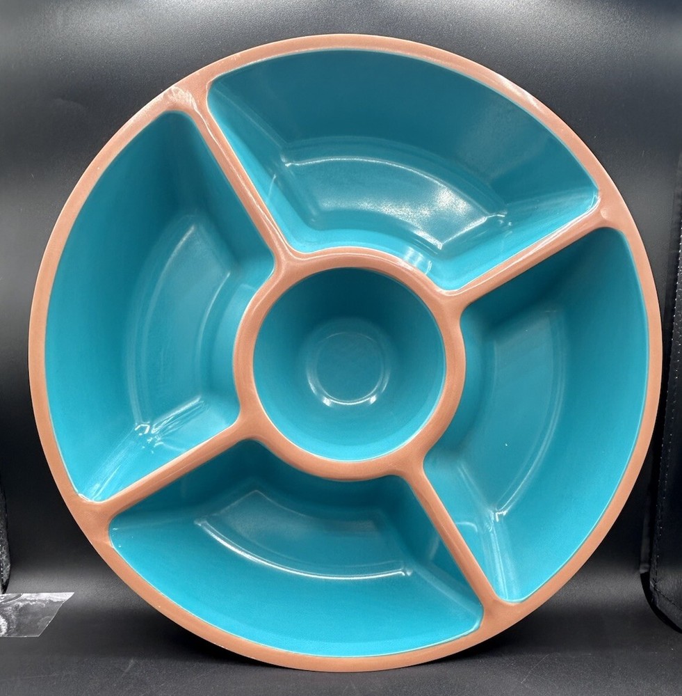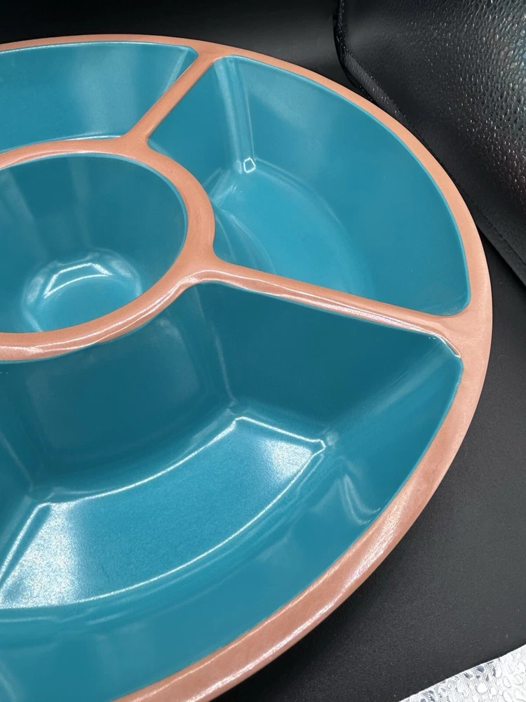This Target Melamine Chip & Dip Tray is a perfect addition to your kitchen collection. The 5-section tray is ideal for serving chips, dips, and other small appetizers. The round tray has a diameter of 15" and 3" deep. It comes in an attractive aqua green and terracotta brown color combination. The tray is made of durable melamine material that is dishwasher safe, making it easy to clean and maintain. It is perfect for all occasions, from casual family gatherings to larger parties. The tray features a dishwasher-safe design and is manufactured in China.