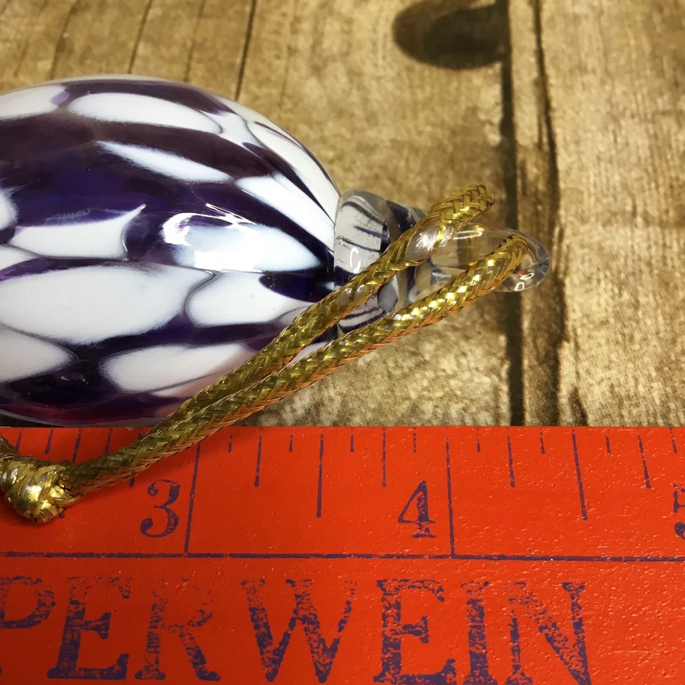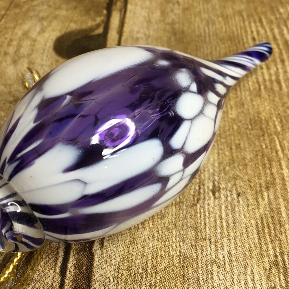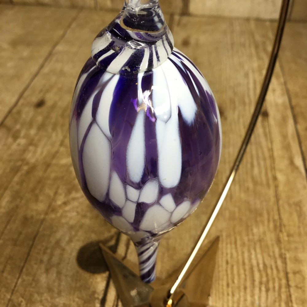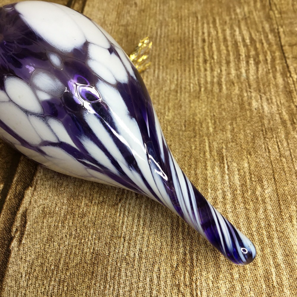 Handblown Teardrop Christmas Ornament Studio Art Glass Purple and White 4” Beautiful blown glass teardrop ornament with shades of purple and white. It is in lovely condition with no chips or breaks. Please view all photos as they are an important part of the des. It measures 4 inches long. The ornament stand is not included and is used for photographing purposes only.