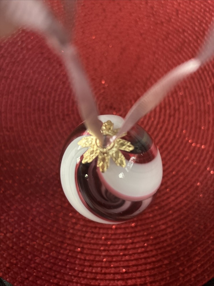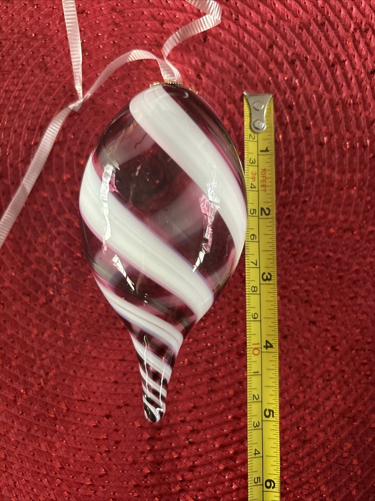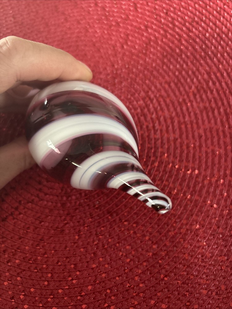 Add a touch of elegance to your Christmas decor with this beautiful teardrop ornament. The unique hand-blown glass design in purple and white gives it a studio art feel. This original, unmarked ornament is 5 inches in height and 4 inches in width, making it the perfect size for hanging and decorative purposes. The teardrop shape adds a festive touch to any Christmas tree or holiday display. This handmade ornament is a one-of-a-kind piece that will surely become a cherished addition to your collection. Get into the holiday spirit with this exquisite Christmas ornament.