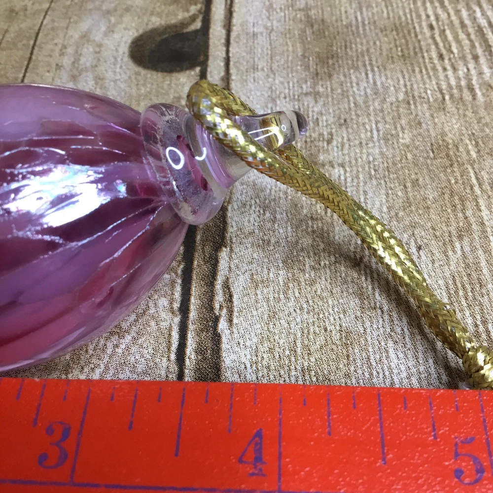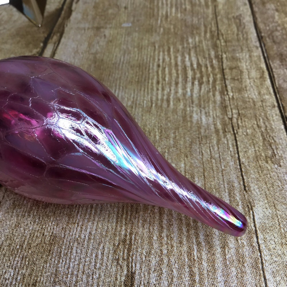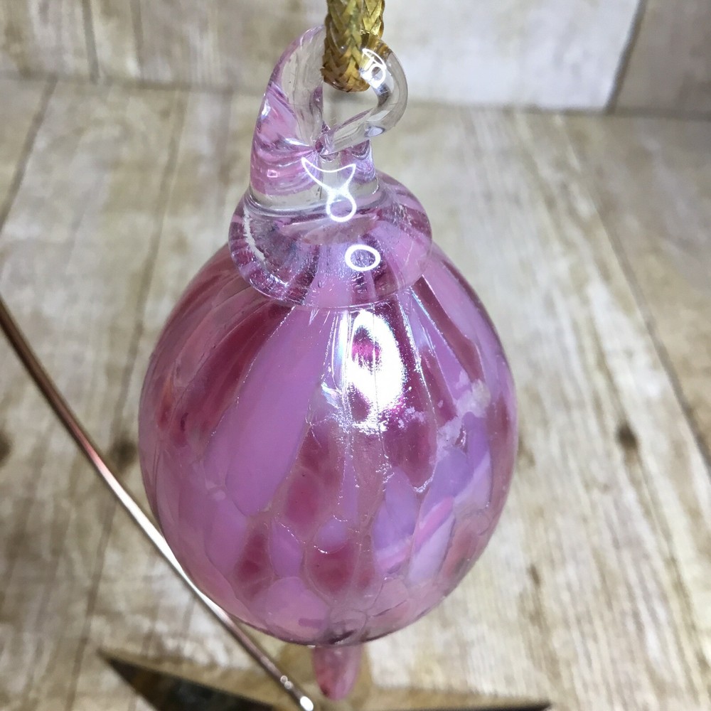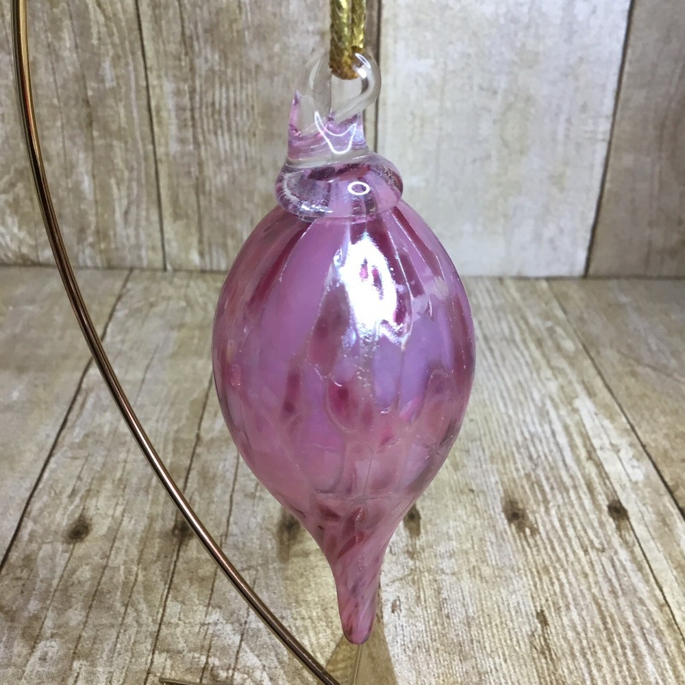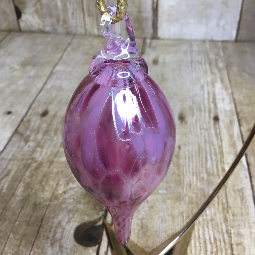 Handblown Teardrop Christmas Ornament Studio Art Glass Pink Purple 4” Beautiful blown glass teardrop ornament with shades of pink and purple. It is in lovely condition with no chips or breaks. Please view all photos as they are an important part of the des. It measures 4 inches long. The ornament stand is not included and is used for photographing purposes only.