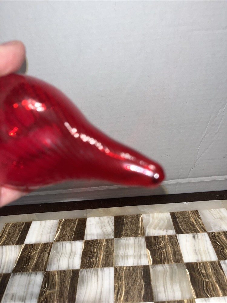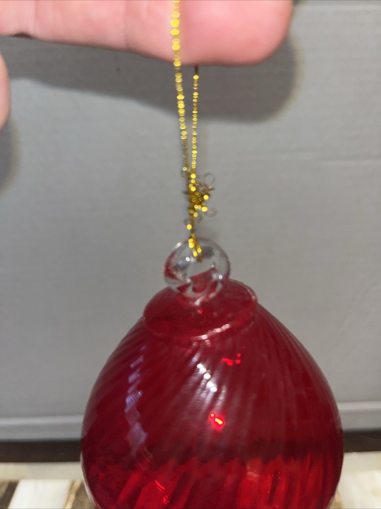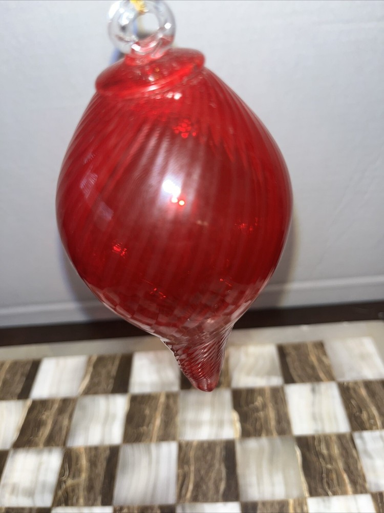 Add a unique touch to your Christmas decor with this beautiful hand blown glass teardrop ornament. The red swirl pattern adds a pop of color and creates a stunning decorative piece. Measuring 5.5 inches in height and 3 inches in width, this unmarked ornament is perfect for hanging on a tree or displaying as a standalone piece. Crafted with care by a skilled artisan, this original piece is sure to become a treasured addition to your collection. The production style of this ornament is art glass and it was created using a hand blown glass production technique. Whether you're looking for a special ornament to cherish or a thoughtful gift for a loved one, this teardrop ornament is sure to impress.