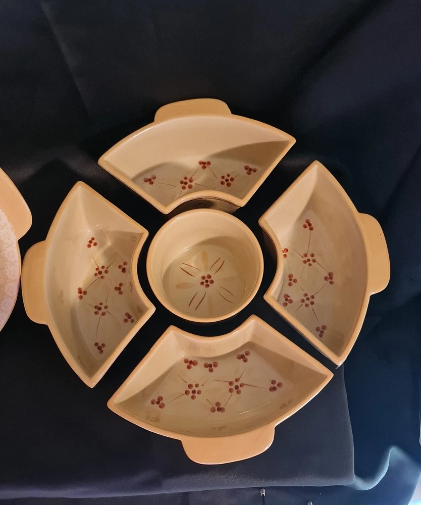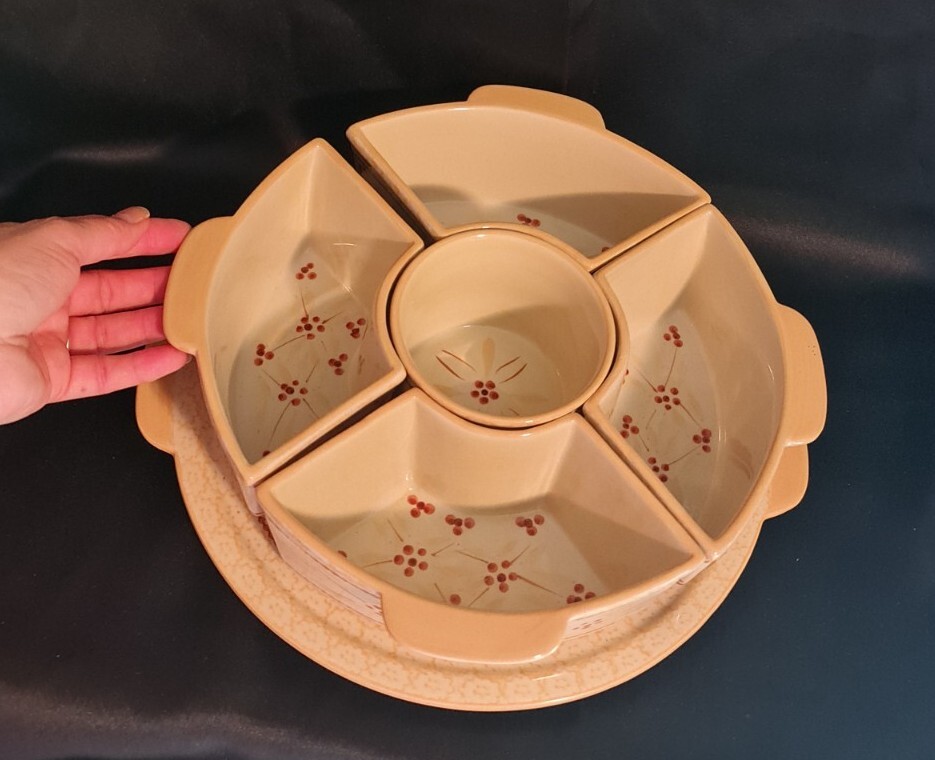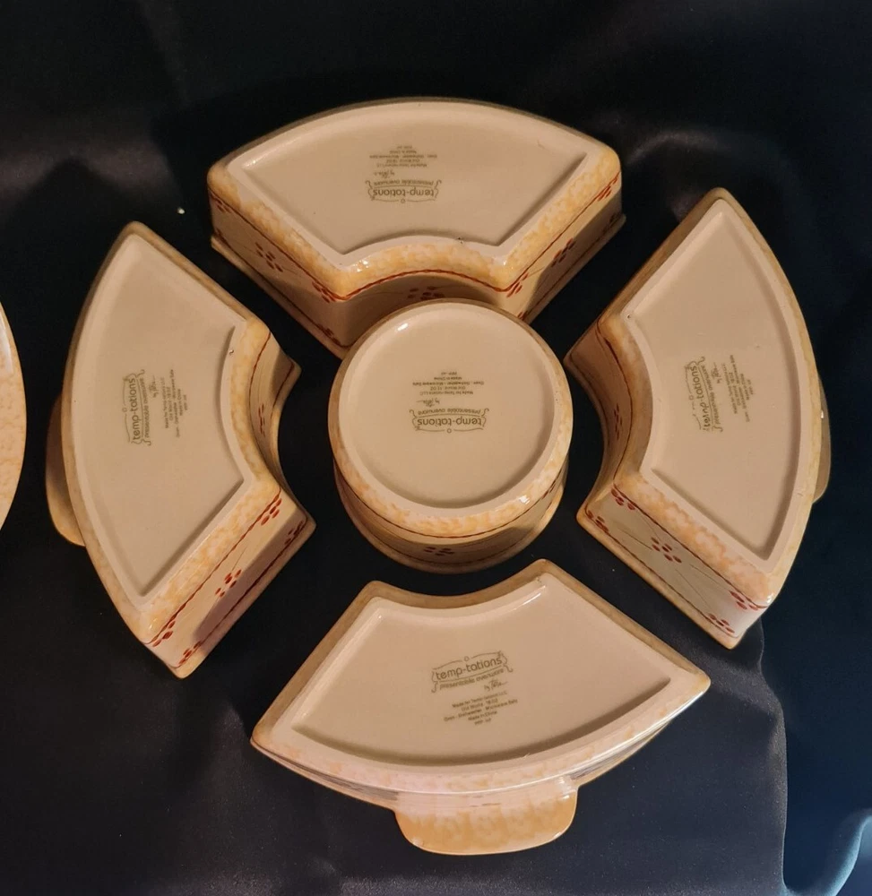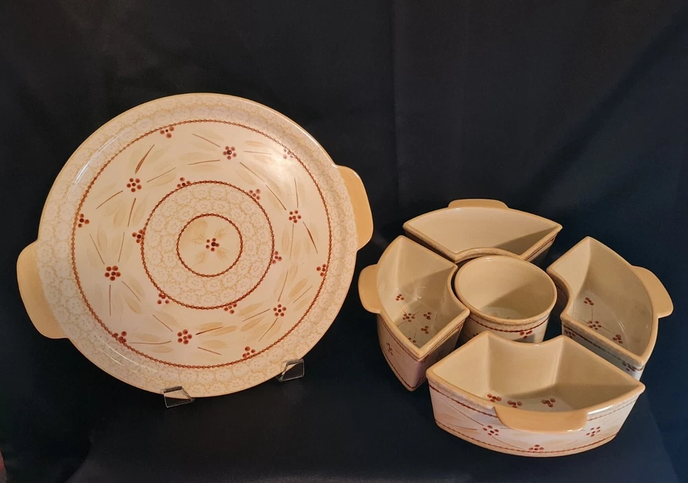 This beautiful Temptations Old World Confetti Veggie Chip Dip Snack Tray set is perfect for any occasion. With a round shape and five compartments, it provides ample space for serving chips, veggies, and dips. The set comes with 6 pieces and features a lovely Botanical theme in a Multicolor pattern. Crafted from high-quality Ceramic and Metal materials, the tray has a glossy finish and is built to last. Measuring approximately 13 inches in diameter and weighing 7 pounds and 2 ounces, this large tray also includes a wire basket that adds to its Art Deco style. Ideal for entertaining guests or just for family gatherings, this Chip Dip Tray set is a must-have for any household.