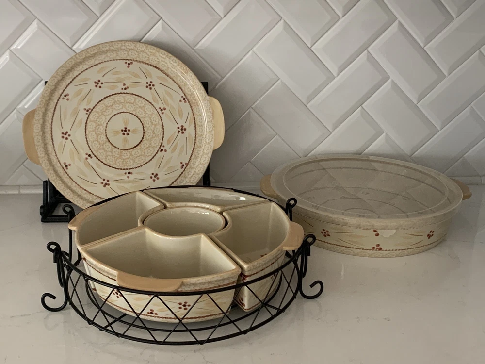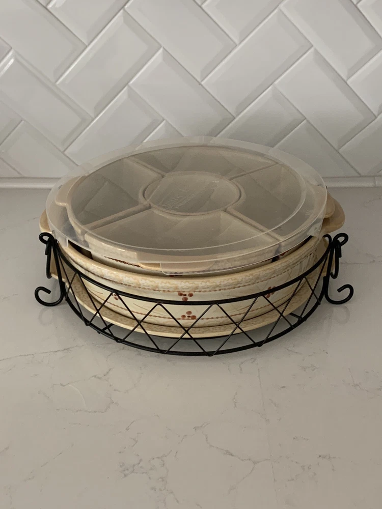 Temp-tations by Tara Serving Set -- 9 pieces cream / light beige color- Old World pattern 13" diameter at widest piece 5 piece fitted vegetable/dip set Baker/Casserole -- 3" deep Round Platter Iron stand with handle plastic lid New condition, never used * 3 shipping options, click next to shipping to see which is most reasonable