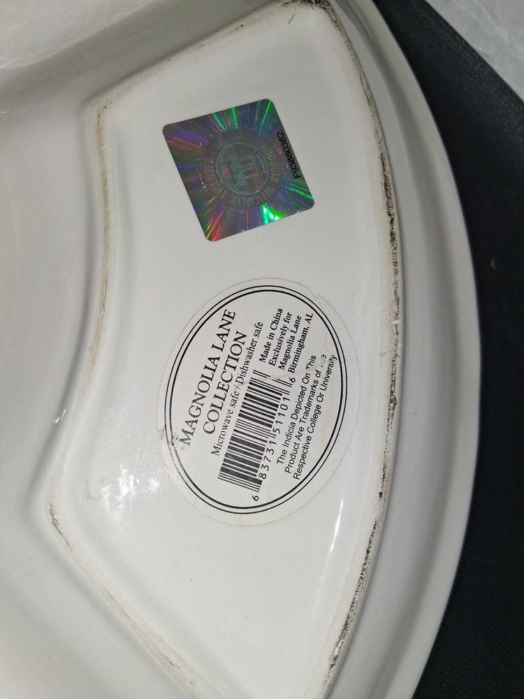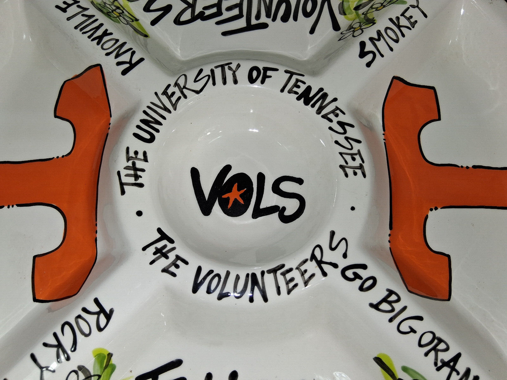 Tennessee Volunteers Large Chip Dip Platter Football NCAA Officially Licensed! Excellent condition! There is a small manufacturing flaw around the rim of the platter. It seems that they did not properly glaze a section of the Chip n Dip bowl. I took a picture, look at the last photo if you want to see what I'm talking about. It's not very noticeable, and it blends into the platter quite well, but you'll notice it's there if you look closely. "Here today, gone tomorrow"