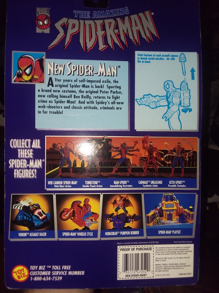 The Amazing NEW SPIDER-MAN Figure w/ Venom Containment Gear 1996 Toy Biz Marvel. As you can see one figure new on card. Please feel free to check out my other auctions, I am totally willing to combine shipping