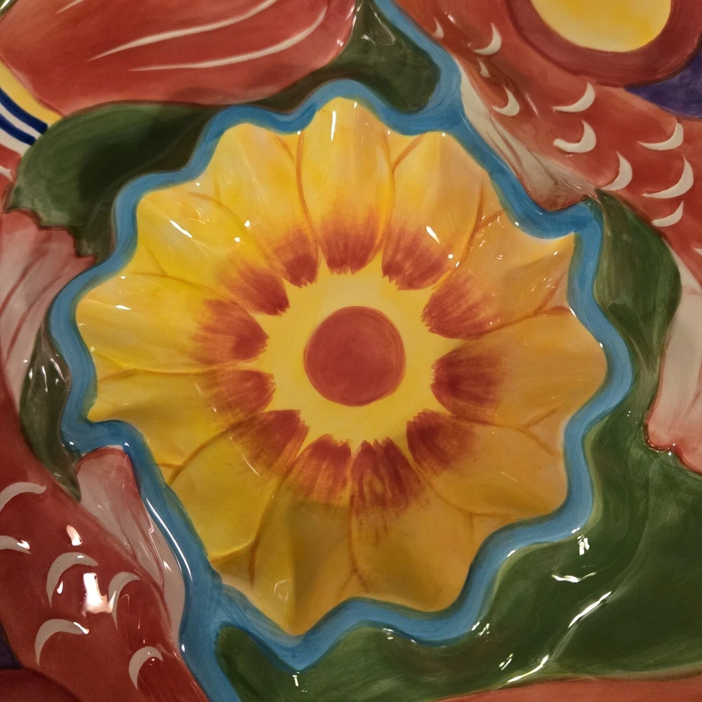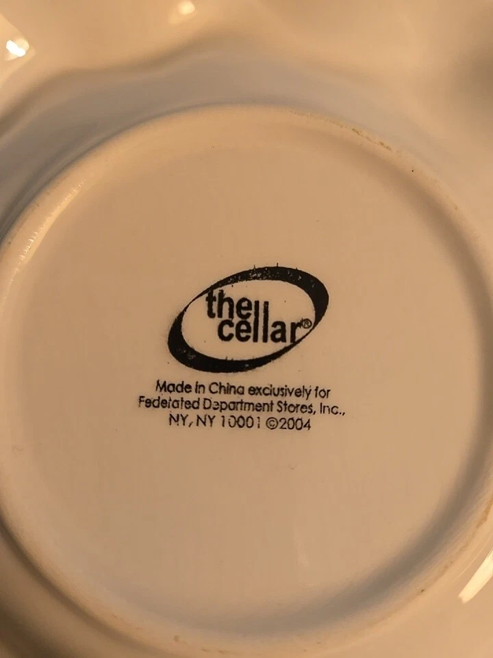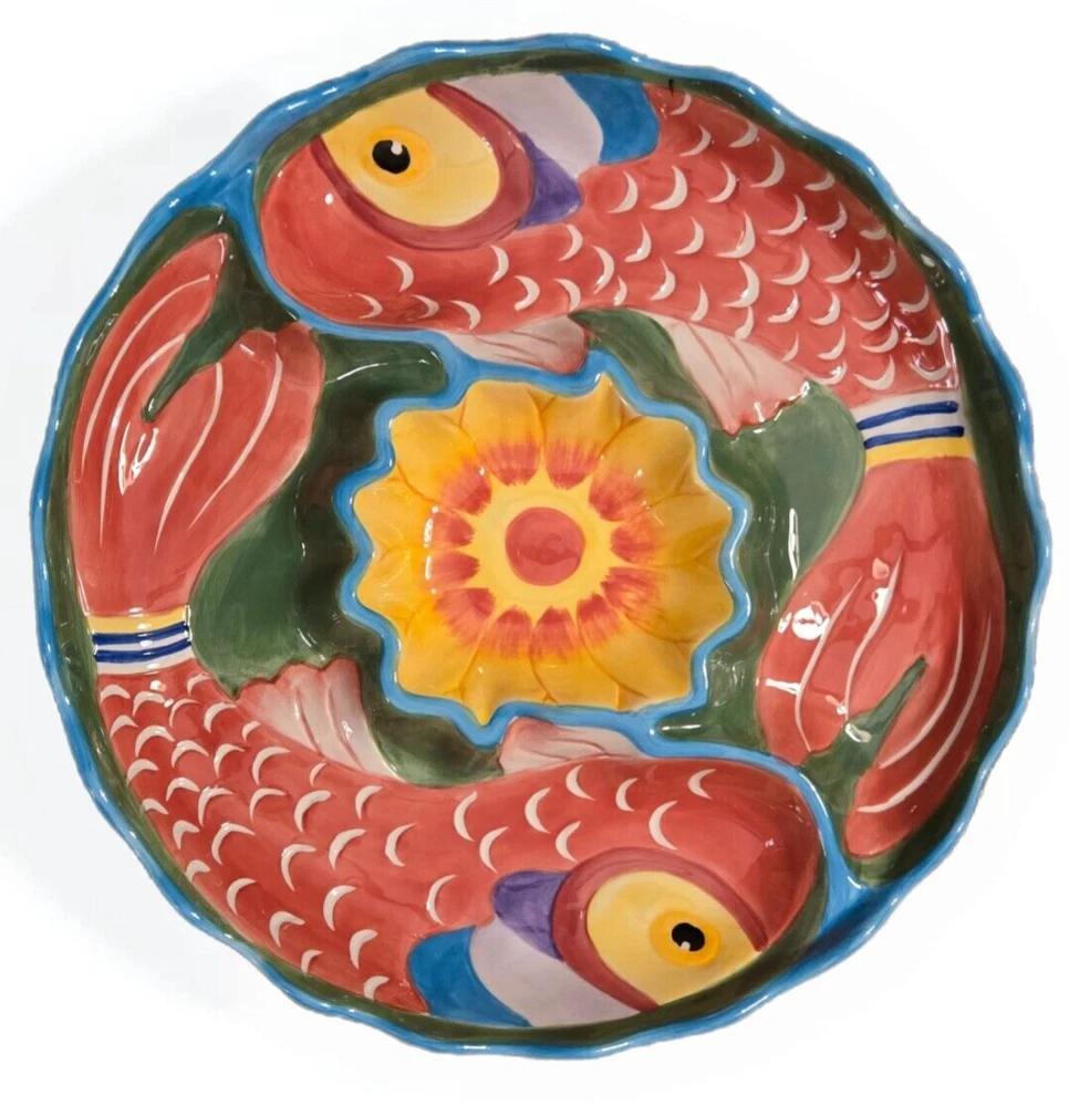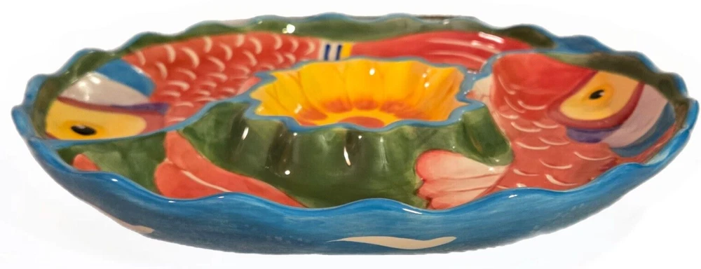 This colorful chip and dip platter from The Cellar features a charming design of a bright yellow flower and two fish, making it a perfect addition to any kitchen or dining room. The round shape and large size of 12.75 inches in width and 41 inches in diameter, with a height of 1.50 inches, make it a great choice for serving snacks. Crafted from porcelain and ceramic materials, this vintage piece is manufactured in China and has a glossy finish. It is recommended to hand wash only and comes unboxed with a printed backstamp. This unique piece with two fish and a flower model is perfect those who love to add a touch of whimsy to their home decor.