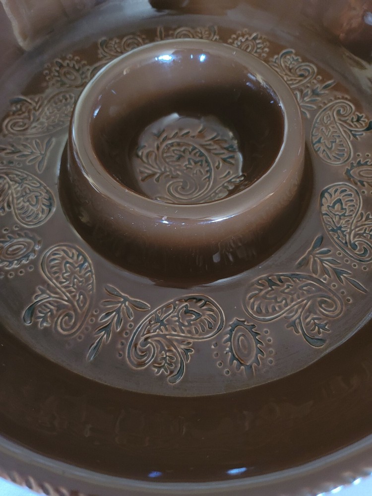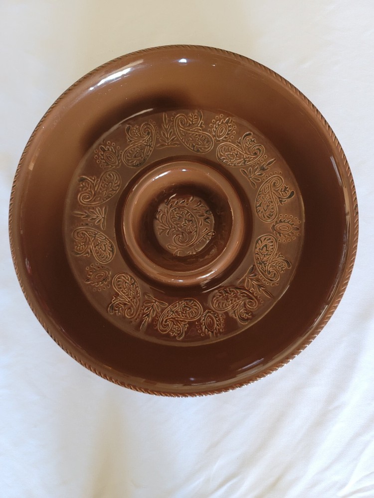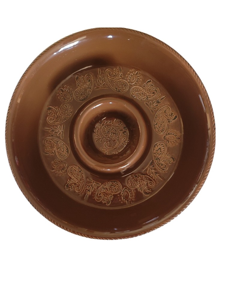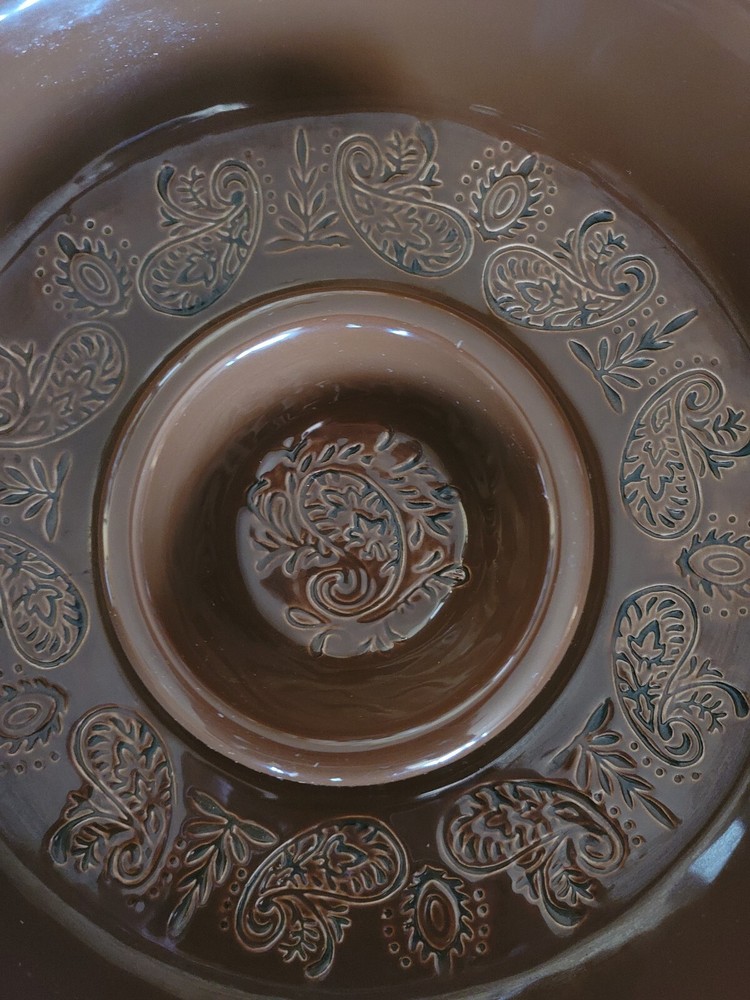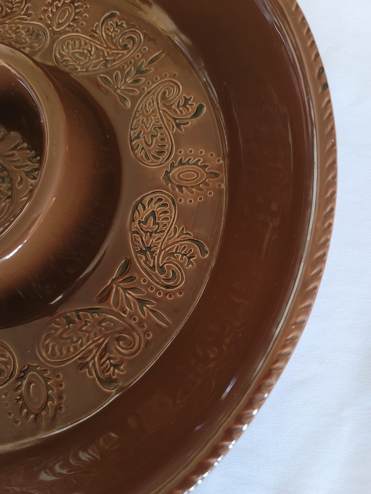 The Main Ingredient chip and dip serving bowl. Rare item. Brown chip and dip serving bowl Paisley design etched in bottom Bowl measures 16" x 2 1/2" Dip server measures 4" x 2"