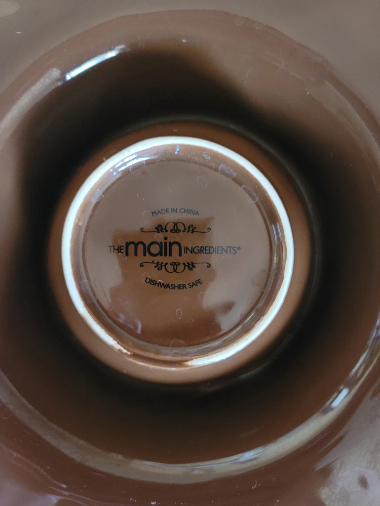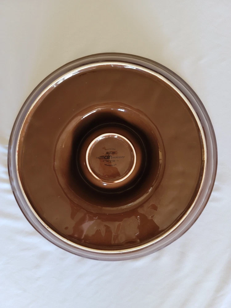 The Main Ingredient chip and dip serving bowl. Rare item. Brown chip and dip serving bowl Paisley design etched in bottom Bowl measures 16" x 2 1/2" Dip server measures 4" x 2"...