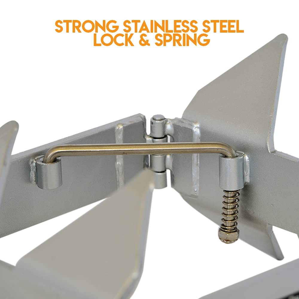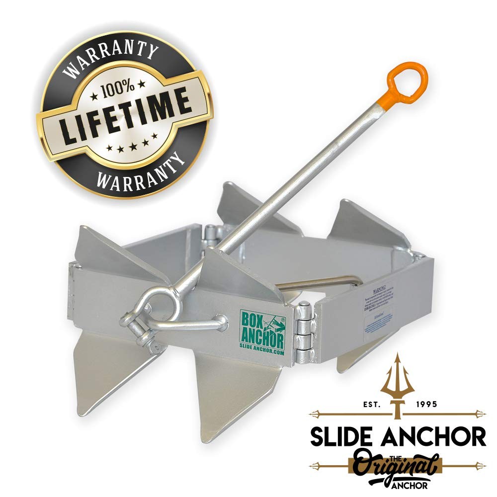Large - Offshore/Sport to 40', Cabin Cruiser to 32' With no chain and a 2 to 1 scope, it's the best and easiest anchor you'll ever buy! The state-of-the-art anchoring system for boats of all sizes and types, in any water. Developed for the most severe water conditions - it requires NO lead chain* ... Half the anchor line of conventional anchors... SETS quickly in almost any bottom condition... retrieves easily... and folds flat for storage! Just toss it and GO... no chains required*, and no powering down! The BOX ANCHOR sets on either side it falls. In deep or shallow water, it's fixed scoop design and narrow side panels set like a "cookie cutter" into sand, mud, grass or rock. Narrow side panels elminate resistance upward for easy retrieval. Wind or current changes are no problem - resets in seconds. The stainless stell stabilizing bar and return spring make quick work of locking the anchor open for use - or collapsing the anchor for compact storage. Hot-dip galvanized with stainless stell hinge pins, stabilizing bar, return spring, and nut for years of corrosion-resistant performance, including in salt water. (*) while the Box Anchor works great offshore, it is advised that when using the Box Anchor offshore to use a length of chain on the anchor in the unprotected waters to compensate for the swell and to further reduce line chaffing. The ORIGINAL Box Anchor by / Large Box Anchor 25lbs/ Hot Dip Galvanized/Boats to 35ft/ Storage bag included
