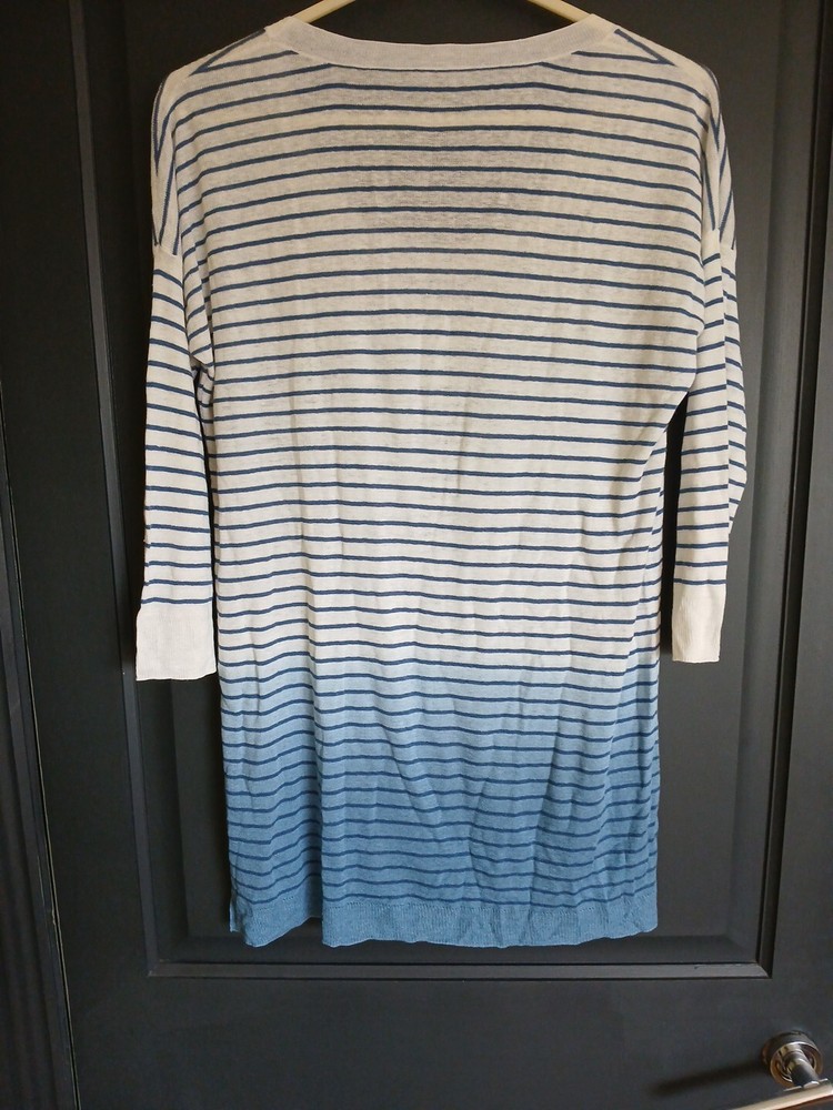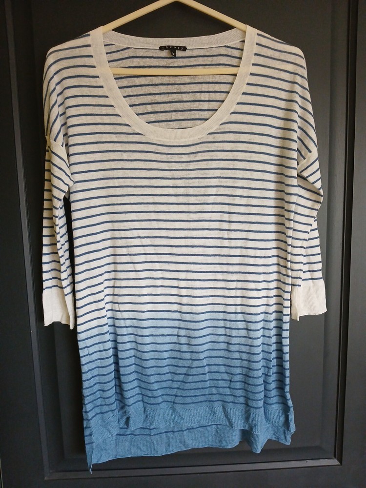 This Theory T-Shirt features a nautical theme with white and blue ombre dip dye stripes. It has 3/4 sleeves and is a size large. Linen mix