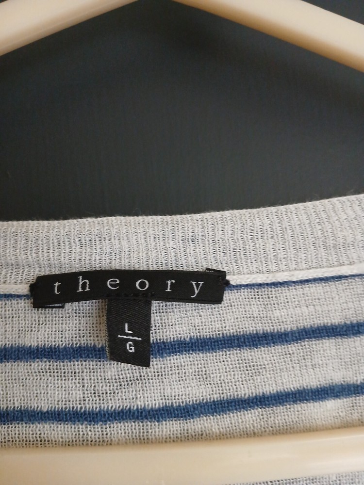 This Theory T-Shirt features a nautical theme with white and blue ombre dip dye stripes. It has 3/4 sleeves and is a size large. Linen mix...