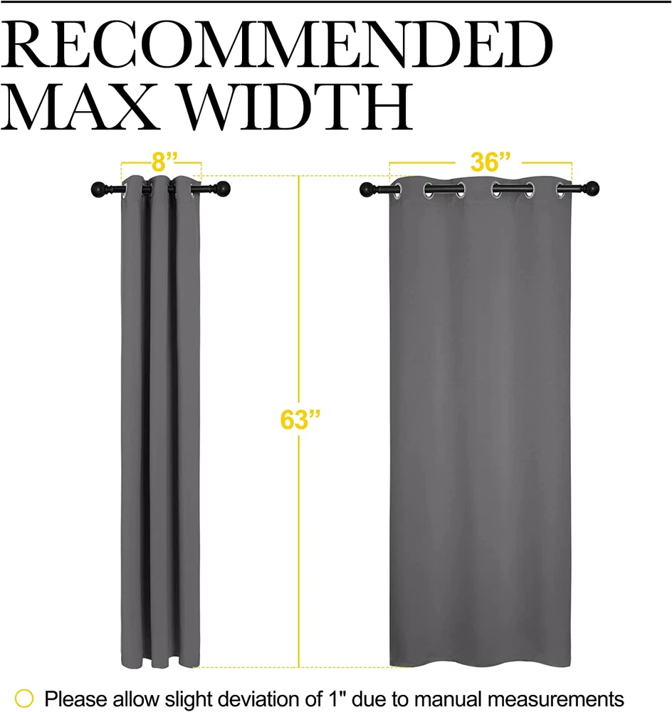 READY MADE: Set includes 2 BLACKOUT CURTAINS PANELS of 42" wide x 63" length with 6 grommets top each. Quality fabric without liner feels soft and heavy. SERVE WELL: Curtains impede 85%-99% light and UV rays(Dark color curtains work well). Noise-reducing, better TV viewing thanks to the innovative triple weave technology. ENERGY SMART: Triple weave blackout fabric balances room temperature by insulating against summer heat and winter chill. Protect your furniture, floors, and artwork from the ravages of the sun, the drapes will pay for themselves off over time. GOOD TO GO: Thread trimmed and wrinkle-free, ring (1.6-inch inner diameter) fits easily with standard curtain rods. All sets for you to put them up right away. EASY TO MAINTAIN: NICETOWN blackout curtains are made to last. Machine washable in cold water, tumble dry. Quick ironing or steam clean when needed. Visiting the NICETOWN store, find out your favorite curtains. Product Description HEAVY-DUTY SILVER RING Suitable for most curtain rods, and easily for hanging and sliding. HIGH DENSITY SUTURE The curtain fabric looks more exquisite and worthwhile. SAME FABRIC FRONT AND BACK The same fabric for both sides makes the curtain a simple style. TRIPLE WEAVE TECHNOLOGY Provide you with a perfect shading performance of about 50%-99% Blackout. DO WELL IN THERMAL INSULATED After insulating with the curtain, the temperature drops a lot. 1 SILVER GROMMET 2 HIGH DENSITY SUTURE 3 FRONT AND BACK 4 TRIPLE WEAVE FABRIC 5 THERMAL INSULATED TYPES OF CURTAIN TOP FOR NICETOWN BLACKOUT CURTAIN GROMMET TOP Make curtain orderly, easy to install and slide, so that let the room elegant. Recommended with no greater than a 1.6-inch rod for maximum movement. ROD POCKET Make some small pleats that give a feeling of cozy and classic. Recommended with no greater than a 1.7-inch rod for maximum movement. BACK TAB Give 3 options to hang curtains which is a perfect choice for window decoration. Recommended with no greater than a 1.7-inch rod for maximum movement. TOP TAB Creates casual elegance for your house, which makes the curtains easy to install and slide. Recommended with no greater than a 1.9-inch rod for maximum movement. TWIST TAB Not only creates rich, deep folds for a professional look, but also makes this panel easy to hang, open and close. Recommended with no greater than a 1.9-inch rod for maximum movement. PINCH PLEATED More gathered than other headings and have permanent sewn-in pleats for a more luxurious. Recommended with no greater than a 1.9-inch rod for maximum movement. CLASSIC AND POPULAR COLOR RECOMMENDATIONS COLOR SHADING DISPLAY THE COLOR OF THE ACTUAL ITEM MAY VARY SLIGHTLY IN DIFFERENT ENVIRONMENT Differernt Curtains in NICETOWN Top Style Grommet Grommet Rod Pocket /Back Tab/Hook Belt Grommet Grommet Grommet Rod Pocket & Back Tab Texture Triple Weave Triple Weave Triple Weave Thick True Linen Faux Linen Soft Voile Sheer Thick True Linen Privacy Performance √√√√√ (Total Privacy) √√√√√ (Total Privacy) √√√√√ (Total Privacy) √√√√ √√√ (Semi Sheer) √ (Transparent) √√√√ Blackout Performance ✔ ✔ ✔ ✘ ✘ ✘ ✘ Quantity 2 Panels 1 Panel 2 Panels 2 Panels 2 Panels 2 Panels 2 Panels