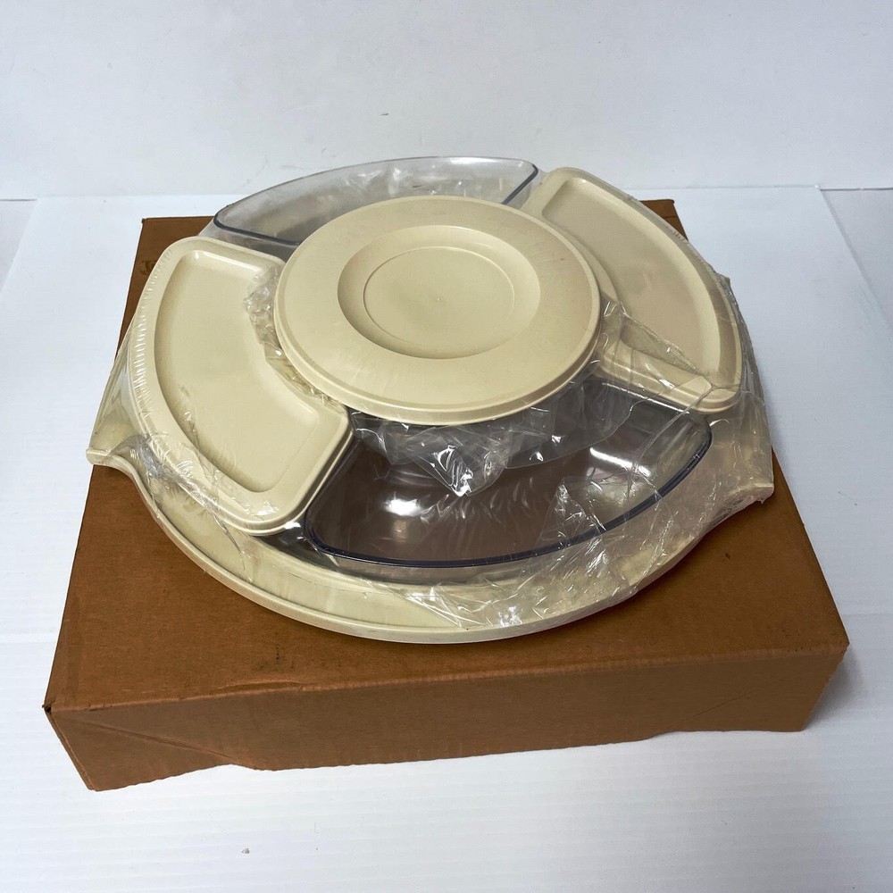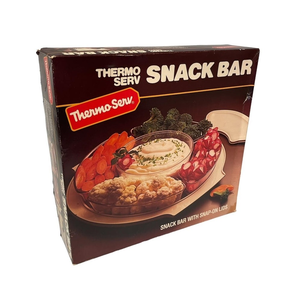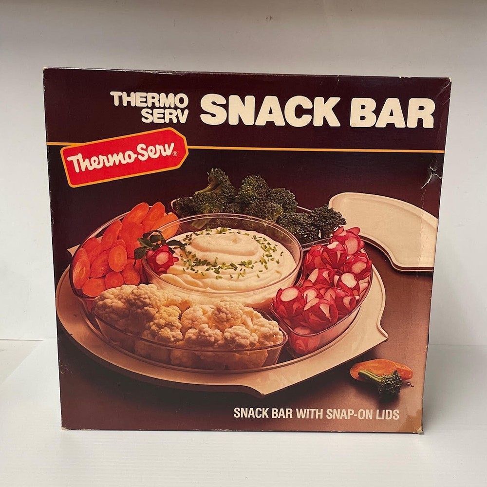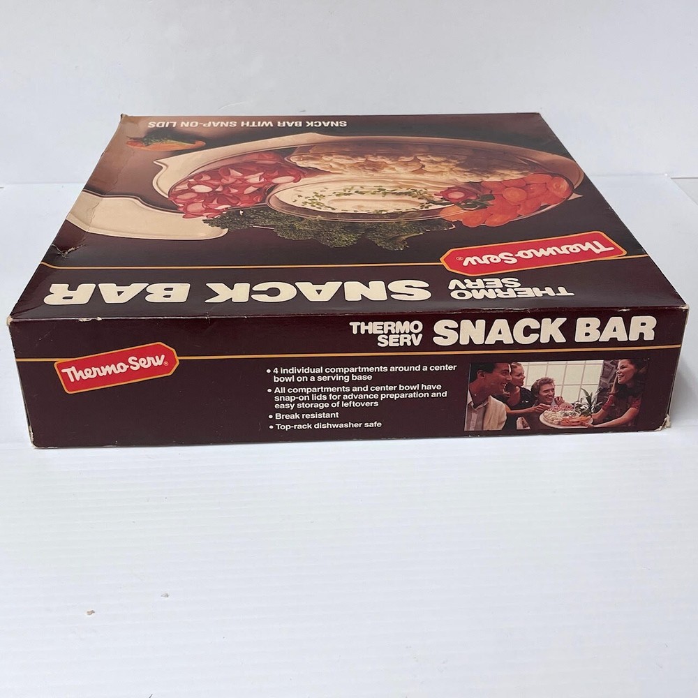 This Thermo Serv snack bar serving set is a vintage gem from the 1980s. The set includes four compartments in a large beige plastic container, with a center bowl for sauces or dips and all come with plastic snap on lids. The set is new in its original packaging and original box. The set is dishwasher safe for easy cleaning. This Thermo Serv serving set is a nostalgic and useful item that is sure to grab attention. Genuine Thermo Serv Snack Bar Comes with 4 compartments for vegies, fruit or condiments Also comes with a center bowl for dips or sauces etc All come with snap on lids Top rack dishwasher safe Ships fast from a smoke/pet-free environment *This item will process and ship within 24 hours of payment (business days/hours) or you get it for Free!*