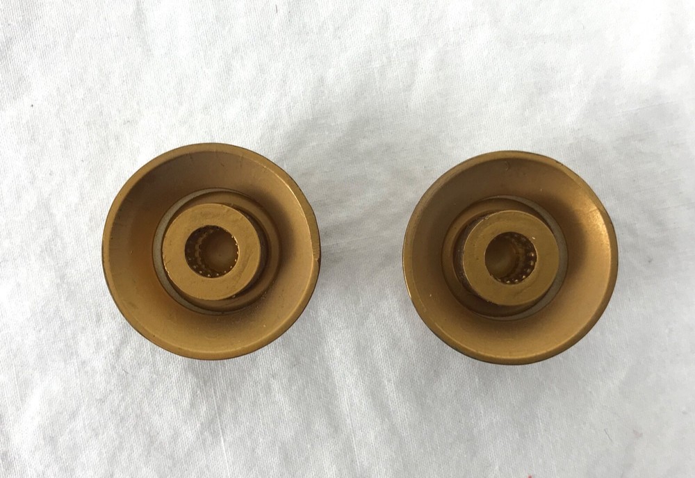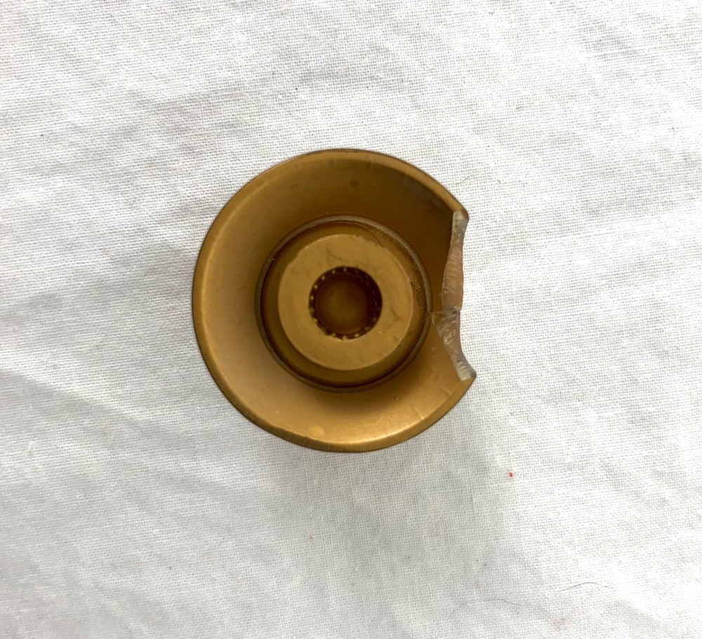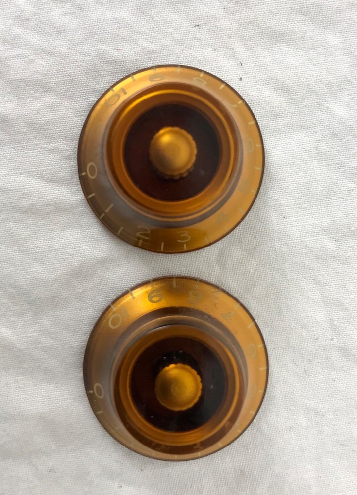 These three knobs came off a 2001 Hamer Studio electric guitar. They are DiMarzio bell knobs. They are dark honey gold in color. One of them has a chip off the side....