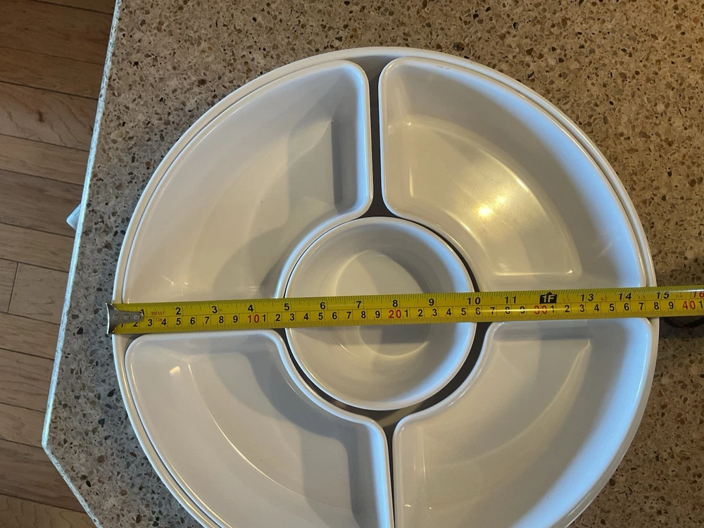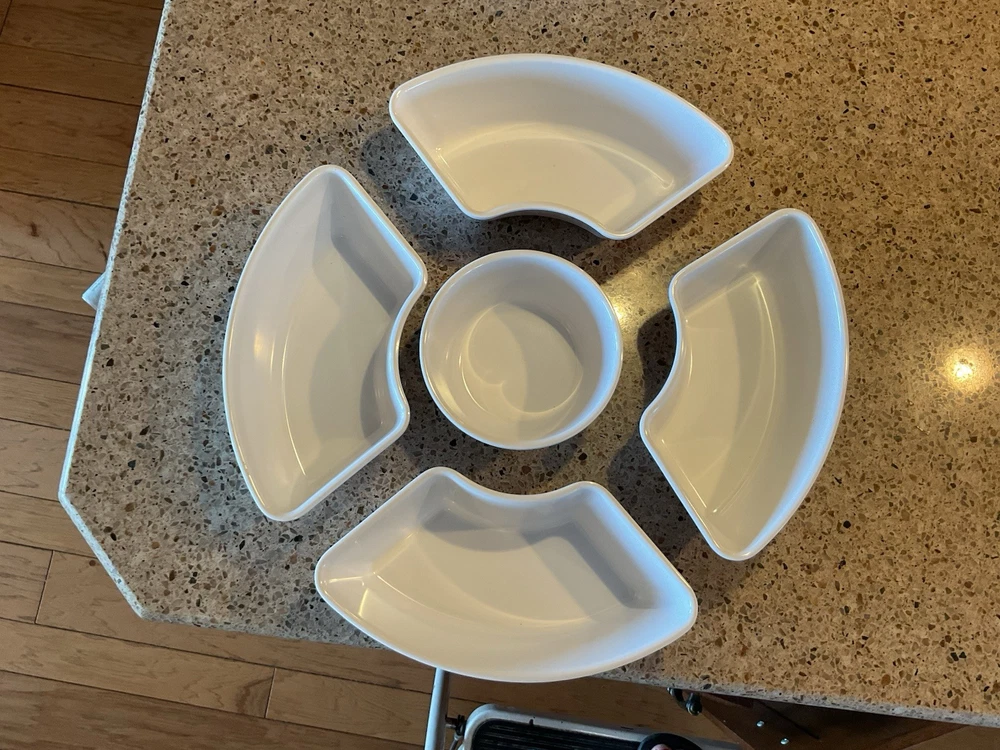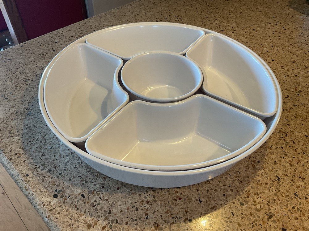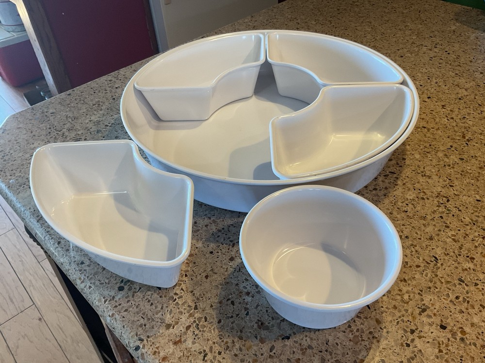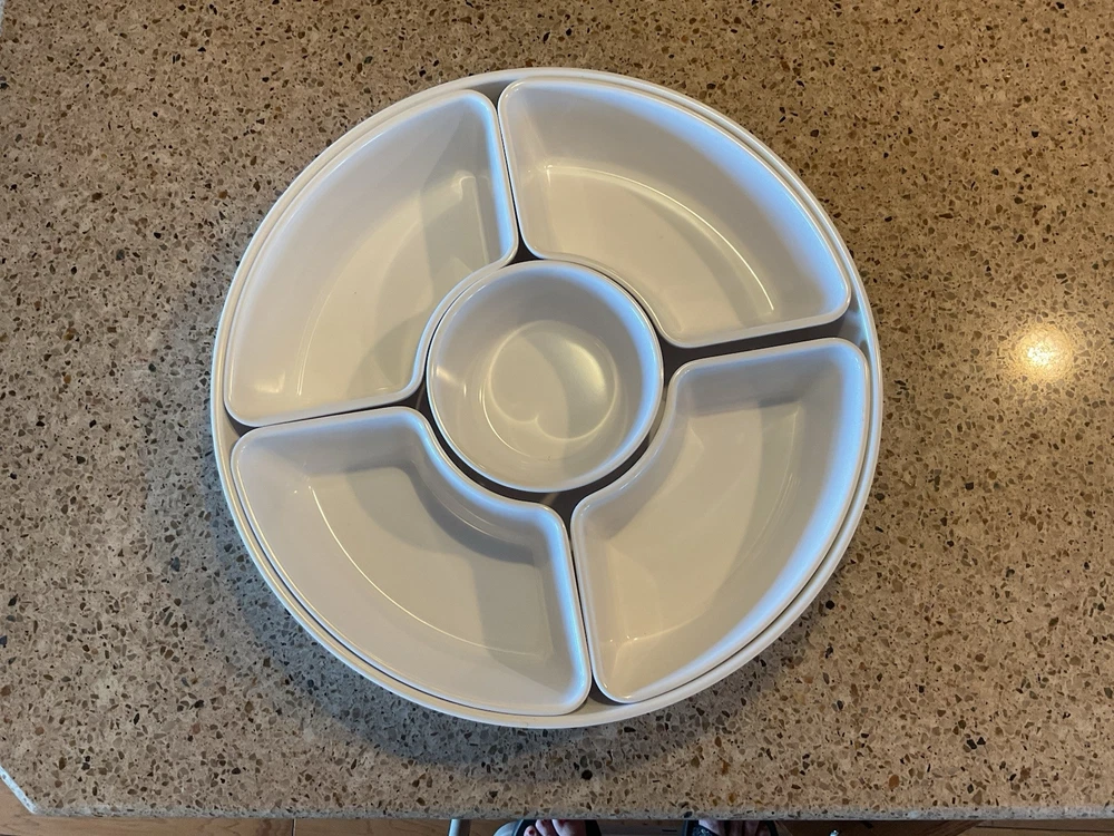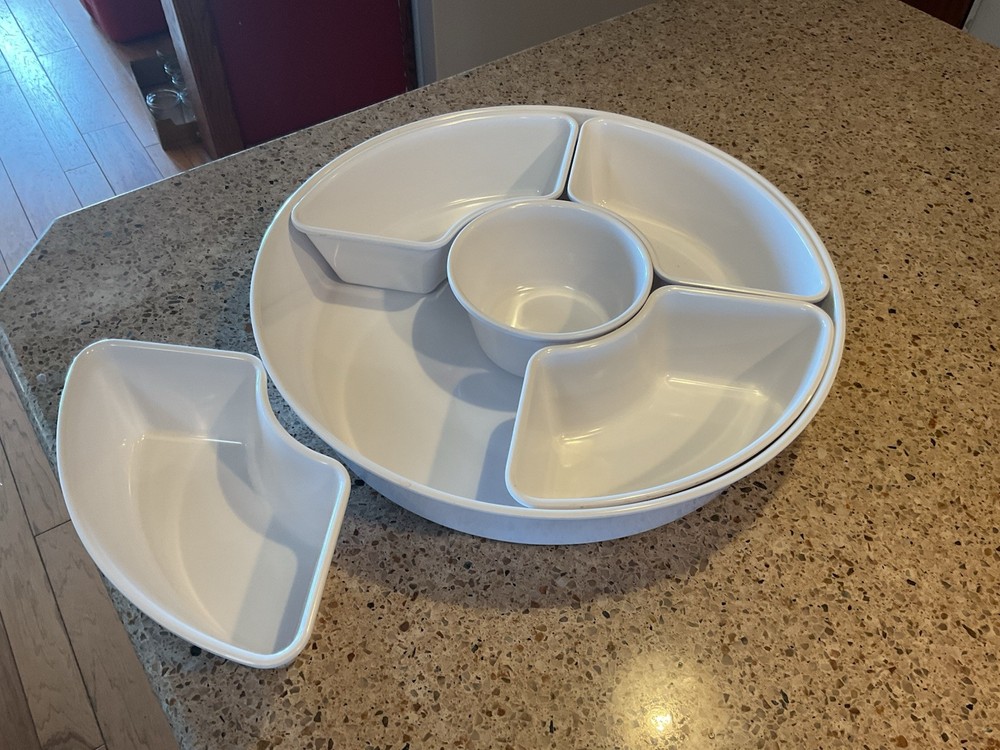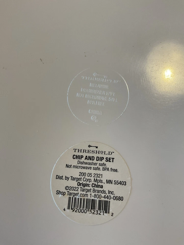 The Threshold 6pc Chip & Dip Set includes a large round serving platter and 5 compartments, all made of durable melamine material in a shiny white finish. The set is designed for all occasions, featuring a total item diameter of 15 inches and a weight of 2.16 lbs. The set is easy to fill and dishwasher safe, making it convenient for serving a variety of snacks and dips. The brand of this serving set is Threshold, and it is manufactured in China. FAST SHIPPING! Thanks for looking 😊