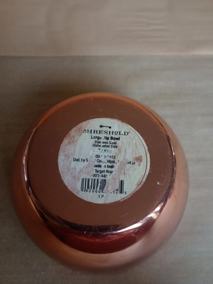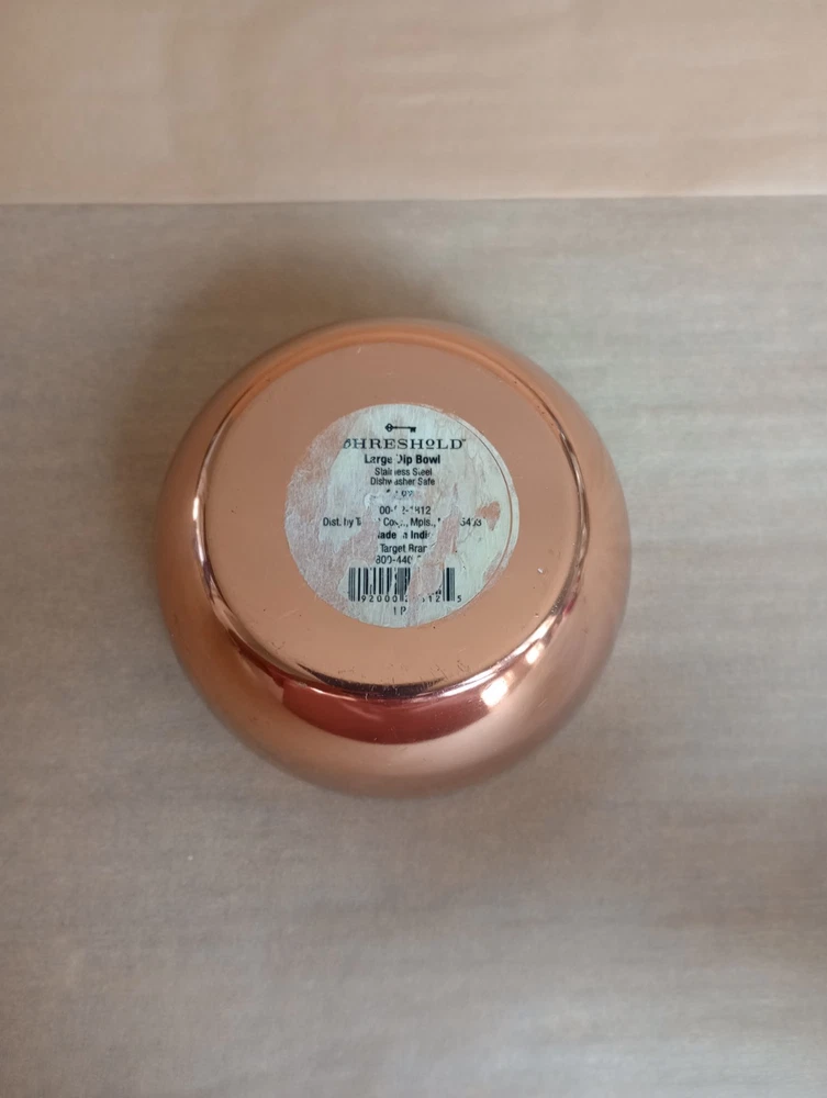 Upgrade your entertaining essentials with the Threshold Large Dip Bowl, crafted from durable stainless steel that mimics the elegance of copper or rose gold. With a 4 1/2 inch diameter and a matching depth of 2 1/2 inches, this bowl is perfectly sized for all occasions, whether it's a cozy family gathering or a lavish party. The bowl's solid pattern and round shape provide a sophisticated backdrop for your favorite dips and sauces. Designed with convenience in mind, this Threshold dipping bowl is dishwasher safe, making cleanup a breeze. Enjoy the seamless blend of functionality and style for your next event. *wear and tear marks * scratches *pre-owned *used * no returns