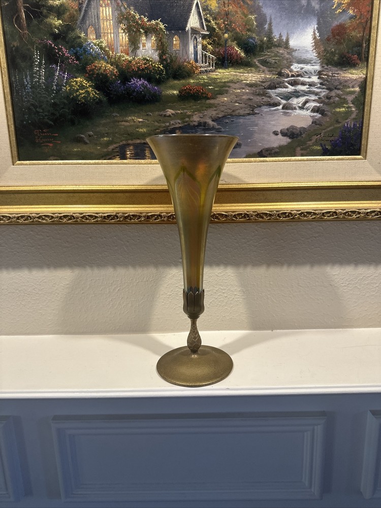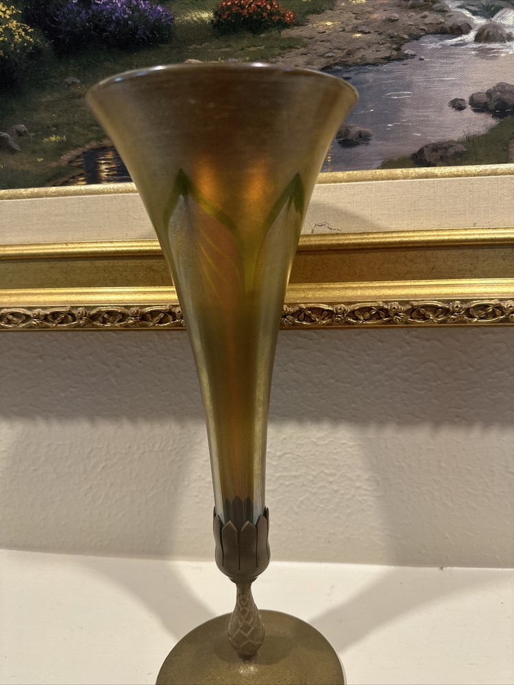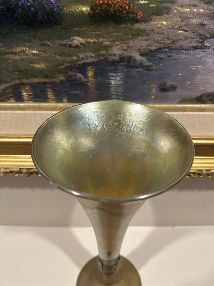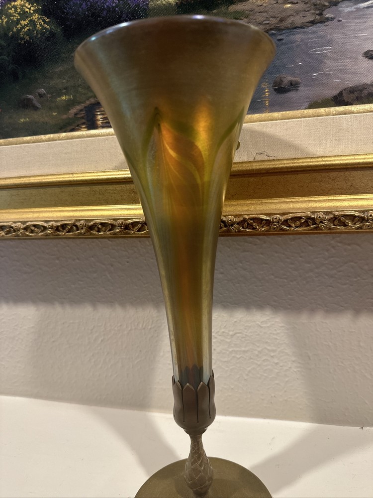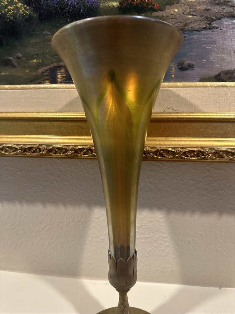 Tiffany Studios Favrile Pulled Feather Trumpet Vase. An excellent authentic example of Tiffany Favrile glass. Has a slight lean and a few bent prongs on base. Has a line on interior of trumpet from manufacture. This is NOT a crack and does not extend through the glass. It’s just on the interior surface. Has what could possibly be a small chip on the socket part that connects to the brass base, but there’s polishing around it, so it could have also been roughness from manufacture when the pontil rod was snapped off. No other condition issues to note. I tried to be super picky because of how nice of a piece this is.