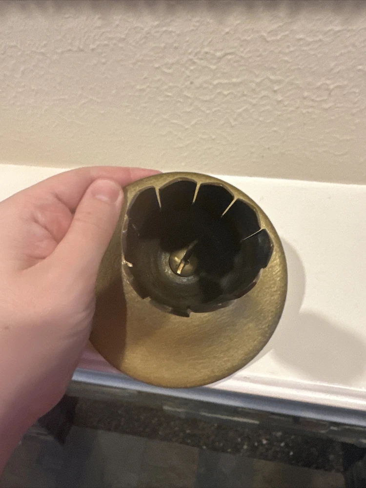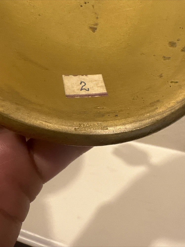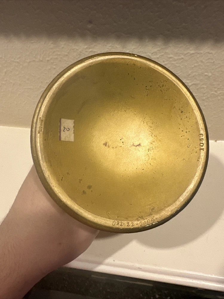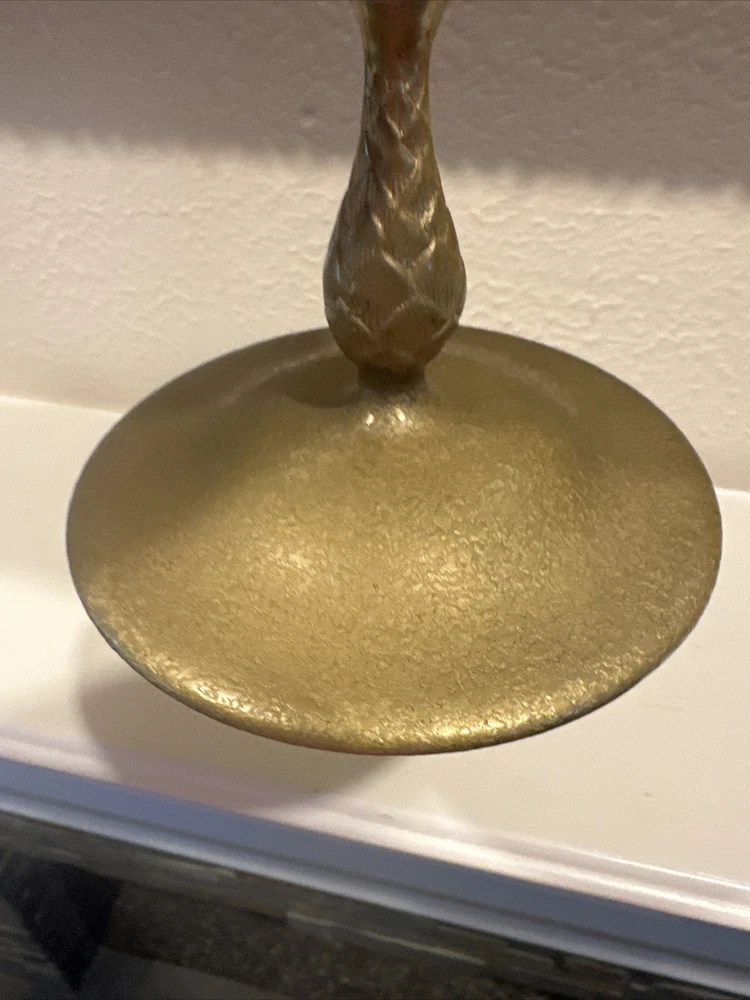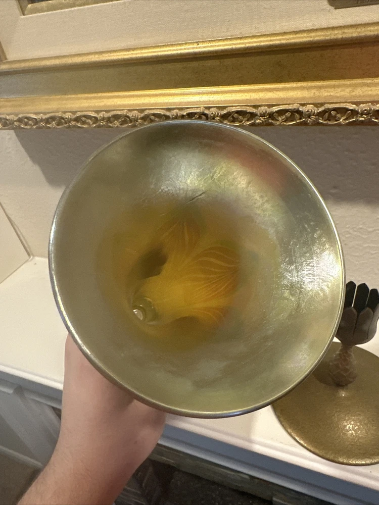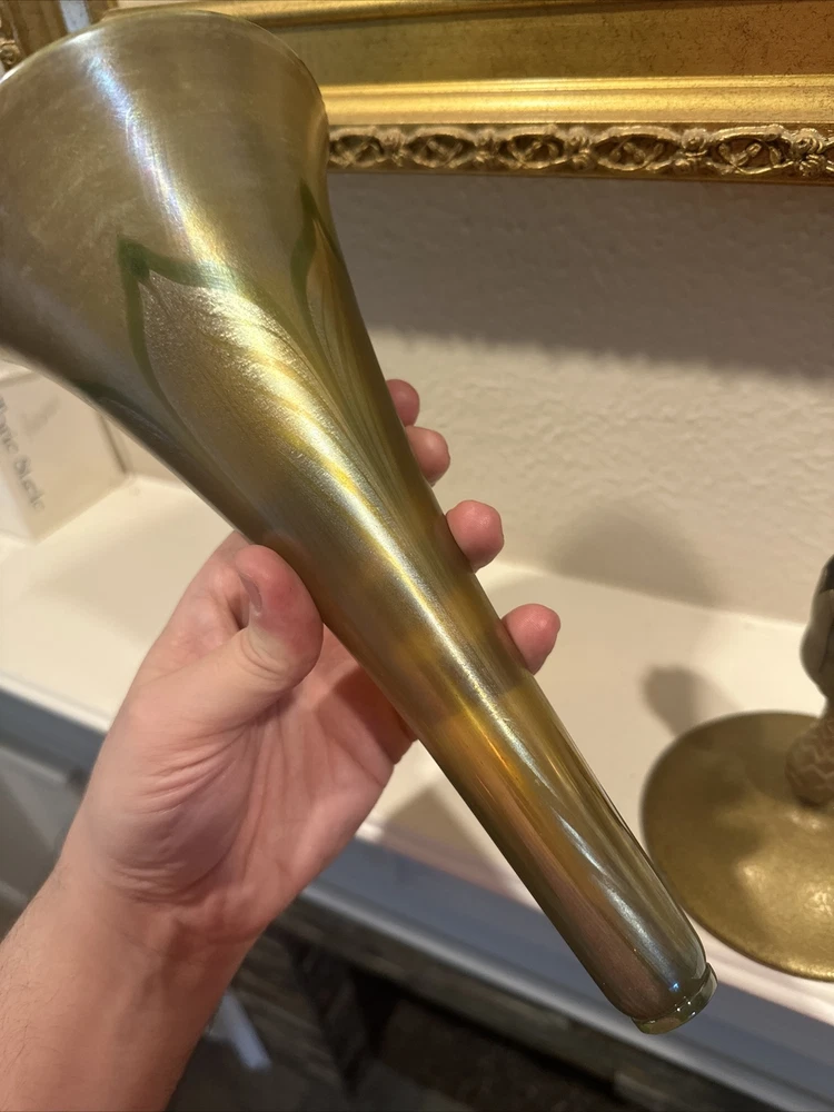 Tiffany Studios Favrile Pulled Feather Trumpet Vase. An excellent authentic example of Tiffany Favrile glass. Has a slight lean and a few bent prongs on base. Has a line on interior of trumpet from manufacture. This is NOT a crack and does not extend through the glass. It’s just on the interior surface. Has what could possibly be a small chip on the socket part that connects to the brass base, but there’s polishing around it, so it could have also been roughness from manufacture when the pontil rod was snapped off. No other condition issues to note. I tried to be super picky because of how nice of a piece this is.
