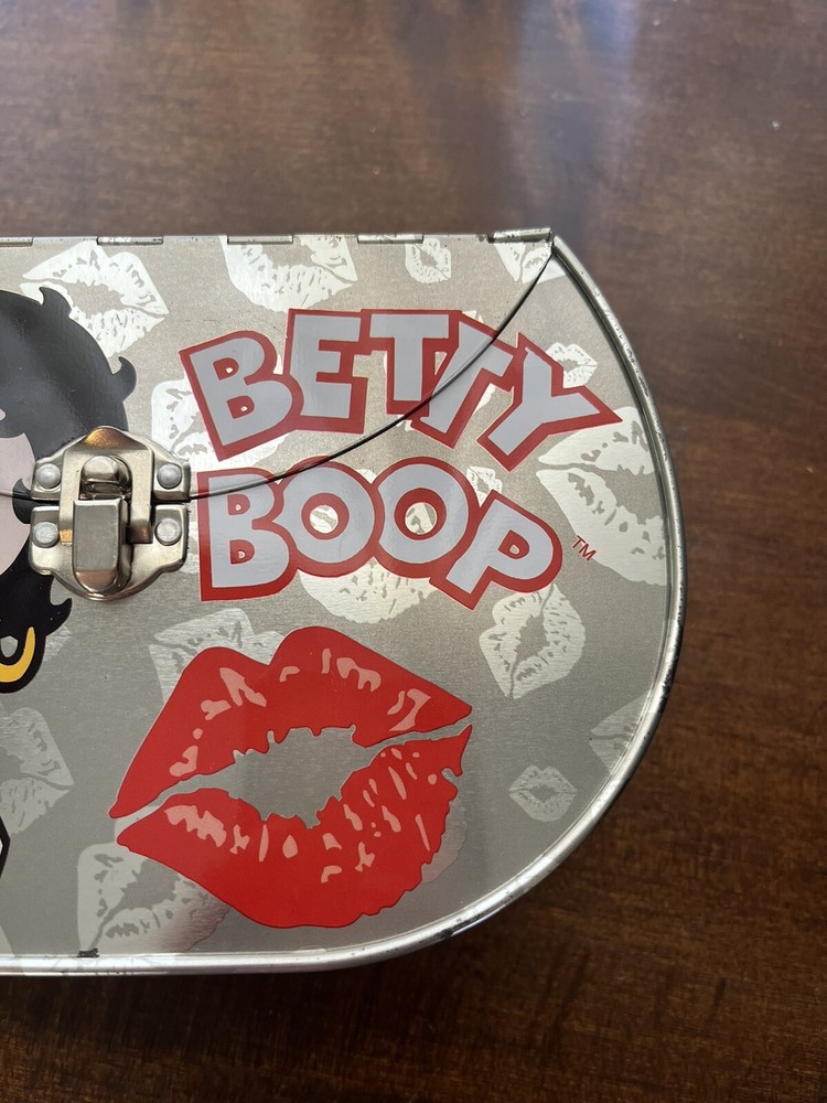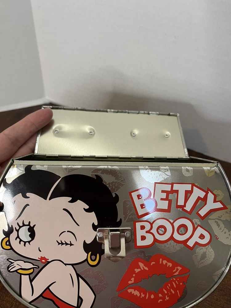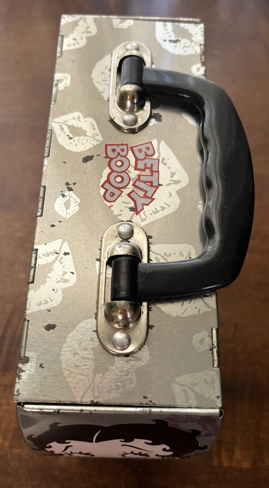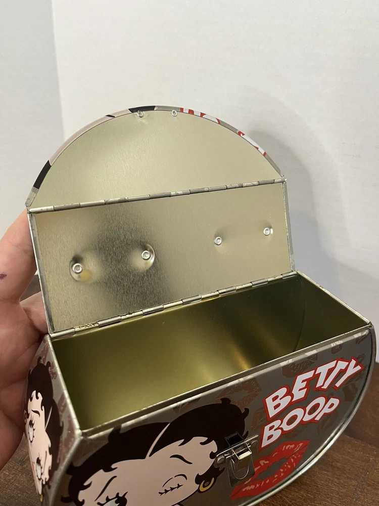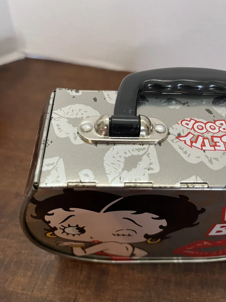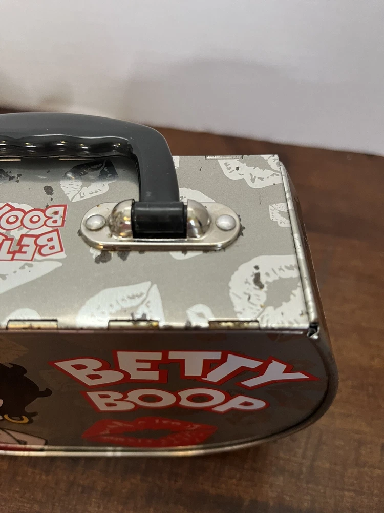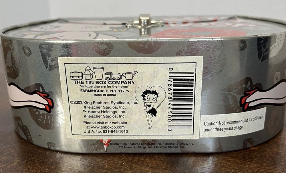 The Tin Box Company of America Betty Boop Tin Purse-Shaped Lunchbox/Trinket Box. 2003 Date on label. 2002 King Features Syndicate, Inc./Fleischer Studios, Inc. on tin. Not recommended for children under three years of age. Made in China. UPC: 078678445003. Spots and paint missing, mainly on the top. Few dings and scratches. See pictures. Please review pictures for condition of item and feel free to contact me with any questions. NAD12A