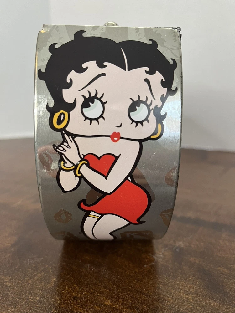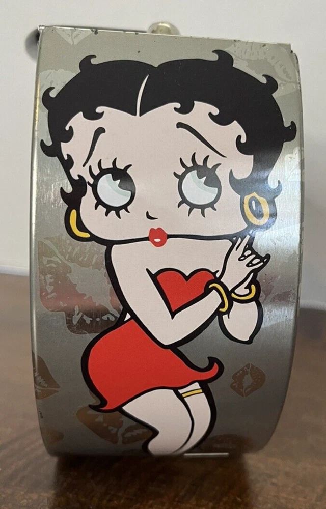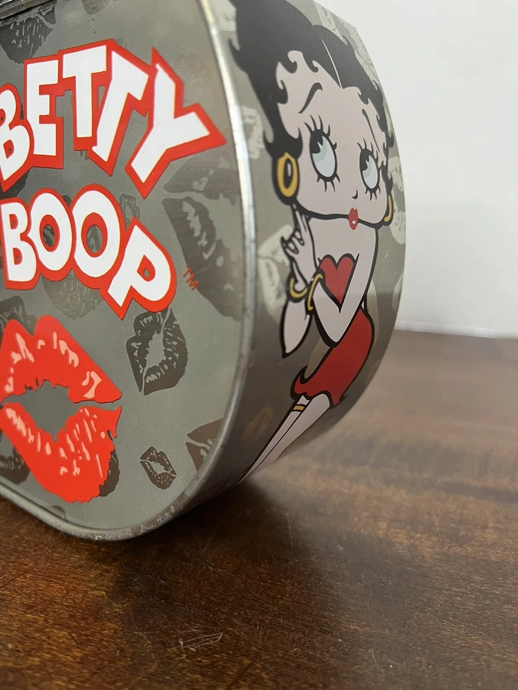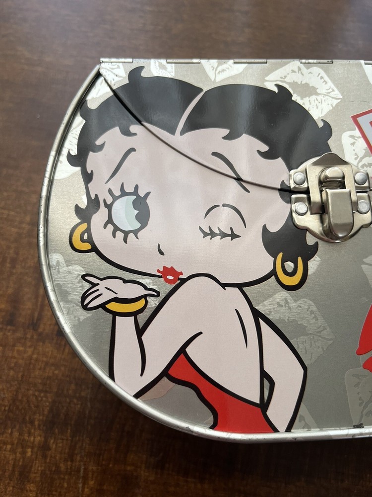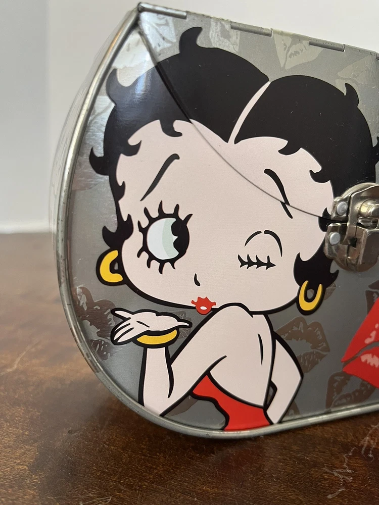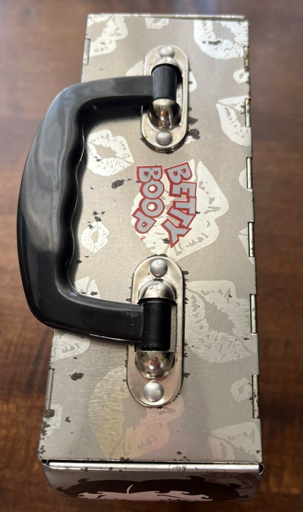The Tin Box Company of America Betty Boop Tin Purse-Shaped Lunchbox/Trinket Box. 2003 Date on label. 2002 King Features Syndicate, Inc./Fleischer Studios, Inc. on tin. Not recommended for children under three years of age. Made in China. UPC: 078678445003. Spots and paint missing, mainly on the top. Few dings and scratches. See pictures. Please review pictures for condition of item and feel free to contact me with any questions. NAD12A