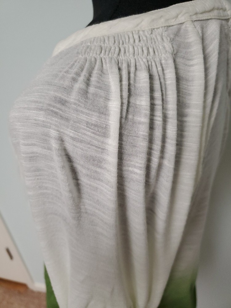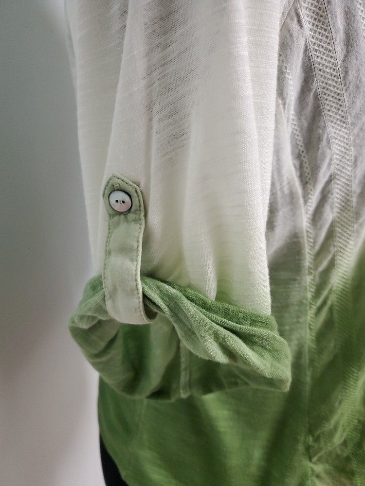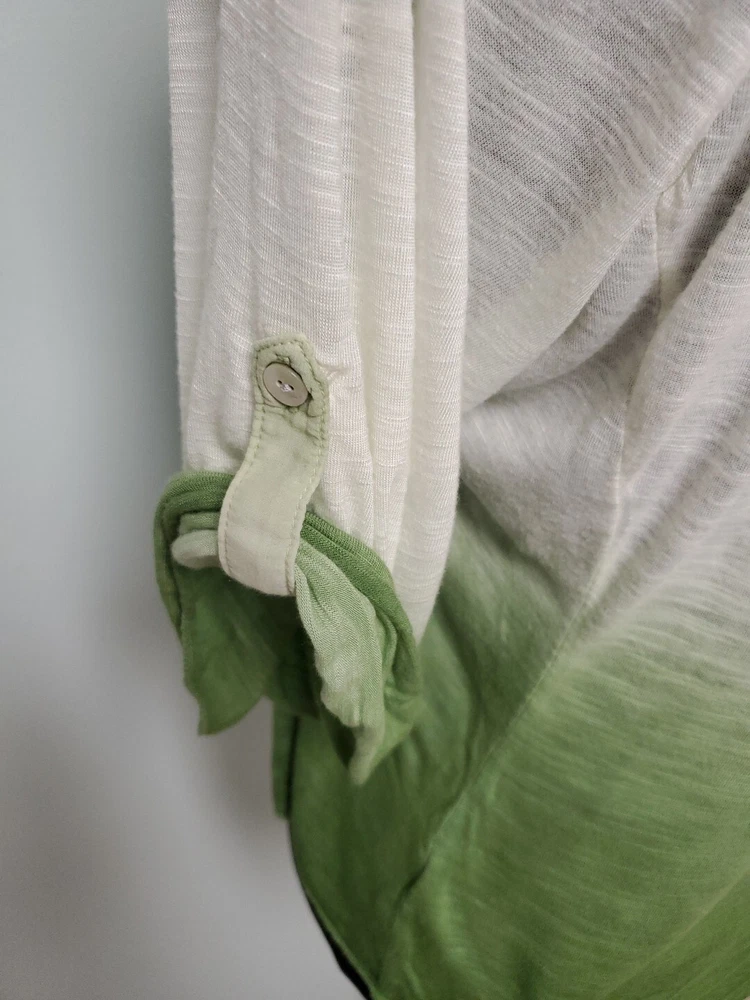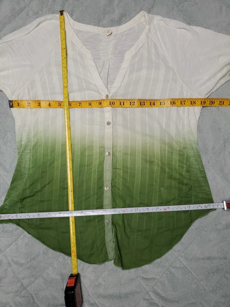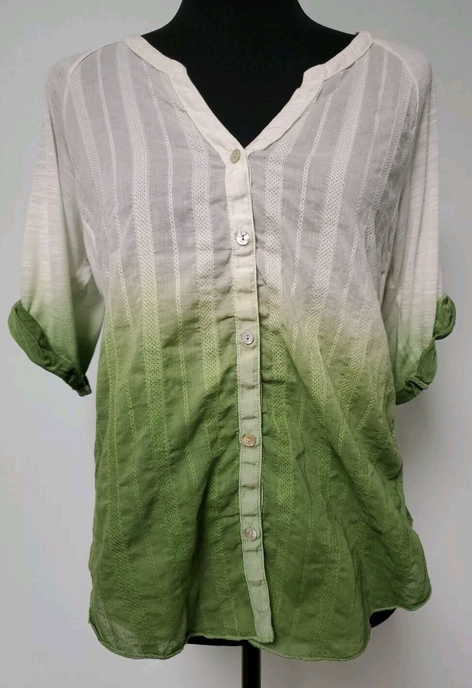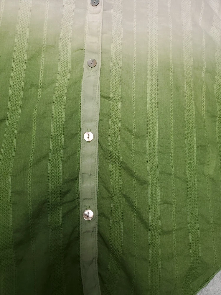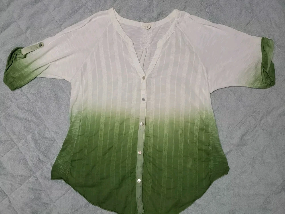 This Tiny brand blouse is a perfect addition to your wardrobe. The dip dye pattern in cream and green hues, along with the round collar and v vent, creates a stylish and unique look. The 3/4 roll tab sleeves and button closure add to its functionality and versatility, making it suitable for travel or casual occasions. The blouse is made of a lightweight cotton blend material with slub knit accents, side panels, and abalone shell color buttons, giving it a semi-sheer and peasant-like feel. It is machine washable and available in size L. With its bohemian and hippie themes, this blouse is perfect for the summer, fall, and spring seasons. Excellent preloved condition with no found issues. Looks great as well unbuttoned with a cotton camisole underneath. Please refer to pictures for measurements and details Comes from a smoke free home