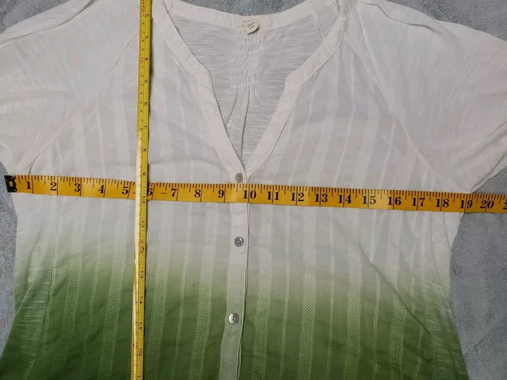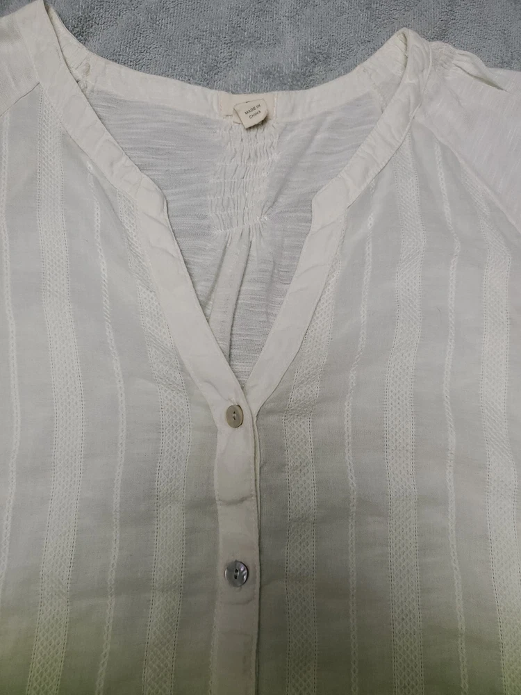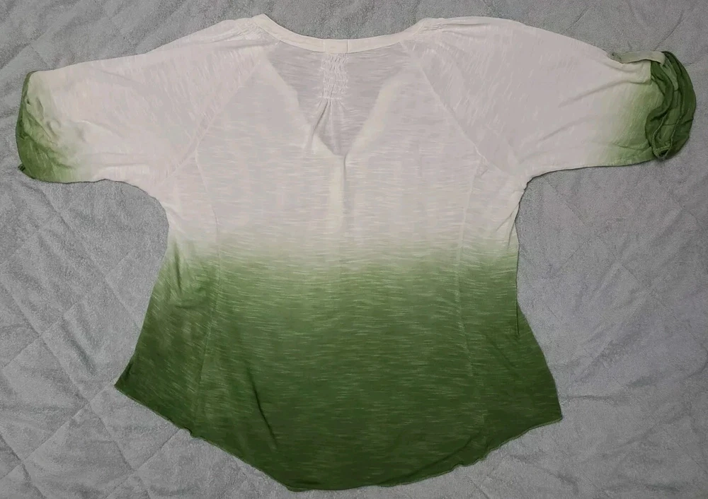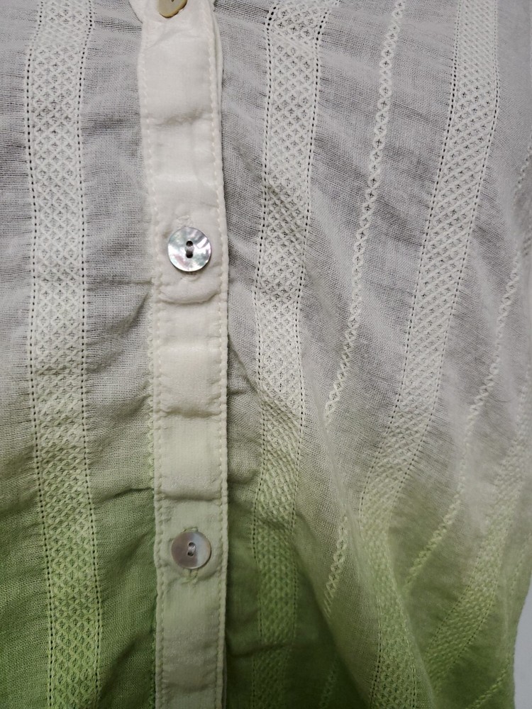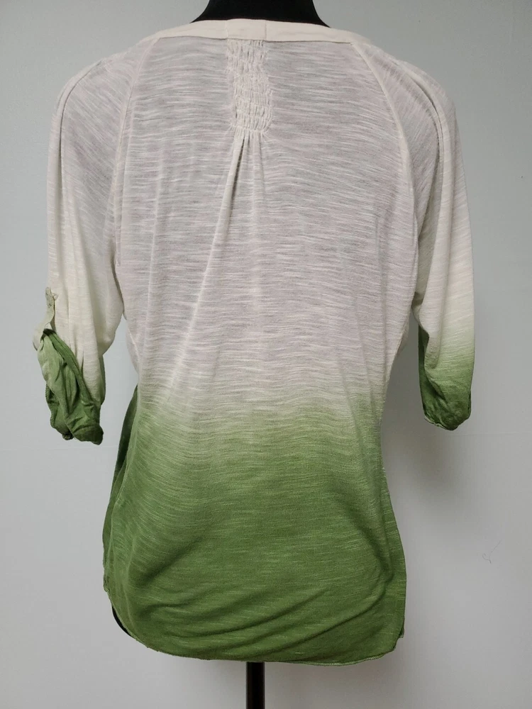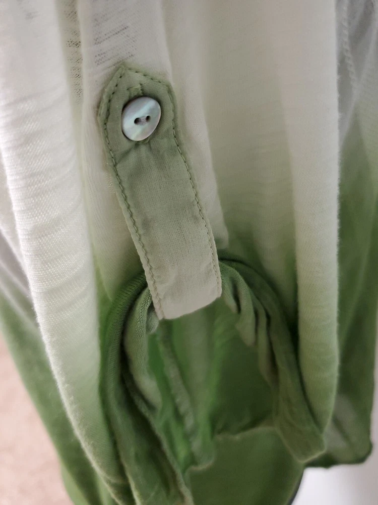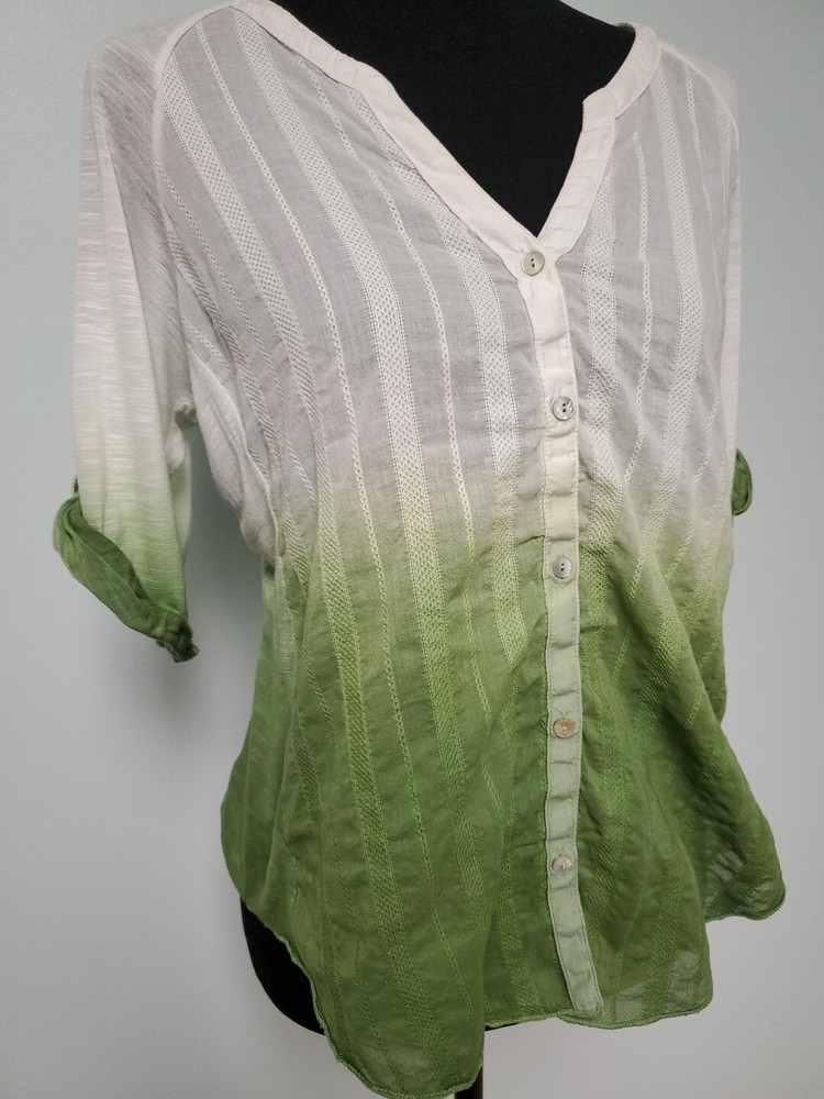 This Tiny brand blouse is a perfect addition to your wardrobe. The dip dye pattern in cream and green hues, along with the round collar and v vent, creates a stylish and unique look. The 3/4 roll tab sleeves and button closure add to its functionality and versatility, making it suitable for travel or casual occasions. The blouse is made of a lightweight cotton blend material with slub knit accents, side panels, and abalone shell color buttons, giving it a semi-sheer and peasant-like feel. It is machine washable and available in size L. With its bohemian and hippie themes, this blouse is perfect for the summer, fall, and spring seasons. Excellent preloved condition with no found issues. Looks great as well unbuttoned with a cotton camisole underneath. Please refer to pictures for measurements and details Comes from a smoke free home