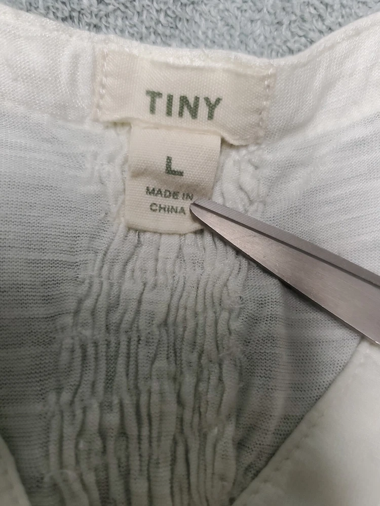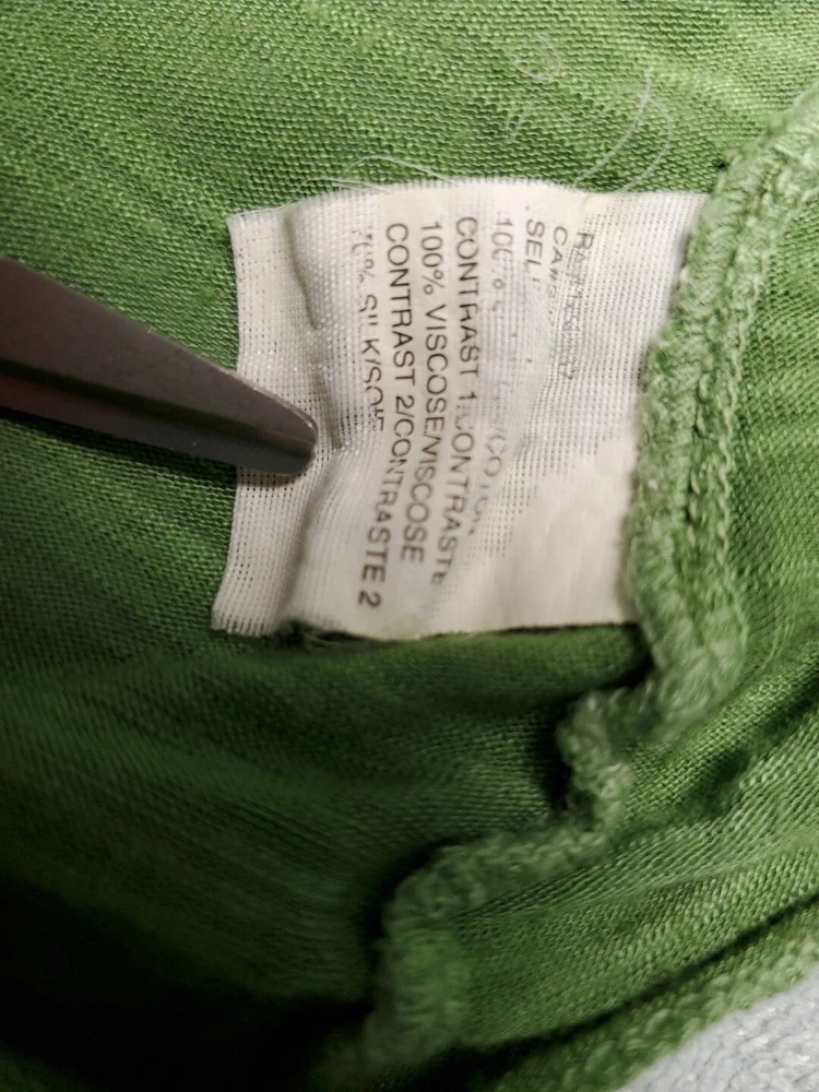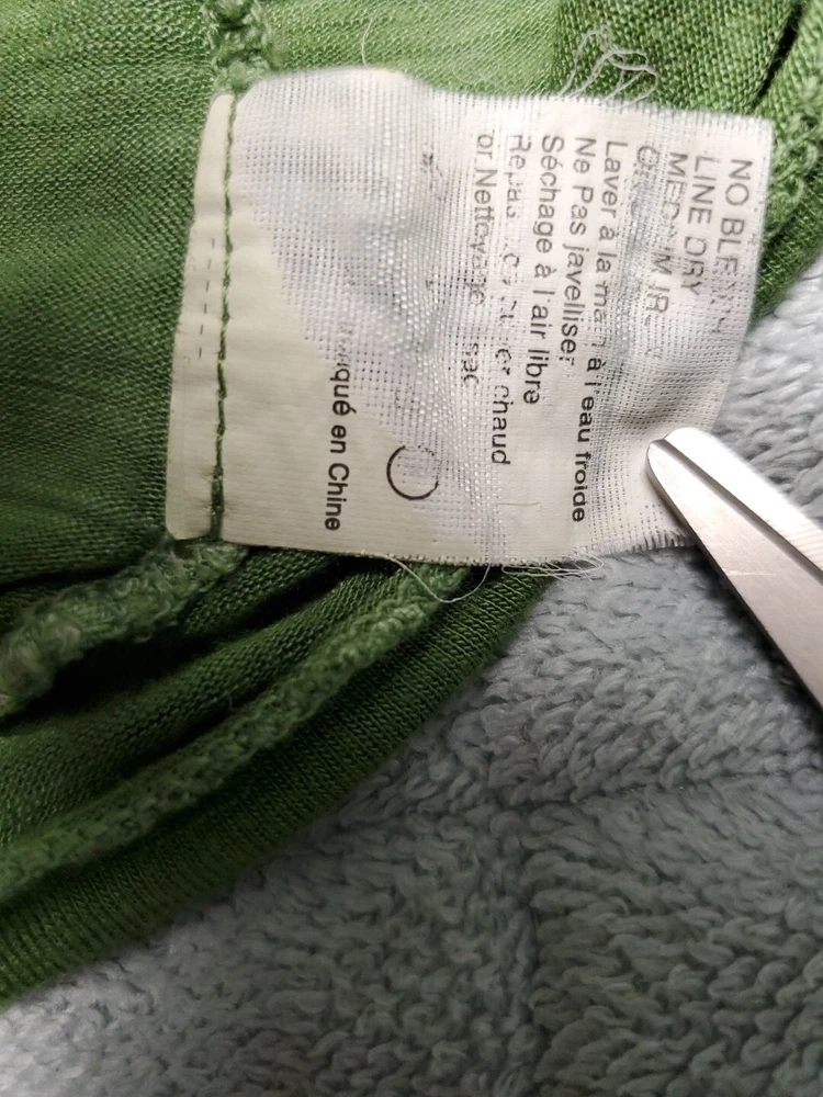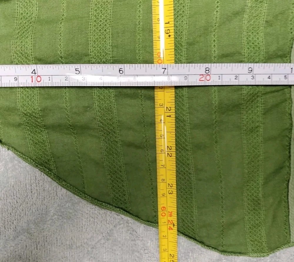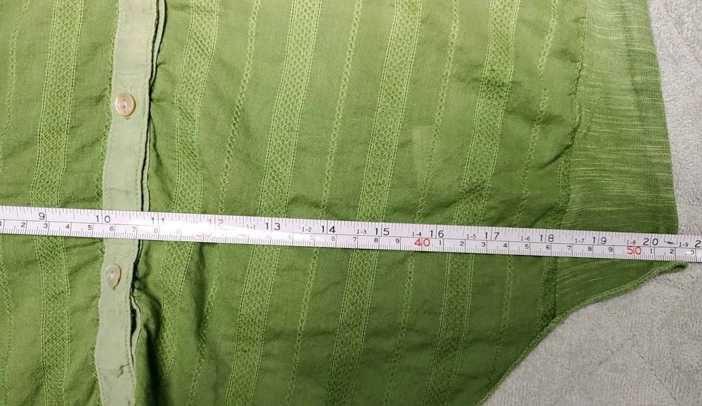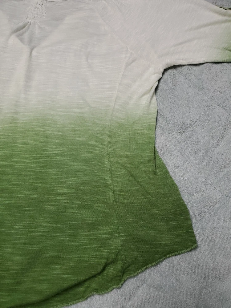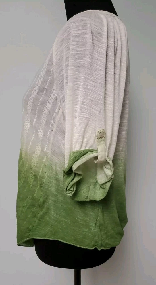 This Tiny brand blouse is a perfect addition to your wardrobe. The dip dye pattern in cream and green hues, along with the round collar and v vent, creates a stylish and unique look. The 3/4 roll tab sleeves and button closure add to its functionality and versatility, making it suitable for travel or casual occasions. The blouse is made of a lightweight cotton blend material with slub knit accents, side panels, and abalone shell color buttons, giving it a semi-sheer and peasant-like feel. It is machine washable and available in size L. With its bohemian and hippie themes, this blouse is perfect for the summer, fall, and spring seasons. Excellent preloved condition with no found issues. Looks great as well unbuttoned with a cotton camisole underneath. Please refer to pictures for measurements and details Comes from a smoke free home