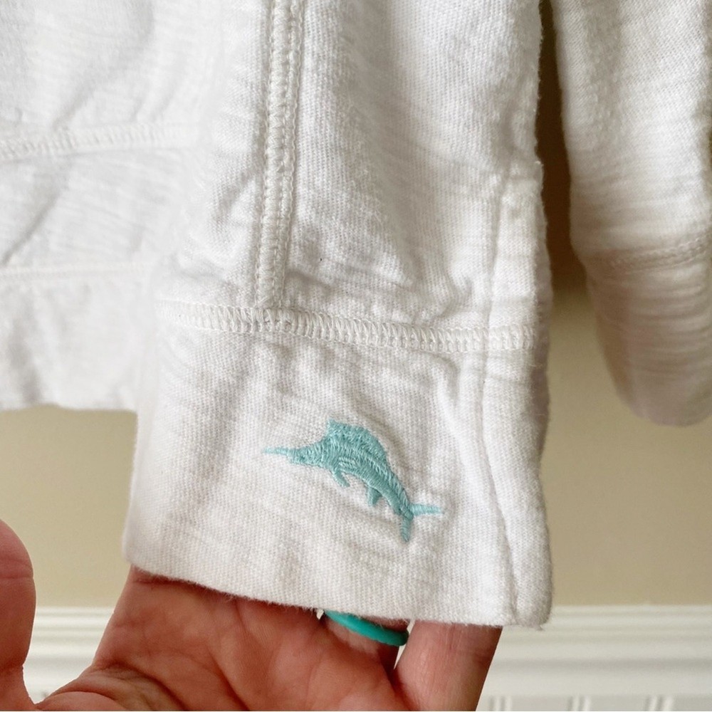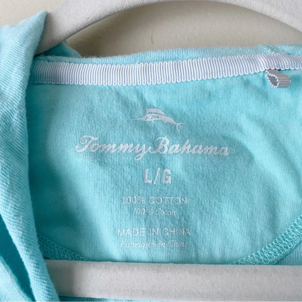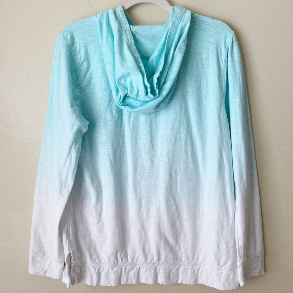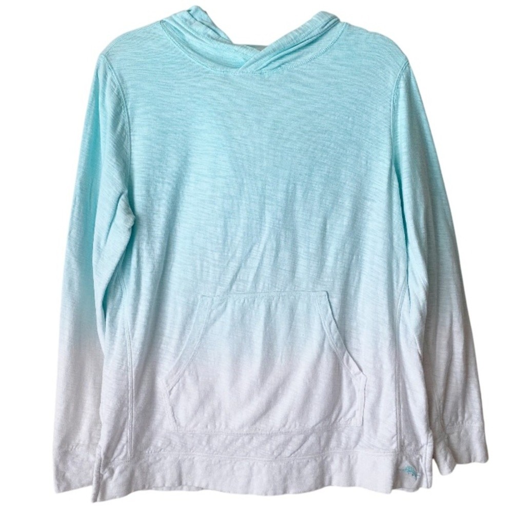 <![CDATA[<div>Brand: Tommy Bahama Features: Knoll dip dye ombre sweatshirt, hooded, lightweight slub cotton, front kangaroo pocket, loose oversized fit, summer, beachy, swim cover up Size: Large Color: Aqua blue, White Condition: Very good pre-owned condition with minor wear, no real flaws Measurements available upon request :) C